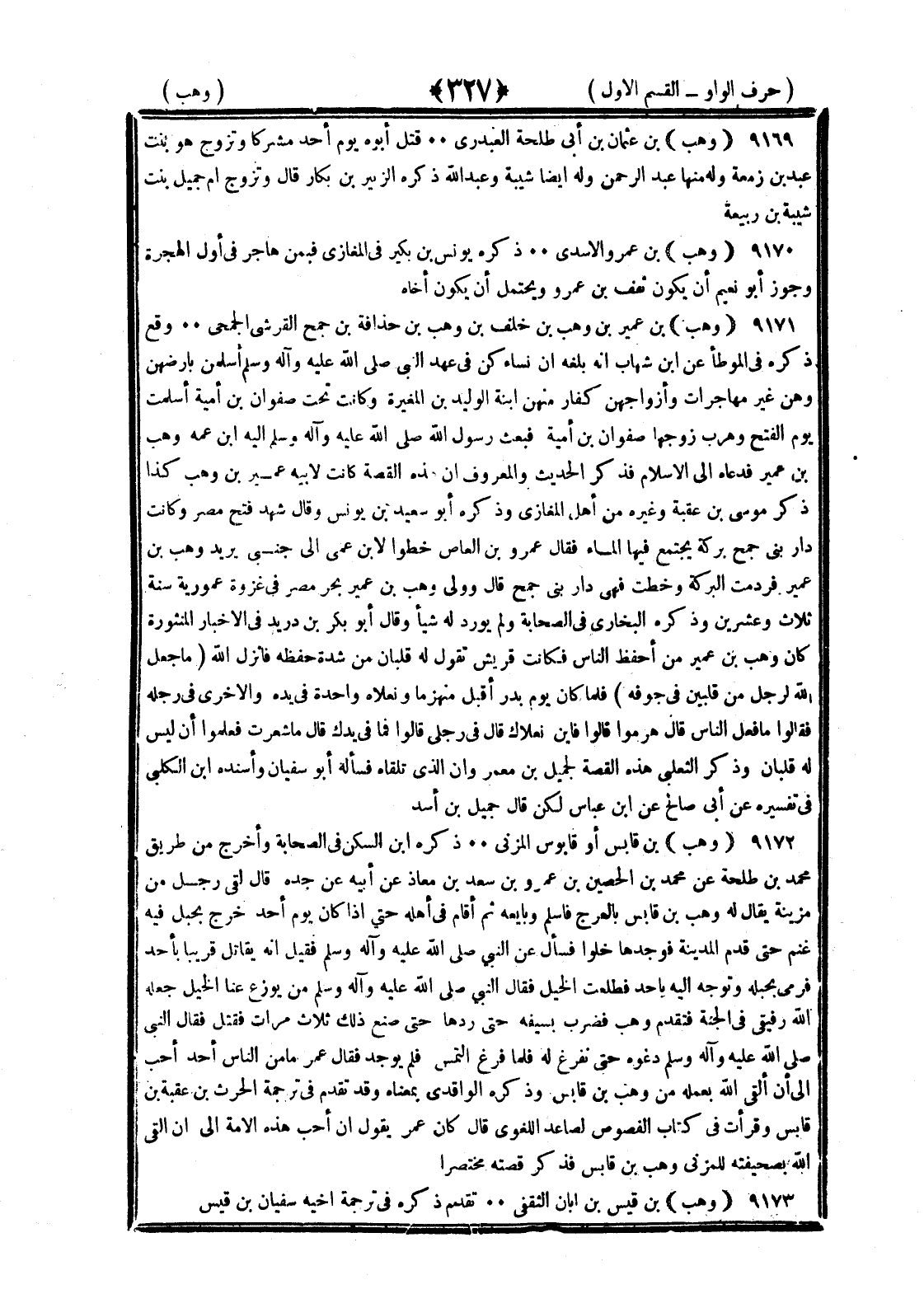 <327> وهب بن عثمان بن أبي طلحة العبدري قتل أبوه يوم أحد مشركا وتزوج هو بنت عبد بن زمعة وله منها عبد الرحمن وله أيضا شيبة وعبد الله وذكره الزبير بن بكار قال وتزوج أم جميل بنت شيبة بن ربيعة وهب بن عمر الأسدي ذكره يونس بن بكير في المغازي فيمن هاجر في أول الهجرة وجوز أبو نعيم أن يكون ثقف بن عمرو ويحتمل أن يكون أخاه وهب بن عمير بن وهب بن خلف بن وهب بن حذافة بن جمح القرشي الجمحي وقع ذكره في الموطأ عن بن شهاب أنه بلغه أن نساء كن في عهد النبي صلى الله عليه وسلم أسلمن بأرضهن وهن غير مهاجرات وأزواجهن كفار منهن ابنة الوليد بن المغيرة وكانت تحت صفوان بن أمية أسلمت يوم الفتح وهرب زوجها صفوان بن أمية فبعث رسول الله صلى الله عليه وسلم اليه بن عمه وهب بن عمير فدعاه الى الإسلام فذكر الحديث والمعروف أن هذه لقصة كانت لأبيه عمير بن وهب كذا ذكره موسى بن عقب وغيره من أهل المغازي وذكره أبو سعيد بن يونس وقال شهد فتح مصر وكانت دار بني جمح بركة يجتمع فيها الماء فقال عمر بن العاص خطوا لابن عمتي الى جنبي يريد وهب بن عمير فردمت البركة وخطت فيه دار بني جمح قال وولى وهب بن عمير بحر مصر في غزوة عمورية سنة ثلاث وعشرين وذكره البخاري في الصحابة ولم يورد له شيئا وقال أبو بكر بن دريد في الأخبار المنثورة كان وهب بن عمير من أحفظ الناس فكانت قريش تقول له قلبان من شدة حفظه فأنزل الله ما جعل الله لرجل من قلبين في جوفه فلما كان يوم بدر أقبل منهزما ونعلاه واحدة في يده والأخرى في رجله فقالوا ما فعل الناس قال هزموا قالوا فأين نعلاك قال في رجلي قالوا فما في يدك قال ما شعرت فعلموا أن ليس له قلبان وذكر الثعلبي هذه القصة لجميل بن معمر وأن الذي تلقاه فسأله أبو سفيان وأسنده بن الكلبي في تفسيره عن أبي صالح عن بن عباس لكن قال جميل بن أسد وهب بن قابس أو قابوس المزني ذكره بن السكن في الصحابة وأخرج من طريق محمد بن طلحة عن محمد بن الحصين بن عمرو بن سعد بن معاذ عن أبيه عن جده قال لقي رجل من مزينة يقال له وهب بن قابس بالعرج فأسلم وبايعه ثم أقام في أهله حتى إذا كان يوم أحد خرج بحبل فيه غنم حتى قدم المدينة فوجدها خلوا فسأل عن النبي صلى الله عليه وسلم فقيل انه يقاتل قريبا بأحد فرمى بحبله وتوجه اليه بأحد فطلعت الخيل فقال النبي صلى الله عليه وسلم من يوزع عنا الخيل جعله الله رفيقي في الجنة فتقدم وهب فضرب بسيفه حتى صنع ذلك ثلاث مرات فقتل فقال النبي صلى الله عليه وسلم دعوه حتى نفرغ له فلما فرغ التمس فلم يوجد فقال عمر ما من الناس أحد أحب الي أن ألقى الله بعمله من وهب بن قابس وذكره الواقدي بمعناه وقد تقدم في ترجمة الحارث بن عقبة بن قابش وقرأت في كتاب الفصوص لصاعد اللغوي قال كان عمر يقول ان أحب هذه الأمة الي أن ألقى الله بصحيفته للمزني وهب بن قابس فذكر قصته مختصرا وهب بن قيس بن أبان الثقفي تقدم ذكره في ترجمة أخيه سفيان بن قيس §