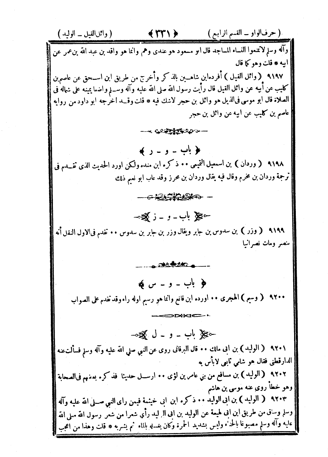 <331> لا تمنعوا النساء المساجد قال أبو مسعود هو عندي وهم وانما هو واقد بن عبد الله بن عمر عن أبيه قلت وهو كما قال وائل القيل أفرده بن شاهين بالذكر وأخرج من طريق بن إسحاق عن عاصم بن كليب عن أبيه عن وائل القيل قال رأيت رسول الله صلى الله عليه وسلم واضعا يمينه على شماله في الصلاة قال أبو موسى في الذيل هو وائل بن حجر لا شك فيه قلت وقد أخرجه أبو داود من رواية عاصم بن كليب عن أبيه عن وائل بن حجر الواو بعدها الراء وردان بن إسماعيل التميمي ذكره بن منده ولكن أورد الحديث الذي تقدم في وردان بن محرز وقال فيه يقال له وردان بن محرز وقد عاب أبو نعيم ذلك وزر بن سدوس بن جابر ويقال وزر بن جابر بن سدوس تقدم في الأول النقل أنه تنصر ومات نصرانيا الواو بعدها السين واللام وسيم الهجري أورده بن قانع وانما هو رسيم أوله راء وقد تقدم على الصواب الوليد بن أبي مالك قال البرقاني روى عن النبي صلى الله عليه وسلم فسألت عنه الدارقطني فقال هو شامي تابعي لا بأس به الوليد بن مسافع من بني عامر بن لؤي أرسل حديثا فذكره بعضهم في الصحابة وهو خطأ روى عنه موسى بن هاشم الوليد بن أبي الوليد ذكره بن أبي خيثمة فيمن رأى النبي صلى الله عليه وسلم وساق من طريق بن لهيعة عن الوليد بن أبي الوليد رأى شعرا من شعر رسول صلى الله عليه وسلم مصبوغا بالحناء وليس بشديد الحمرة وكان يغسله بالماء ثم يشربه قلت وهذا من أعجب §