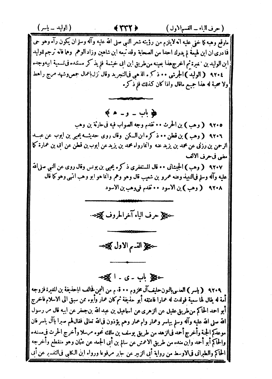<332> ما وقع وهبه خفي عليه أنه لا يلزم من رؤيته شعر النبي صلى الله عليه وسلم أن يكون رآه وهو حي أفما درى أن بن لهيعة لم يدرك أحدا من الصحابة وقد تبعه بن شاهين وزاد الوهم وهما فإنه ترجم للوليد بن الوليد بن المغيرة ثم أخرج هذا بعينه من طريق بن أبي خيثمة فلم يذكر مستنده في تسمية أبيه وجده الوليد الجرشي ذكره الذهبي في التجريد وقال نزل بأعمال حمص وشهد مرج راهط ولا صحبة له هذا جميع ما قال وإذا كان كذلك فلم ذكره الواو بعدها الهاء وهب بن الحارث تقدم وجه الصواب فيه في حارثة بن وهب وهب بن قطن ذكره بن السكن وقال روى حديثه يحيى بن أيوب عن عبد الرحمن بن زربى عن محمد بن يزيد عنه وانما رواه محمد بن يزيد عن أيوب بن قطن عن أبي بن عمارة كما مضى في حرف الألف وهب الجيشاني قال المستغفري ذكره يحيى بن يونس وقال روى عن النبي صلى الله عليه وسلم في النبيذ وعنه عمرو بن شعيب قال وهو وهم وانما هو أبو وهب انتهى وهو كما قال وهيب بن الأسود تقدم في وهب بن الأسود