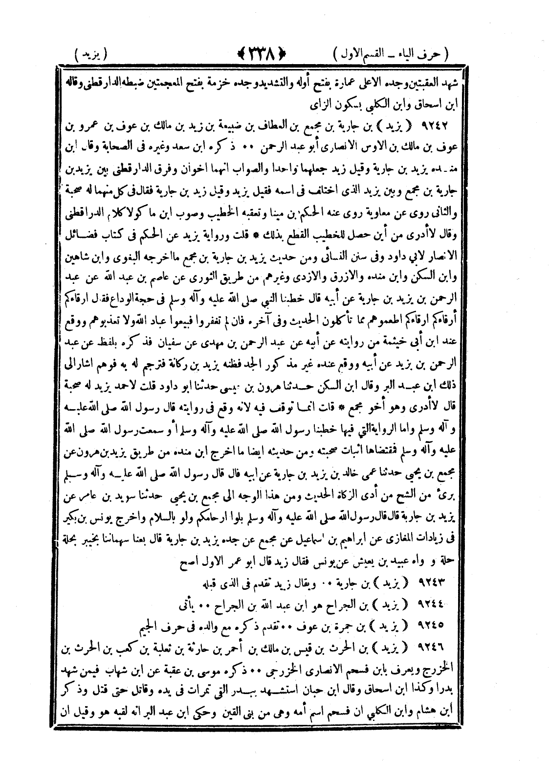 <338> شهد العقبتين وجده الأعلى عمارة بفتح أوله والتشديد وجده خزمة بفتح المعجمتين ضبطه الدارقطني وقاله بن إسحاق وابن الكلبي بسكون الزاي يزيد بن جارية بن مجمع بن العطاف بن ضبيعة بن زيد بن مالك بن عوف بن عمرو بن عوف بن مالك بن الأوس الأنصاري أبو عبد الرحمن ذكره بن سعد وغيره في الصحابة وقال بن منده يزيد بن جارية وقيل زيد جعلهما واحدا والصواب أنهما أخوان وفرق الدارقطني بين يزيد بن جارية بن مجمع وبين يزيد الذي اختلف في اسمه فقيل يزيد وقيل زيد بن جارية فقال في كل منهما له صحبة والثاني روى عن معاوية روى عنه الحكم بن مينا وتعقبه الخطيب وصوب بن ماكولا كلام الدارقطني وقال لا أدري من أي حصل للخطيب القطع بذلك قلت ورواية يزيد عن الحكم في كتاب فضائل الأنصار لأبي داود وفي سنن النسائي ومن حديث يزيد بن جارية بن مجمع ما أخرجه البغوي وابن شاهي وابن السكن وابن منده والأزرق والأزدي وغيرهم من طريق الثوري عن عاصم بن عبد الله عن عبد الرحمن بن يزيد بن جارية عن أبيه قال خطبنا النبي صلى الله عليه وسلم في حجة الوداع فقال أرقاءكم أرقاءكم أطعموهم مما تأكلون الحديث وفي آخره فان لم تغفروا فبيعوا عباد الله ولا تعذبوهم ووقع عند بن أبي خيثمة من روايته عن أبيه عن عبدلرحمن بن مهدي عن سفيان فذكره بلفظ عن عبد الرحمن بن يزيد عن أبيه ووقع عنده غير مذكور الجد فظنه يزيد بن ركانة فترجم له به فوهم أشار الى ذلك بن عبد البر وقال بن السكن حدثنا هارون بن عيسى حدثنا أبو داود قلت لأحمد يزيد له صحبة قال لا أدري وهو أخو مجمع قلت إنما توقف فيه لأنه وقع في روايته قال رسول الله صلى الله عليه وسلم وأما الرواية التي فيها خطبنا رسول الله صلى الله عليه وسلم أو سمعت رسول الله صلى الله عليه وسلم فمقتضاها اثبات صحبته ومن حديثه أيضا ما أخرج بن منده من طريق يزيد بن هارون عن مجمع بن يحيى حدثنا عمي خالد بن يزيد بن جارية عن أبيه قال قال رسول الله صلى الله عليه وسلم برئ من الشح من أدى الزكاة الحديث ومن هذا الوجه الى مجمع بن يحيى حدثنا سويد بن عامر عن يزيد بن جارية قال قال رسول الله صلى الله عليه وسلم بلوا أرحامكم ولو بالسلام وأخرج يونس بن بكير في زيادات المغازي عن إبراهيم بن إسماعيل عن مجمع عن جده يزيد بن جارية قال بعنا سهامنا بخيبر بحلة حلة ورواه عبيد بن يعيش عن يونس فقال زيد قال أبو عمر الأول أصح يزيد بن جارية ويقال زيد تقدم في الذي قبله يزيد بن الجراح هو بن عبد الله الجراح يأتي يزيد بن جمرة بن عوف تقدم ذكره مع والده في حرف الجيم يزيد بن الحارث بن قيس بن مالك بن أحمر بن حارثة بن ثعلبة بن كعب بن الحارث بن الخزرج ويعرف بابن فسحم الأنصاري الخزرجي ذكره موسى بن عقبة عن بن شهاب فيمن شهد بدرا وكذا بن إسحاق وقال بن حبان استشهد ببدر ألقى تمرات في يده وقاتل حت قتل وذكر بن هشام وابن الكلبي أن فسحم اسم أمه وهي من بني القين وحكى بن عبد البر انه لقبه هو وقيل ان §