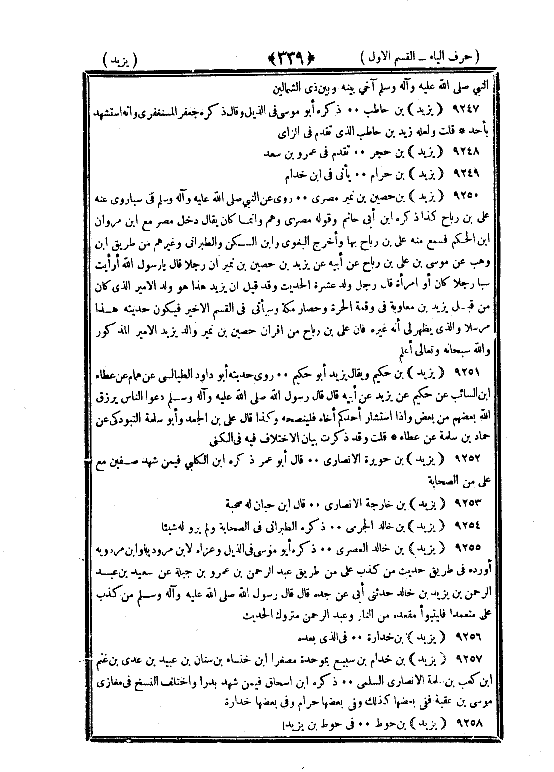 <339> النبي صلى الله عليه وسلم آخى بينه وبين ذي الشمالين يزيد بن حاطب ذكره أبو موسى في الذيل وقال ذكره جعفر المستغفري وأنه استشهد بأحد قلت ولعله زيد بن حاطب الذي تقدم في الزاي يزيد بن حجر تقدم في عمرو بن سعد يزيد بن حرام يأتي في بن خدام يزيد بن حصين بن نمير مصري روى عن النبي صلى الله عليه وسلم في سبأ روى عنه علي بن رباح كذا ذكره بن أبي حاتم وقوله مصري وهم وانما كان يقال دخل مصر مع بن مروان بن الحكم فسمع منه علي بن رباح بها وأخرج البغوي وابن السكن والطبراني وغيرهم من طريق بن وهب عن موسى بن علي بن رباح عن أبيه عن يزيد بن حصين بن نمير أن رجلا قال يا رسول الله أرأيت سبأ رجلا كان أو امرأة قال رجل ولد عشرة الحديث وقد قيل ان يزيدا هذا هو ولد الأمير الذي كان من قبل يزيد بن معاوية في وقعة الحرة وحصار مكة وسيأتي في القسم الأخير فيكون حديثه هذا مرسلا والذي يظهر لي أنه غيره فان علي بن رباح من أقران حصين بن نمير والد يزيد الأمير المذكور والله سبحانه وتعالى أعلم يزيد بن حكيم ويقال يزيد أبو حكيم روى حديثه أبو داود الطيالسي عن همام عن عطاء بن السائب عن حكيم بن يزيد عن أبيه قال قال رسول الله صلى الله عليه وسلم دعوا الناس يرزق الله بعضهم من بعض وإذا استشار أحدكم أخاه فلينصحه وكذا قال علي بن الجعد وأبو سلمة التبوذكي عن حماد بن سلمة عن عطاء قلت وقد ذكرت بيان الاختلاف فيه في الكنى يزيد بن حويرث الأنصاري قال أبو عمر ذكره بن الكلبي فيمن شهد صفين مع علي من الصحابة يزيد بن خارجة الأنصاري قال بن حبان له صحبة يزيد بن خالد الجرمي ذكره الطبراني في الصحابة ولم يرو له شيئا يزيد بن خالد العصري ذكره أبو موسى في الذيل وعزاه لابن مردويه وابن مردويه أورده في طريق حديث من كذب علي من طريق عبد الرحمن بن عمرو بن جبلة عن سعيد بن عبد الرحمن بن يزيد بن خالد حدثني أبي عن جده قال قال رسول الله صلى الله عليه وسلم من كذب علي متعمدا فليتبوأ مقعده من النار وعبد الرحمن متروك الحديث يزيد بن خدارة في الذي بعده يزيد بن خدام بن سبيع بموحدة مصغرا بن خنساء بن سنان بن عبيد بن عدي بن غنم بن كعب بن سلمة الأنصاري السلمي ذكره بن إسحاق فيمن شهد بدرا واختلفت النسخ في مغازي موسى بن عقبة ففي بعضها كذلك وفي بعضها حرام وفي بعضها خدارة يزيد بن حوط في حوط بن زيد §