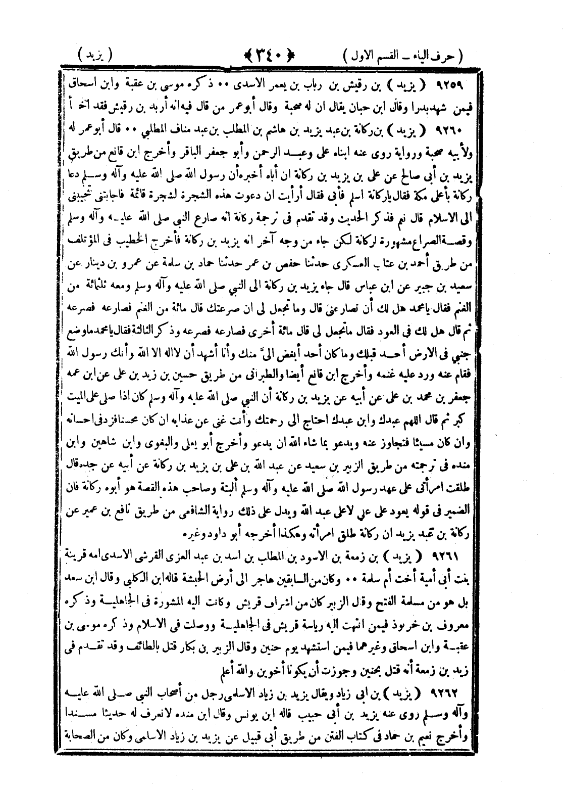 <340> يزيد بن رقيش بن رئاب بن يعمر الأسدي ذكره موسى بن عقبة وابن إسحاق فيمن شهد بدرا وقال بن حبان يقال ان له صحبة وقال أبو عمر من قال فيه انه أربد بن رقيش فقد أخطأ يزيد بن ركانة بن عبد يزيد بن هاشم بن المطلب بن عبد مناف المطلبي قال أبو عمر له ولأبيه صحبة ورواية روى عنه ابناه علي وعبد الرحمن وأبو جعفر الباقر وأخرج بن قانع من طريق يريد بن أبي صالح عن علي بن يزيد بن ركانة أن أباه أخبره أن رسول الله صلى الله عليه وسلم دعا ركانة بأعلى مكة فقال يا ركانة أسلم فأبى فقال أرأيت ان دعوت هذه الشجرة لشجرة قائمة فأجابتني تجيبني الى الإسلام قال نعم فذكر الحديث وقد تقدم في ترجمة ركانة أنه صارع النبي صلى الله عليه وسلم وقصة الصراع مشهورة لركانة لكن جاء من وجه آخر أنه يزيد بن ركانة فأخرج الخطيب في المؤتلف من طريق أحمد بن عتاب العسكري حدثنا حفص بن عمر حدثنا حماد بن سلمة عن عمرو بن دينار عن سعيد بن جبير عن بن عباس قال جاء يزيد بن ركانة الى النبي صلى الله عليه وسلم ومعه ثلاثمائة من الغنم فقال يا محمد هل لك أن تصارعني قال وما تجعل لي ان صرعتك قال مائة من الغنم فصارعه فصرعه ثم قال هل لك في العود فقال ما تجعل لي قال مائة أخرى فصارعه فصرعه وذكر الثالثة فقال يا محمد ما وضع جنبي في الأرض أحد قبلك وما كان أحد أبعض الي منك وأنا أشهد أن لا اله الا الله وأنك رسول الله فقام عنه ورد عليه غنمه وأخرج بن قانع أيضا والطبراني من طريق حسين بن زيد بن علي عن بن عمه جعفر بن محمد بن علي عن أبيه عن يزيد بن ركانة أن النبي صلى الله عليه وسلم كان إذا صلى على الميت كبر ثم قال اللهم عبدك وابن عبدك احتاج الى رحمتك وأنت غني عن عذابه ان كان محسنا فزد في إحسانه وان كان مسيئا فتجاوز عنه ويدعو بما شاء أن يدعو وأخرج أبو يعلى والبغوي وابن شاهي وابن منده في ترجمته من طريق الزبير بن سعيد عن عبد الله بن علي بن يزيد بن ركانة عن أبيه عن جده قال طلقت امرأتي على عهد رسول الله صلى الله عليه وسلم البتة وصاحب هذه القصة هو أبوه ركانة فان الضمير في قوله يعود على علي لا على عبد الله ويدل على ذلك رواية الشافعي من طريق نافع بن عجير عن ركانة بن عبد يزيد أن ركانة طلق امرأته وهكذا أخرجه أبو داود وغيره يزيد بن زمعة بن الأسود بن المطلب بن أسد بن عبد العزى القرشي الأسدي أمه قريبة بنت أبي أمية أخت أم سلمة وكان من السابقين هاجر الى أرض الحبشة قاله بن الكلبي وقال بن سعد بل هو من مسلمة الفتح وقال الزبير كان من أشراف قريش وكانت اليه المشورة في الجاهلية وذكره معروف بن خربوذ فيمن انتهت اليه رياسة قريش في الجاهلية ووصلت في الإسلام وذكره موسى بن عقبة وابن إسحاق وغيرهما فيمن استشهد يوم حنين وقال الزبير بن بكار قتل بالطائف وقد تقدم في زيد بن زمعة أنه قتل بحنين وجوزت أن يكونا أخوين والله أعلم يزيد بن أبي زياد ويقال يزيد بن زياد الأسلمي رجل من أصحاب النبي صلى الله عليه وسلم روى عنه يزيد بن أبي حبيب قاله بن يونس وقال بن منده لا نعرف له حديثا مسندا وأخرج نعيم بن حماد في كتاب الفتن من طريق أبي قبيل يزيد بن زياد الأسلمي وكان من الصحابة §