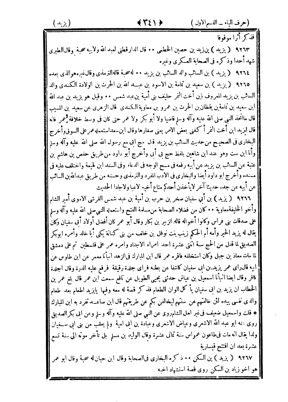 <341> فذكر أثرا موقوفا يزيد بن زيد بن حصين الخطمي قال الدارقطني لعبد الله ولأبيه صحبة وقال الطبري شهد أحدا وذكره في الصحابة العسكري وغيره يزيد بن السائب والد السائب بن يزيد له صحبة وقال الترمذي وغيره وهو الذي بعده يزيد بن سعيد بن ثمامة بن الأسود بن عبد الله بن الحارث بن الولادة الكندي والد السائب بن يزيد المعروف بابن أخت النمر حليف بني أمية بن عبد شمس وقيل هو يزيد بن عبد الله بن سعيد ثمامة بن شيطان بن الحارث بن عمرو بن معاوية الكندي قال الزهري عن سعيد بن المسيب قال ما اتخذ النبي صلى الله عليه وسلم قاضيا ولا أبو بكر ولا عمر حتى كان في وسط خلافة عمر فإنه قال ليزيد بن أخت النمر أكفني بعض الأمر يعني صغائرها وقال بن سعد استعمله عمر على السوق وأخرج البخاري في الصحيح من حديث السائب بن يزيد قال حج أبي مع رسول الله صلى الله عليه وسلم وأنا بن ست وهو عند بن شاهين بلفظ حج بي أبي وأخرج أبو داود من طريق حفص بن هاشم بن عتبة عن السائب بن يزيد عن أبيه رفعه في مسح الوجه في الدعاء وفي المسند بن لهيعة واختلف عليه في مسنده وأخرج أبو داود أيضا والبخاري في الأدب المفرد والترمذي وحسنه من طريق عبد الله بن السائب عن أبيه عن جده حديثا آخر ولا يأخذن أحدكم متاع أخي لاعبا ولا جادا الحديث يزيد بن أبي سفيان صخر بن حرب بن أمية بن عبد شمس القرشي الأموي أمير الشام وأخو الخليفة معاوية كان من فضلاء الصحابة من مسلمة الفتح واستعمله النبي صلى الله عليه وسلم على صدقات بني فراس وكانوا أخواله قاله بن بكار وقال أبو عمر كان أفضل أولاد أبي سفيان وكان يقال له يزيد الخير وأمه أم الحكم زينب بنت نوفل بن خلف من بني كنانة يكنى أبا خالد وأمره أبو بكر الصديق لما قفل من الحج سنة اثنتي عشرة أحد أمراء الأجناد وأمره عمر على فلسطين ثم على دمشق لما مات معاذ بن جبل وكان استخلفه فأقره عمر قال بن مبارك في الزهد أنبأنا معمر عن بن طاوس عن أبيه قال رأى عمر يزيد بن أبي سفيان كاشفا عن بطنه فرأى جلدة رقيقة فرفع عليه الدرة وقال أجلدة كافر وقال أيضا أنبأنا إسماعيل بن عياش حدثني يحيى الطويل عن نافع سمعت بن عمر قال بلغ عمر بن الخطاب أن يزيد بن أبي سفيان يأكل ألوان الطعام فذكر قصة له معه وفيها يا يزيد أطعام بعد طعام والذي نفسي بيده لئن خالفتم عن سننهم ليخالفن بكم عن طريقتهم قال بن صاعد تفرد به بن المبارك قلت وإسماعيل ضعيف في غير أهل الشام روى عن النبي صلى الله عليه وسلم وعن أبي بكر الصديق روى عنه أبو عبد الله الأشعري وعياض الأشعري وعبادة بن أبي أمية ولم يعقب من بيت أبي سفيان ولدا يقال انه مات في طاعون عمواس سنة ثمان عشرة وقال الوليد بن مسلم بل تأخر موته الى سنة تسع عشرة بعد أن افتتح قيسارية يزيد بن السكن ذكره البخاري في الصحابة وقال بن حبان له صحبة وقال أبو عمر هو أخو زياد بن السكن روى قصة استشهاد أخيه §