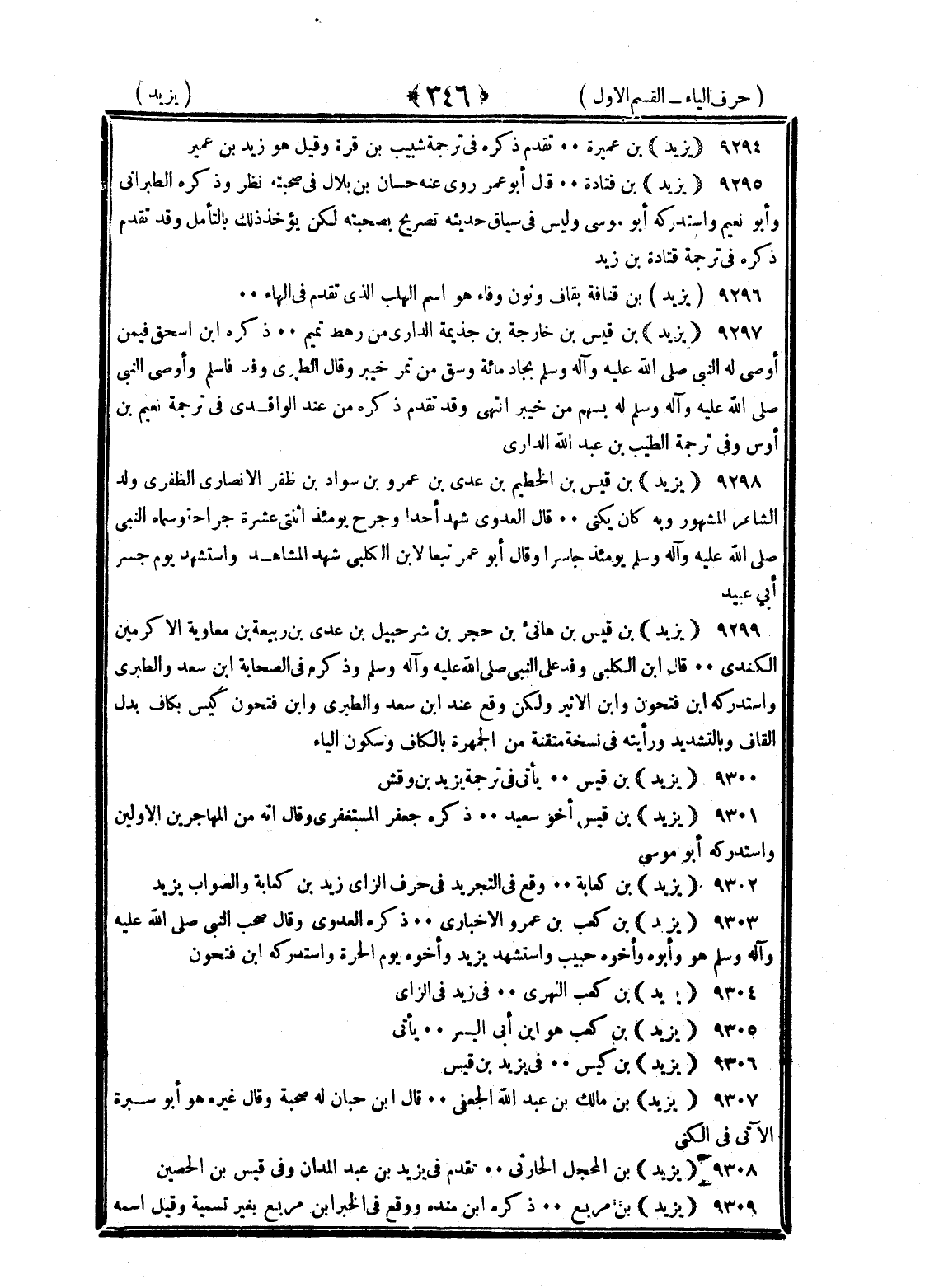 <346> يزيد بن عميرة تقدم ذكره في ترجمة شبيب بن قرة وقيل هو زيد بن عمير يزيد بن قتادة قال أبو عمر روى عنه حسان بن بلال في صحبته نظر وذكره الطبراني وأبو نعيم واستدركه أبو موسى وليس في سياق حديثه تصريح صحبته لكن يؤخذ ذلك بالتأمل وقد تقدم ذكره في ترجمة قتادة بن زيد يزيد بن قنافة بقاف ونون وفاء هو اسم الهلب الذي تقدم في الهاء يزيد بن قيس بن خارجة بن جذيمة الداري من رهط تميم ذكره بن إسحاق فيمن أوصى له النبي صلى الله عليه وسلم بجاد مائة وسق من تمر خيبر وقال الطبري وفد فأسلم وأوصى النبي صلى الله عليه وسلم له بسهم من خيبر انتهى وقد تقدم ذكره عند الواقدي في ترجمة نعيم بن أوس وفي ترجمة الطيب بن عبد الله الداري يزيد بن قيس بن الخطيم بن عدي بن عمرو بن سواد بن ظفر الأنصاري الظفري ولد الشاعر المشهور وبه كان يكنى قال العدوي شهد أحدا وجرح يومئذ اثنتي عشرة جراحة وسماه النبي صلى الله عليه وسلم يومئذ حاسرا وقال أبو عمر تبعا لابن الكلبي شهد المشاهد واستشهد يوم جسر أبي عبيد يزيد بن قيس بن هانئ بن حجر بن شرحبيل بن عدي بن ربيعة بن معاوية الأكرمين الكندي قال بن الكلبي وفد على النبي صلى الله عليه وسلم وذكره في الصحابة بن سعد والطبري واستدركه بن فتحون وابن الأثير ولكن وقع عند بن سعد والطبري وابن فتحون كيس بكاف بدل القاف وبالتشديد ورأيته في نسخة متقنة من الجمهرة بالكاف وسكون الياء يزيد بن قيس يأتي في ترجمة يزيد بن وقش يزيد بن قيس أخو سعيد ذكره جعفر المستغفري وقاله انه من المهاجرين الأولين واستدركه أبو موسى يزيد بن كعابة وقع في التجريد في حرف الزاي زيد بن كعابة والصواب يزيد يزيد بن كعب بن عمرو الأنصاري ذكره العدوي وقال صحب النبي صلى الله عليه وسلم هو وأبوه وأخوه حبيب واستشهد يزيد وأخوه يوم الحرة واستدركه بن فتحون يزيد بن كعب البهزي في زيد في الزاي يزيد بن كعب هو بن أبي اليسر يأتي يزيد بن كيس في يزيد بن قيس يزيد بن مالك بن عبد الله الجعفي قال بن حبان له صحبة وقال غيره هو أبو سبرة الآتي في الكنى يزيد بن المحجل الحارثي تقدم في يزيد بن عبد المدان وفي قيس بن الحصين يزيد بن مربع ذكره بن منده ووقع في الخبر بن مربع بغير تسمية وقيل اسمه §
