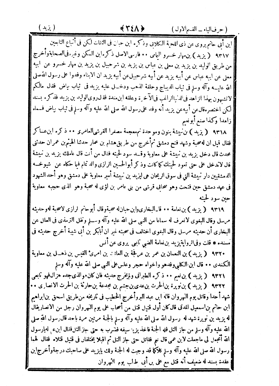 <348> بن أبي حاتم يروى عن ذي اللحية الكلابي وذكره بن حبان في الثقات لكن في أتباع التابعين يزيد بن مهار خسرو اليمامي فارسي الأصل ذكره بن السكن وغيره في الصحابة وأخرج من طريق الوليد بن يزيد بن معلى بن عباس بن يزيد بن شرحبيل بن يزيد بن مهار خسرو عن أبيه معلى عن أبيه عباس عن أبيه يزيد عن أبيه شرحبيل عن أبيه يزيد أن الأبناء وفدوا على رسول الله صلى الله عليه وسلم في ثياب الديباج وحلق الذهب ودخل عليه يزيد في ثياب بياض فقال مالكم لا تشبهون بهذا الزاهد في الدنيا الراغب في الآخرة وعلقه بن منده فقال روى الوليد بن يزيد فذكره بسنده لكن اختصره قال عن أبيه عن يزيد أنه وفد على رسول الله صلى الله عليه وسلم في بياض فسماه زاهدا وكذا صنع أبو نعيم يزيد بن نبيشة بنون وموحدة ثم معجمة مصغرا القرشي العامري ذكره بن عساكر فقال قيل ان له صحبة وشهد فتح دمشق ثم أخرج من طريق هشام بن عمار حدثنا الهيثم بن عمران حدثني محدث قال دخل يزيد بن نبيشة على معاوية وقد سود لحيته فقال من أنت قال عاملك يزيد بن نبيشة قال لا تدخل علي حتى تهود لحيتك كما كانت وذكر أبو الحسين الرازي والد تمام فيما حكاه عن شيوخه الدمشقيين دار نبيشة التي في سوق الريحان هي ليزيد بن نبيشة أمير معاوية على دمشق وهو أحد الشهود في عهد دمشق حين فتحت وهو صحابي قرشي من بني عامر بن لؤي له صحبة وهو الذي حجبه معاوية حين سود لحيته يزيد بن نعامة قال البخاري وابن حبان له صحبة وقال أبو حاتم الرازي لا صحبة له وحديثه مرسل وقال البغوي لا نعرف له سماعا من النبي صلى الله عليه وسلم ونقل الترمذي في العلل عن البخاري أن حديثه مرسل وقال البغوي اختلف في صحبته غير أن أبا بكر بن أبي شيبة أخرج حديثه في مسنده قلت وفي الرواة يزيد بن نعامة الضبي تابعي يروى عن أنس يزيد بن النعمان بن عمرو بن عرفجة بن العاتك بن امرئ القيس بن ذهل بن معاوية الكندي قال بن الكلبي وفد هو وأخواه حجر وعلس على النبي صلى الله عليه وسلم يزيد بن نعيم ذكره الطبراني ولم يخرج حديثه فان كان هو الذي جده هزال فهو تابعي يزيد بن نويرة بن الحارث بن عدي بن جشم بن مجدعة بن حارثة بن الحارث الأنصاري شهد أحدا وقاتل يوم النهروان قاله بن عبد البر وأخرج الخطيب في تاريخه من طريق إسحاق بن إبراهيم بن حاتم بن إسماعيل المدني قال كان أول قتيل قتل من أصحاب علي يوم النهروان رجل من الأنصار يقال له يزيد بن نويرة شهد له رسول الله صلى الله عليه وسلم بالجنة مرتين مرة بأحد قال رسول الله صلى الله عليه وسلم من جاز التل فله الجنة فأخذ يزيد سيفه فضرب حتى جاز التل فقال بن عم له يا رسول الله أتجعل لي ما جعلت لابن عمي قال نعم فقاتل حتى جاز التل ثم أقبلا يختلفان في قتيل قتلاه فقال لهما رسول الله صلى الله عليه وسلم كلاكما قد وجبت له الجنة ولك يا يزيد على صاحبك درجة وأخرج بن عقدة بسند له ضعيف أنه قتل مع علي بن أبي طالب يوم النهروان §