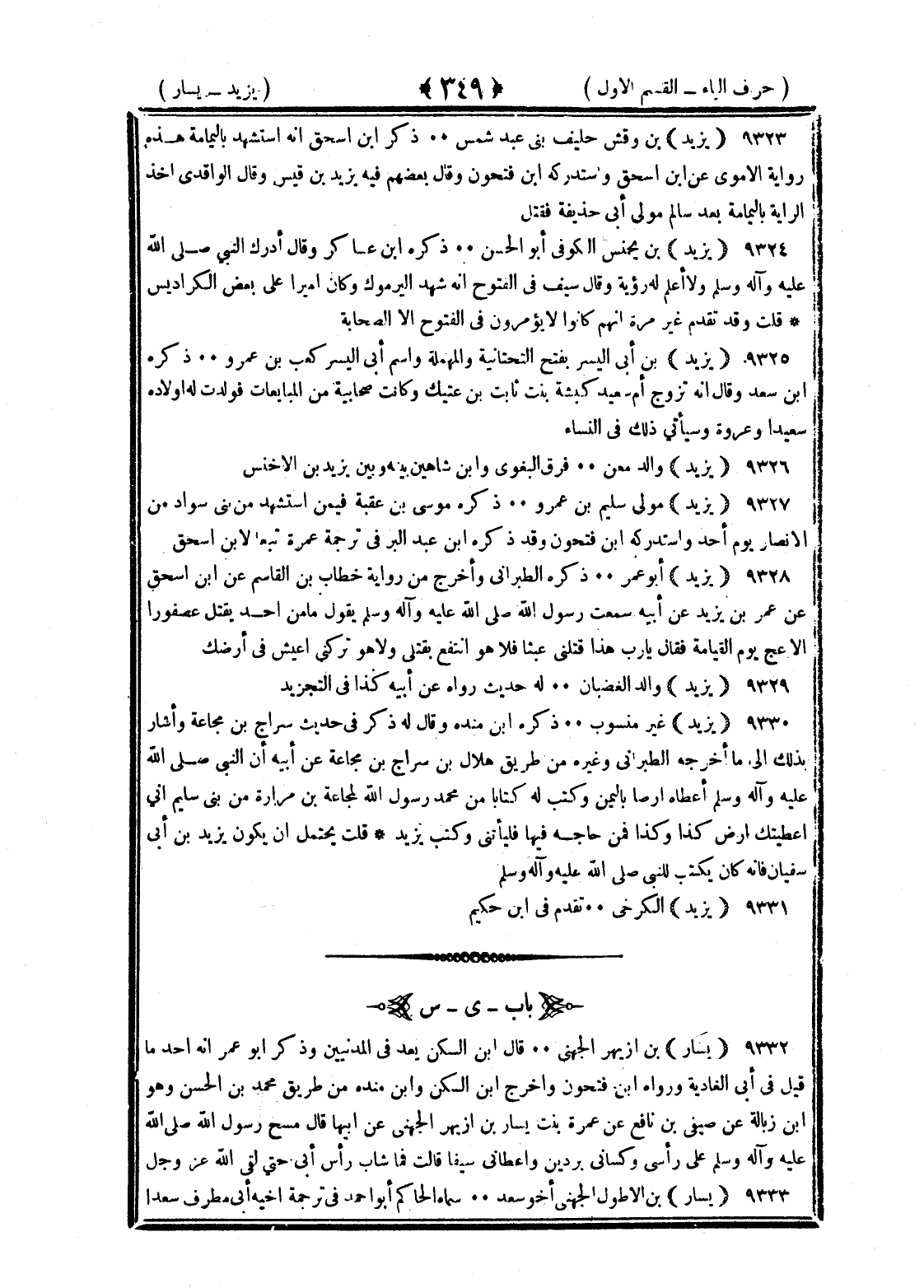 <349> يزيد بن وقش حليف بني عبد شمس ذكر بن إسحاق أنه استشهد باليمامة هذه رواية الأموي عن بن إسحاق واستدركه بن فتحون وقال بعضهم فيه يزيد بن قيس وقال الواقدي أخذ الراية باليمامة بعد سالم مولى أبي حذيفة فقتل يزيد بن يحنس الكوفي أبو الحسن ذكره بن عساكر وقال أدرك النبي صلى الله عليه وسلم ولا أعلم له رؤية وقال سيف في الفتوح انه شهد اليرموك وكان أميرا على بعض الكراديس قلت وقد تقدم غير مرة أنهم كانوا لا يؤمرون في الفتوح الا الصحابة يزيد بن أبي اليسر بفتح التحتانية والمهملة واسم أبي اليسر كعب بن عمرو ذكره بن سعد وقال انه كزوج أم سعيد كبشة بنت ثابت بن عتيك وكانت صحابية من المبايعات فولدت له أولاده سعيدا وعروة وسيأتي ذلك في النساء يزيد والد معن فرق البغوي وابن شاهين بينه وبين يزيد بن الأخنس يزيد مولى سليم بن عمرو ذكره موسى بن عقبة فيمن استشهد من بني سواد من الأنصار يوم أحد واستدركه بن فتحون وقد ذكره بن عبد البر في ترجمة عنترة تبعا لابن إسحاق يزيد أبو عمر ذكره الطبراني وأخرج من رواية خطاب بن القاسم عن بن إسحاق عن عمر بن يزيد عن أبيه سمعت رسول الله صلى الله عليه وسلم يقول ما من أحد يقتل عصفورا الا عج يوم القيامة فقال يا رب هذا قتلني عبثا فلا هو انتفع بقتلي ولا هو تركني أعيش في أرضك يزيد والد الغضبان له حديث رواه عن أبيه كذا في التجريد يزيد غير منسوب ذكره بن منده وقال له ذكر في حديث سراج بن مجاعة وأشار بذلك الى ما أخرجه الطبراني وغيره من طريق هلال بن سراج بن مجاعة عن أبيه أن النبي صلى الله عليه وسلم أعطاه أرضا باليمن وكتب له كتابا من محمد رسول الله لمجاعة بن مرارة من بني سليم اني أعطيتك أرض كذا وكذا فمن حاجه فيها فليأتني وكتب يزيد قلت يحتمل أن يكون يزيد بن أبي سفيان فإنه كان يكتب للنبي صلى الله عليه وسلم يزيد الكرخي تقدم في بن حكيم الياء بعدها السين يسار بن أزيهر الجهني قال بن السكن يعد في المدنيين وذكر أبو عمر أنه أحد ما قيل في أبي الغادية ورده بن فتحون وأخرج بن السكن وابن منده من طريق محمد بن الحسن وهو بن زبالة عن صيفي بن نافع عن عمرة بنت يسار بن أزيهر الجهني عن أبيها قال مسح رسول الله صلى الله عليه وسلم على رأسي وكساني بردين وأعطاني سيفا قالت فما شاب رأس أبي حتى لقي الله عز وجل يسار بن الأطول الجهني أبو سعيد سماه الحاكم أبو احمد في ترجمة أخيه أبي مطرف سعدا §