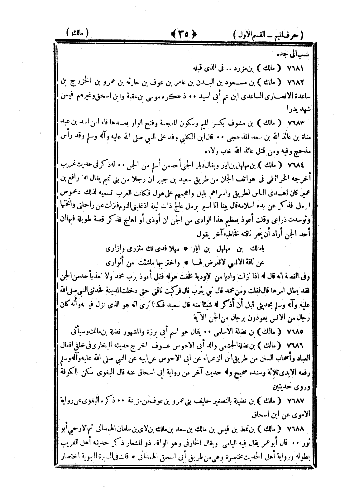 <35> نسب الى جده مالك بن مزرد في الذي قبله مالك بن مسعود بن البدن بن عامر بن عوف بن حارثة بن عمرو بن الخزرج بن ساعدة الأنصاري الساعدي بن عم أبي اسيد ذكره موسى بن عقبة وابن إسحاق وغيرهم فيمن شهد بدرا مالك بن مشوف بكسر الميم وسكون المعجمة وفتح الواو بعدها فاء بن أسد بن عبد مناة بن عائذ الله بن سعد المذحجي قال بن الكلبي وفد على النبي صلى الله عليه وسلم وقد رأس مذحج وفيه ومن قبل عبد الله جاءت ولادة مذحج النبي صلى الله عليه وسلم مالك بن مهلهل بن ايار ويقال دثار الجني أحد من اسلم من الجن له ذكر في حديث غريب أخرجه الخرائطي في هواتف الجان من طريق سعيد بن جبير ان رجلا من بني تميم يقال له رافع بن عمير كان أهدى الناس لطريق واسراهم بليل واهجمهم على هول فكانت العرب تسميه لذلك دعموس الرمل فذكر عن بدء إسلامه قال بينا انا اسير برمل عالج ذات ليلة إذا غلبني النوم فنزلت عن راحلتي وانختها وتوسدت ذراعي وقلت أعوذ بعظيم هذا الوادي من الجن ان اوذي أو اهاج فذكر قصة طويلة فيها ان أحد الجن أراد ان ينحر ناقته فخاطبه آخر يقول يا مالك بن مهلهل بن ايار مهلا فدى لك مئزري وازاري عن ناقة الانسي لا تعرض لها واختر بها ما شئت من اثواري وفي القصة انه قال له إذا نزلت واديا من الأودية فخفت هله فقل اعود برب محمد ولا تعذ بأحد من الجن فقد بطل امرها قال فقلت ومن محمد قال نبي يثرب قال فركبت ناقتي حتى دخلت المدينة فحدثني النبي صلى الله عليه وسلم بحديثي قبل ان اذكر له شيئا منه قال سعيد فكنا نرى انه هو الذي نزل فيه وانه كان رجال من الإنس يعوذون برجال من الجن الآية مالك بن نضلة الأسلمي يقال هو اسم أبي برزة والمشهور نضلة بن مالك وسيأتي مالك بن نضلة الجشمي والد أبي الأحوص عوف اخرج حديثه البخاري في خلف افعال العباد وأصحاب السنن من طريق أبي الزهراء عن أبي الأحوص عن أبيه عن النبي صلى الله عليه وسلم رفعه الأيدي ثلاثة وسنده صحيح وله حديث آخر من رواية أبي إسحاق عنه قال البغوي سكن الكوفة وروى حديثين مالك بن نضيلة بالتصغير حليف بني عمرو بن عوف من مزينة ذكره البغوي من رواية الأموي عن بن إسحاق مالك بن نمط بن قيس بن مالك بن سعد بن مالك بن لأي بن سلمان الهمداني ثم الارحبي أبو ثور قال أبو عمر يقال فيه اليامي ويقال الخارفي وهو الوافد ذو المشعار ذكر حديثه أهل الغريب بطوله ورواية أهل الحديث مختصرة وهي من طريق أبي إسحاق الهمداني قلت هو في السيرة النبوية اختصار §