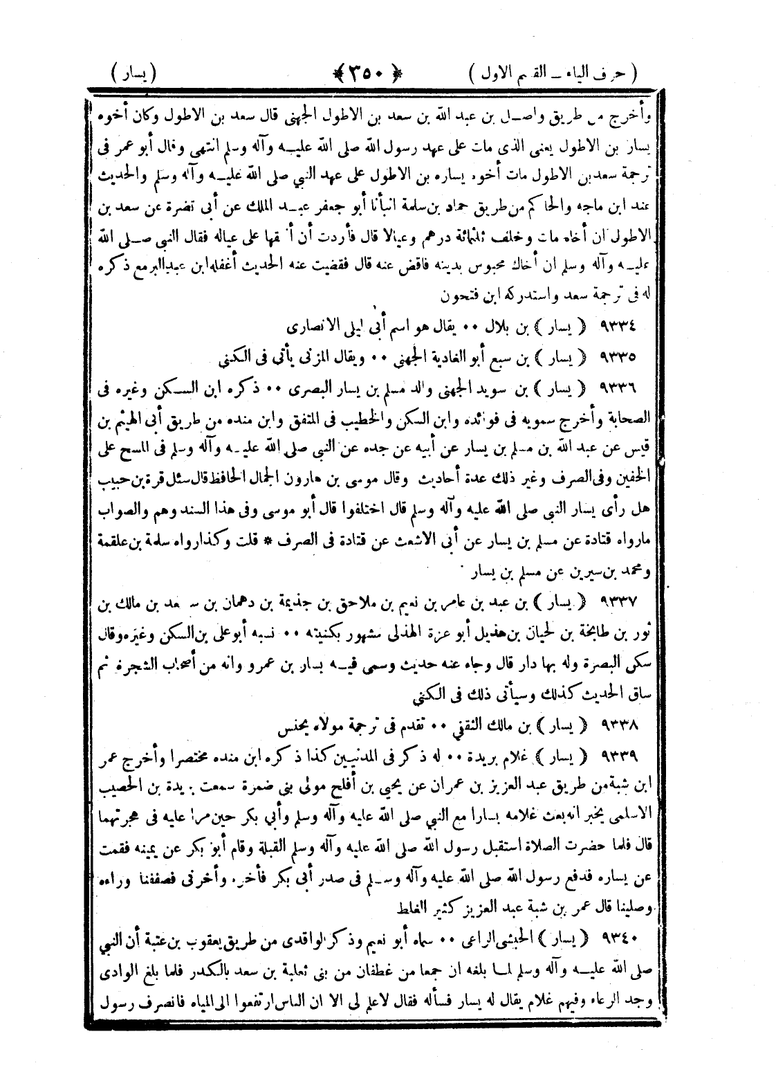<350> وأخرج من طريق واصل بن عبد الله بن بدر بن واصل بن عبد الله بن سعد بن الأطول الجهني قال سعد بن الأطول وكان أخوه يسار بن الأطول يعني الذي مات على عهد رسول الله صلى الله عليه وسلم انتهى وقال أبو عمر في ترجمة سعد بن الأطول مات أخوه يسار بن الأطول على عهد النبي صلى الله عليه وسلم والحديث عند بن ماجة والحاكم من طريق حماد بن سلمة أنبأنا أبو جعفر عبد الملك عن أبي نضرة عن سعد بن الأطول أن أخاه مات وخلف ثلاثمائة درهم وعيالا قال فأردت أن أنفقها على عيال له فقال النبي صلى الله عليه وسلم ان أخاك محبوس بدينه فاقض عنه قال فقضيت عنه الحديث أغفله بن عبد البر مع ذكره له في ترجمة سعد واستدركه بن فتحون يسار بن بلال يقال هو اسم أبي ليلى الأنصاري يسار بن سبع أبو الغادية الجهني ويقال المزني يأتي في الكنى يسار بن سويد الجهني والد مسلم بن يسار البصري ذكره بن السكن وغيره في الصحابة وأخرج سمويه في فوائده وابن السكن والخطيب في المتفق وابن منده من طريق أبي الهيثم بن قيس عن عبد الله بن مسلم بن يسار عن أبيه عن جده عن النبي صلى الله عليه وسلم في المسح على الخفين وفي الصرف وغير ذلك عدة أحاديث وقال موسى بن هارون الحمال الحافظ قال سئل قرة بن حبيب هل رأى يسار النبي صلى الله عليه وسلم قال اختلفوا قال أبو موسى وفي هذا السند وهم والصواب ما رواه قتادة عن مسلم بن يسار عن أبي الأشعث عن قتادة في الصرف قلت وكذا رواه سلمة بن علقمة ومحمد بن سيرين عن مسلم بن يسار يسار بن عبد بن عامر بن نعيم بن ملاحق بن جذيمة بن دهمان بن سعد بن مالك بن ثور بن طابخة بن لحيان بن هذيل أبو عزة الهذلي مشهور بكنيته نسبه أبو علي بن السكن وغيره وقال سكن البصرة وله بها دار قال وجاء عنه حديث وسمى فيه يسار بن عمرو وأنه من أصحاب الشجرة ثم ساق الحديث كذلك وسيأتي ذلك في الكنى يسار بن مالك الثقفي تقدم في ترجمة مولاه يحنس يسار غلام بريدة له ذكر في المدنيين كذا ذكره بن منده مختصرا وأخرج عمر بن شبة من طريق عبد العزيز بن عمران عن يحيى بن أفلح مولى بني ضمرة سمعت بريدة بن الحصيب الأسلمي يخبر أنه بعث غلامه يسارا مع النبي صلى الله عليه وسلم وأبي بكر حين مرا عليه في هجرتهما قال فلما حضرت الصلاة استقبل رسول الله صلى الله عليه وسلم القبلة وقام أبو بكر عن يمينه فقمت عن يساره فدفع رسول الله صلى الله عليه وسلم في صدر أبي بكر فأخره وأخرني فصففنا وراءه وصلينا قال عمر بن شبة عبد العزيز كثير الغلط يسار الحبشي الراعي سماه أبو نعيم وذكر الواقدي من طريق يعقوب بن عتبة أن النبي صلى الله عليه وسلم لما بلغه أن جمعا من غطفان من بني ثعلبة بن سعد بالكدر فلما بلغ الوادي وجد الرعاء وفيهم غلام يقال له يسار فسأله فقال لا علم لي الا أن الناس ارتفعوا الى المياه فانصرف رسول §