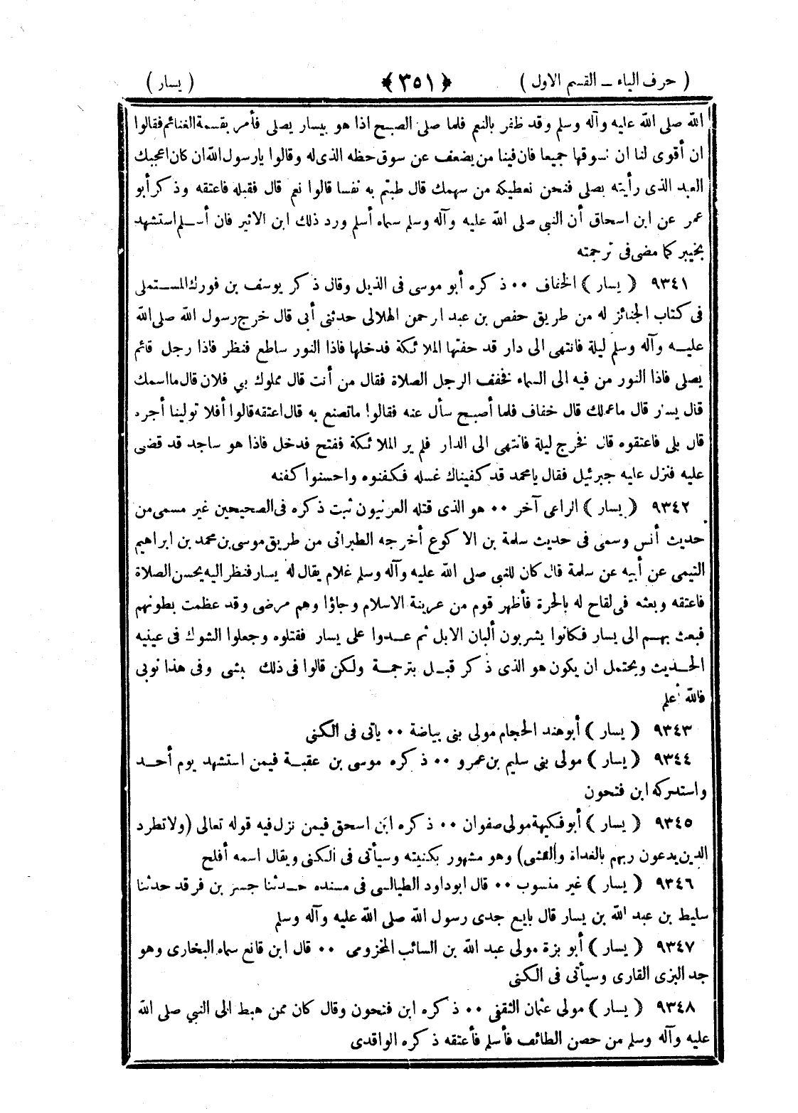 <351> الله صلى الله عليه وسلم وقد ظفر بالنعم فلما صلى الصبح إذا هو بيسار يصلي فأمر بقسمة الغنائم فقالوا ان أقوى لنا أن نسوقها جميعا فان فينا من يضعف عن سوق حظه الذي له وقالوا يا رسول الله ان كان أعجبك العبد الذي رأيته يصلي فنحن نعطيكه من سهمك قال طبتم به نفسا قالوا نعم قال فقبله فأعتقه وذكر أبو عمر عن بن إسحاق أن النبي صلى الله عليه وسلم سماه أسلم ورد ذلك بن الأثير فان أسلم استشهد بخيبر كما مضى في ترجمته يسار الخفاف ذكره أبو موسى في الذيل وقال ذكر يوسف بن فورك المستملي في كتاب الجنائز له من طريق حفص بن عبد الرحمن الهلالي حدثني أبي قال خرج رسول الله صلى الله عليه وسلم ليلة فانتهى الى دار قد حفتها الملائكة فدخلها فإذا النور ساطع فنظر فإذا رجل قائم يصلي فإذا النور من فيه الى السماء فخفف الرجل الصلاة فقال من أنت قال مملوك بني فلان قال ما اسمك قال يسار قال ما عملك قال خفاف فلما أصبح سأل عنه فقالوا ما تصنع به قال أعتقه قالوا أفلا تولينا أجره قال بلى فأعتقوه قال فخرج ليلة فانتهى الى الدار فلم ير الملائكة ففتح فدخل فإذا هو ساجد قد قضى عليه فنزل عليه جبريل فقال يا محمد قد كفيناك غسله فكفنوه وأحسنوا كفنه يسار الراعي آخر هو الذي قتله العرنيون ثبت ذكره في الصحيحين غير مسمى من حديث أنس وسمى في حديث سلمة بن الأكوع أخرجه الطبراني من طريق موسى بن محمد بن إبراهيم التيمي عن أبيه عن سلمة قال كان للنبي صلى الله عليه وسلم غلام يقال له يسار فنظر اليه يحسن الصلاة فأعتقه وبعثه في لقاح له بالحرة فأظهر قوم من عرينة الإسلام وجاءوا وهم مرضى وقد عظمت بطونهم فبعث بهم الى يسار فكانوا يشربون ألبان الإبل ثم عدوا على يسار فقتلوه وجعلوا الشوك في عينيه الحديث ويحتمل أن يكون هو الذي ذكر قبل بترجمة ولكن قالوا في ذلك حبشي وفي هذا نوبي فالله أعلم يسار أبو هند الحجام مولى بني بياضة يأتي في الكنى يسار مولى بني سليم بن عمرو ذكره موسى بن عقبة فيمن استشهد يوم أحد واستدركه بن فتحون يسار أبو فكيهة مولى صفوان ذكره بن إسحاق فيمن نزل فيه قوله تعالى ولا تطرد الذين يدعون ربهم بالغداة والعشي وهو مشهور بكنيته وسيأتي في الكنى ويقال اسمه أفلح يسار غير منسوب قال أبو داود الطيالسي في مسنده حدثنا جسر بن فرقد حدثنا سليط بن عبد الله بن يسار قال بايع جدي رسول الله صلى الله عليه وسلم يسار أبو بزة مولى عبد الله بن السائب المخزومي قال بن قانع سماه البخاري وهو جد البزي القارئ وسيأتي في الكنى يسار مولى عثمان الثقفي ذكره بن فتحون وقال كان ممن هبط الى النبي صلى الله عليه وسلم من حصن بالطائف فأسلم فأعتقه ذكره الواقدي §