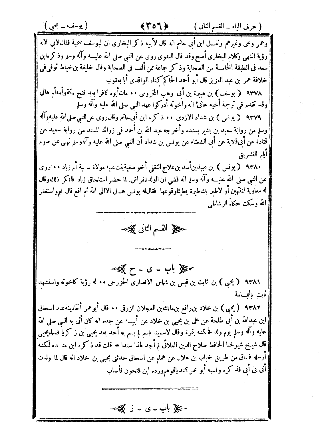 <356> وعمر وعلي وغيرهم ونقل بن أبي حاتم أنه قال لأبيه ذكر البخاري أن ليوسف صحبة فقال أبي لا له رؤية انتهى وكلام البخاري أصح وقد قال البغوي روى عن النبي صلى الله عليه وسلم وذكره بن سعد في الطبقة الخامسة من الصحابة وذكره جماعة ممن ألف في الصحابة وقال خليفة بن خياط توفي في خلافة عمر بن عبد العزيز قال أبو أحمد الحاكم كناه الواقدي أبا يعقوب يوسف بن هبيرة بن أبي وهب المخزومي مات أبوه كافرا بعد فتح مكة وأمه أم هانئ وقد تقدم في ترجمة أخيه هانئ أنه وأخويه أدركوا عهد النبي صلى الله عليه وسلم يونس بن شداد الأزدي ذكره بن أبي حاتم وقال روى عن النبي صلى الله عليه وسلم من رواية سعيد بن بشير بسنده وأخرجه عبد الله بن أحمد في زوائد المسند من رواية سعيد عن قتادة عن أبي قلابة عن أبي الشعثاء عن يونس بن شداد أن النبي صلى الله عليه وسلم نهى عن صوم أيام التشريق يونس بن عبيد بن أسد بن علاج الثقفي أخو صفية بنت عبيد مولاة سمية أم زياد روى عن النبي صلى الله عليه وسلم انه قضى أن الولد للفراش لما حضر استلحاق زياد فأنكر ذلك وقال له معاوية لتنتهين أو لأطيرن بك طيرة بطيئا وقوعها فقال له يونس هل الا الى الله ثم أقع قال نعم واستغفر الله وسكت حكاه الرشاطي القسم الثاني بعدها الحاء يحيى بن ثابت بن قيس بن شماس الأنصاري الخزرجي له رؤية كإخوته واستشهد ثابت باليمامة يحيى بن خلاد بن رافع بن مالك بن العجلان الزرقي قال أبو عمر أحاديثه عند إسحاق بن عبد الله بن أبي طلحة عن علي بن يحيى بن خلاد عن أبيه عن جده أنه كان أتي به النبي صلى الله عليه وسلم يوم ولد فحنكه بتمرة وقال لأسمينه باسم لم يسم به أحد بعد يحيى بن زكريا فسماه يحيى قال شيخ شيوخنا الحافظ صلاح الدين العلائي لم أجد لهذا سندا قلت قد ذكره بن منده لكنه أرسله فساق من طريق حبان بن هلال عن همام عن إسحاق حدثني يحيى بن خلاد أنه قال لما ولدت أتى بي أبي فذكره ونسبه أبو عمر كنديا فوهم ورده بن فتحون فأصاب الياء بعدها الزاي §
