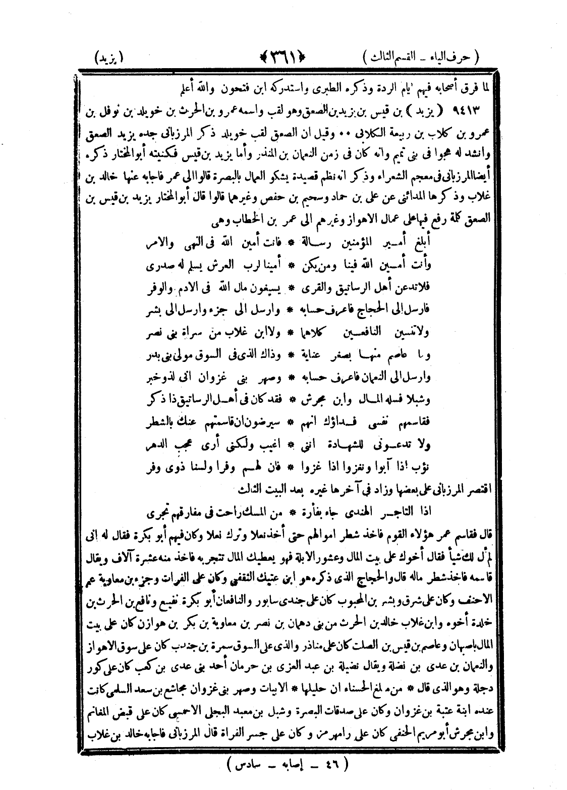 <361> لما فرق أصحابه فيهم أيام الردة وذكره الطبري واستدركه بن فتحون والله أعلم يزيد بن قيس بن يزيد بن الصعق وهو لقب واسمه عمرو بن الحارث بن خويلد بن نوفل بن عمرو بن كلاب بن ربيعة الكلابي وقيل ان الصعق لقب خويلد ذكر المزرباني جده يزيد بن الصعق وأنشد له هجوا في بني تميم وأنه كان في زمن النعمان بن المنذر وأما يزيد بن قيس فكنيته أبو المختار ذكره أيضا المرزباني في معجم الشعراء وذكر أنه نظم قصيدة يشكو العمال بالبصرة قالوا الى عمر فأجابه عنها خالد بن غلاب وذكرها المدائني عن علي بن حماد وسحيم بن حفص وغيرهما قالوا قال أبو المختار يزيد بن قيس بن الصعق كلمة رفع فيها على عمال الأهواز وغيرهم الى عمر بن الخطاب وهي أبلغ أمير المؤمنين رسالة فأنت أمين الله في النهي والأمر وأنت أمين الله فينا ومن يكن أمينا لرب العرش يسلم له صدري فلا تدعن أهل الرساتيق والقرى يسيغون مال الله في الأدم الوفر فأرسل الى الحجاج فاعرف حسابه وأرسل الى جزء وأرسل الى بشر ولا تنسين النافعين كلاهما ولا بن غلاب من سراة بني نصر وما عاصم منها بصغر عناية وذاك الذي في السوق مولى بني بدر وأرسل الى النعمان فاعرف حسابه وصهر بني غزوان اني لذو خبر وشبلا فسله المال وابن محرش فقد كان في أهل الرساتيق ذا ذكر فقاسمهم نفسي فداؤك انهم سيرضون ان قاسمتهم منك بالشطر ولا تدعوني للشهادة انني أغيب ولكني أرى عجب الدهر نؤوب إذا آبوا ونغزو إذا غزوا فان لهم وفرا ولسنا ذوي وفر اقتصر المزرباني على بعضها وزاد في آخرها البيت الثالث إذا التاجر الهندي جاء بفأرة من المسك راحت في مفارقهم تجري قال فقاسم عمر هؤلاء القوم فأخذ شطر أموالهم حتى أخذ نعلا وترك نعلا وكان فيهم أبو بكرة فقال اني لم آل لك شيئا فقال أخوك على بيت المال وعشور الأبلة فهو يعطيك المال تتجر به فأخذ منه عشرة آلاف ويقال قاسمه فأخذ شطر ماله قال والحجاج الذي ذكره هو بن عتيك الثقفي وكان على الفرات وجزء بن معاوية عم الأحنف وكان على سرف وبشر بن المحبوب كان على جندي سابور والنافعان أبو بكر نفيع ونافع بن الحارث بن خلدة أخوه وابن غلاب خالد بن الحارث من بني دهمان بن نصر بن معاوية بن بكر بن هوازن كان على بيت المال بأصبهان وعاصم بن قيس بن الصلت كان على مناذر والذي على السوق سمرة بن جندب كان على سوق الأهواز والنعمان بن عدي بن نضلة ويقال نضيلة بن عبد العزى بن حرثان أحد بني عدي بن كعب كان على كور دجلة وهو الذي قال من مبلغ الحسناء أن حليلها الأبيات وصهر بني غزوان مجاشع بن سعد السلمي كانت عنده ابنة عتبة بن غزوان وكان على صدقات البصرة وشبل بن معبد البجلي الأحمسي كان على قبض المغانم وابن محرش أبو مريم الحنفي كان على رامهرمز وكان على جسر الفرات قال المرزباني فأجابه خالد بن غلاب §