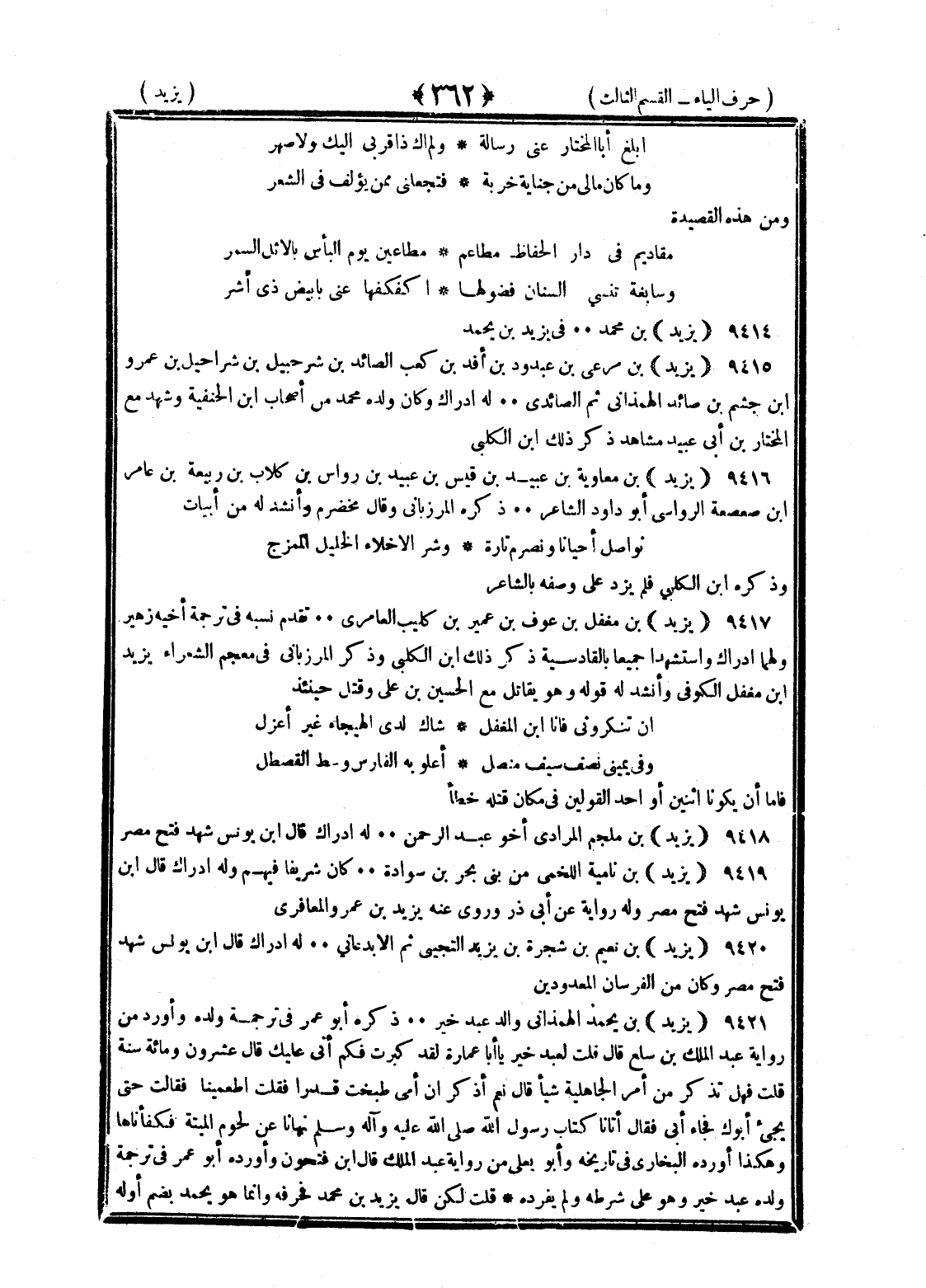 <362> أبلغ أبا المختار عني رسالة ولم أك ذا قربى إليك ولا صهر وما كان مالي من ولاية خربة فتجعلني ممن يؤلف في الشعر ومن هذه القصيدة مقاديم في دار الحفاظ مطاعم مطاعين يوم البؤس بالأسل السمر وسابغة تنسى السنان فضولها أكفكفها عني بأبيض ذي أثر يزيد بن محمد في زيد بن محمد يزيد بن مر علي بن عبد ود بن أمد بن كعب الصائد بن شرحبيل بن عمرو بن جشم بن صائد الهمداني ثم الصائدي وكان ولده محمد من أصحاب بن حنيفة وشهد مع المختار بن أبي عبيدة مشاهده ذكر ذلك بن الكلبي يزيد بن معاوية بن عبيد بن رؤاس بن كلاب بن ربيعة بن عامر بن صعصعة الرؤاسي أبو داود الشاعر ذكره المرزباني وقال مخضرم وأنشد له من أبيات تواصل أحيانا وتصرم تارة وشر الأخلاء الخليل الممزج وذكره بن الكلبي فلم يزد على وصفه بالشاعر يزيد بن مغفل بن عوف بن عمير بن كلب العامري تقدم نسبه في ترجمة أخيه زهير ولهما إدراك واستشهدا جميعا بالقادسية ذكر ذلك بن الكلبي وذكر المرزباني في معجم الشعراء يزيد بن مغفل الكوفي وأنشد له قوله وهو يقاتل مع الحسين بن علي وقتل حينئذ ان تنكروني فأنا بن المغفل شاك لدى الهيجاء غير أعزل وفي يميني نصف سيف معصل أعلو به الفارس وسط القسطل فاما أن يكونا اثنين أو أحد القولين في مكان قتله خطأ يزيد بن ملجم المرادي أخو عبد الرحمن له إدراك قال بن يونس شهد فتح مصر يزيد بن ناجية اللخمي من بني بحر بن سوادة كان شريف فيهم وله إدراك قال بن يونس شهد فتح مصر وله رواية عن أبي ذر وروى عنه يزيد بن عمرو المعافري يزيد بن نعيم بن شجرة بن يزيد التجيبي ثم الأيدعاني له إدراك قال بن يونس شهد فتح مصر وكان من الفرسان المعدودين يزيد بن يحمد الهمداني والد عبد خير ذكره أبو عمر في ترجمة ولده وأورد من رواية عبد الملك بن سلع قال قلت لعبد خير يا أبا عمارة لقد كبرت فكم أتى عليك قال عشرون ومائة سنة قلت فهل تذكر من أمر الجاهلية شيئا قال نعم أذكر أن أمي طبخت قدرا فقلت أطعمينا فقالت حتى يجيء أبوك فجاء أبي فقال أتانا كتاب رسول الله صلى الله عليه وسلم ينهانا عن لحوم الميتة فكفأناها وهكذا أورده البخاري في تاريخه وأبو يعلى من رواية عبد الملك قال بن فتحون وأورده أبو عمر في ترجمة ولده عبد خير وهو على شرطه ولم يفرده قلت لكن قال يزيد بن محمد فحرفه وانما هو يحمد بضم أوله §