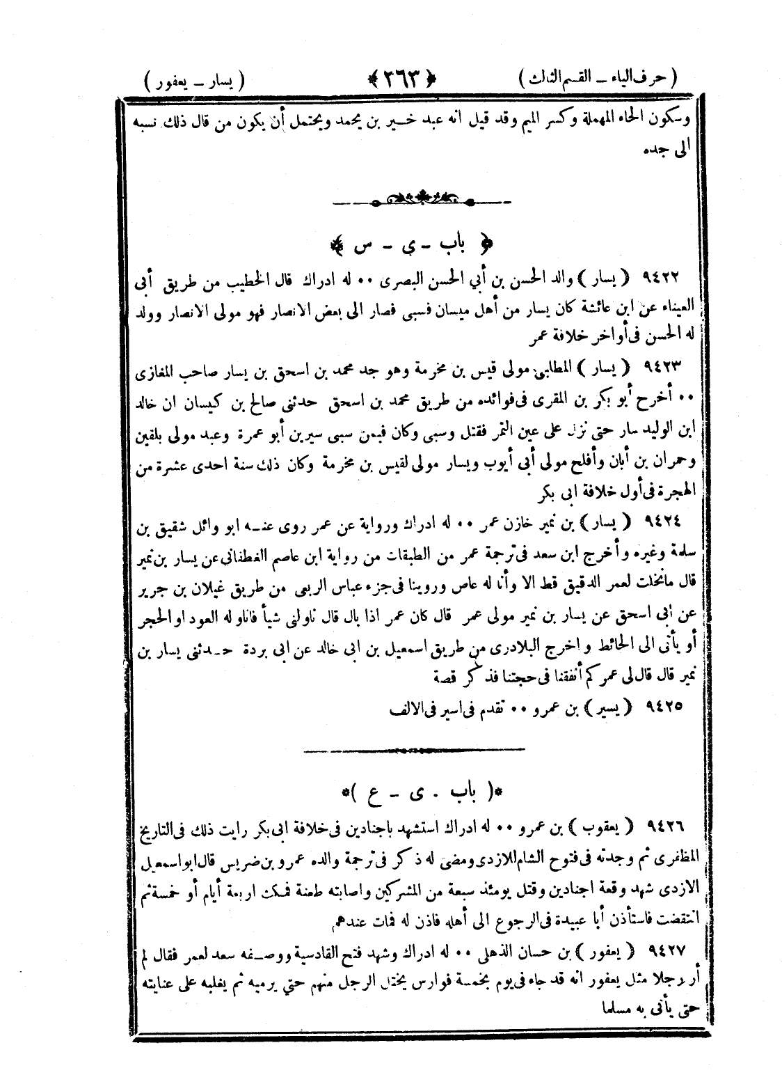 <363> وسكون الحاء المهملة وكسر الميم وقد قيل انه عبد خير بن يحمد ويحتمل أن يكون من قال ذلك نسبه الى جده الياء بعدها السين يسار والد الحسن بن أبي الحسن البصري له إدراك قال الخطيب من طريق أبي العيناء عن بن عائشة كان يسار من أهل ميسان فسبي فصار الى بعض الأنصار فهو مولى الأنصار وولد له الحسن في أواخر خلافة عمر يسار المطلبي مولى قيس بن مخرمة وهو جد محمد بن يسار صاحب المغازي أخرج أبو بكر بن المقرئ في فوائده من طريق محمد بن إسحاق حدثني صالح بن كيسان أن خالد بن الوليد سار حتى نزل على عين التمر فقتل وسبى وكان فيمن سبى سيرين أبو عمرة وعبد مولى بلقين وحمران بن أبان وأفلح مولى أبي أيوب ويسار مولى لقيس بن مخرمة وكان ذلك سنة إحدى عشرة من الهجرة في أول خلافة أبي بكر يسار بن نمير خازن عمر له إدراك ورواية عن عمر روى عنه أبو وائل شقيق بن سلمة وغيره وأخرج بن سعد في ترجمة عمر من الطبقات من رواية أبي عاصم الغطفاني عن يسار بن نمير قال ما نخلت لعمر الدقيق قط الا وأنا له عاص وروينا في جزء عباس الترقفي من طريق غيلان بن جرير عن أبي إسحاق عن يسار بن نمير مولى عمر قال كان عمر إذا بال قال ناولني شيئا فأناوله العود أو الحجر أو يأتي الى الحائط وأخرج البلاذري من طريق إسماعيل بن أبي خالد عن أبي بردة حدثني يسار بن نمير قال قال لي عمر كم أنفقنا في حجتنا فذكر قصة يسير بن عمرو تقدم في أسير في الألف الياء بعدها العين يعقوب بن عمرو له إدراك استشهد بأجنادين في خلافة أبي بكر رأيت ذلك في تاريخ المظفري ثم وجدته في فتوح الشام للأزدي ومضى له ذكر في ترجمة والده عمرو بن ضريس قال أبو إسماعيل الأزدي شهد وقعة أجنادين وقتل يومئذ سبعة من المشركين وأصابته طعنة فمكث أربعة أيام أو خمسة ثم انتقضت فاستأذن أبا عبيدة في الرجوع الى أهله فأذن له فمات عندهم يعفور بن حسان الذهلي له إدراك وشهد فتح القادسية ووصفه سعد لعمر فقال ألم أر رجلا مثل يعفور انه قد جاء في يوم بخمسة فوارس يختل الرجل منهم حتى يرميه ثم يغلبه على غاية حتى يأتي به مسلما §