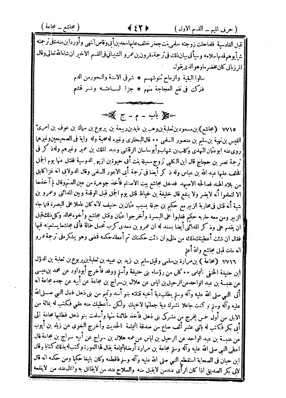 <42> قبل القادسية فلما خلت زوجته سلمى بنت جعفر خلف عليها سعد بن أبي وقاص انتهى وأورد بن منده في ترجمته شيئا يوهم قدم إسلامه وسيأتي بيان ذلك في ترجمة مقرون بن عمرو الشيباني في القسم الأخير ان شاء الله تعالى وقال المرزباني كان مخضرما وهو الذي يقول سألوا البقية والرماح تنوشهم شرقي الأسنة والنحور من الدم فتركت في نقع العجاجة منهم جزرا لساغبة ونسر قشعم الميم بعدها الجيم مجاشع بن مسعود بن ثعلبة بن وهب بن عائذ بن ربيعة بن يربوع بن سمال بن عوف بن امرئ القيس بن بهثة بن سليم بن منصور السلمي قال البخاري وغيره له صحبة وله رواية في الصحيحين وغيرهما روى عنه أبو عثمان النهدي وكليب بن شهاب وأبو ساسان الرقاشي وعبد الملك بن عمير وغيرهم وله ذكر في ترجمة نصر بن حجاج قال أبو الكلبي تزوج سميلة بنت أبي حيوة بن ازيهر الدوسية فقتل عنها يوم الجمل فخلف عليها عبد الله بن عباس وله ذكر أيضا في ترجمة أبي الأعور السلمي وقال الدولابي انه غزا كابل من بلاد الهند فصالحه الاصيهد فدخل مجاشع بيت الأصنام فأخذ جوهرة من عين الصنم وقال لم آخذها الا لتعلموا انه لا يضر ولا ينفع قال خليفة بن خياط قتل يوم الجمل قبل الوقعة وبين المدائني وعمر بن شبة انه قتل في محاربة الزبير مع حكيم بن جبلة بسبب عثمان بن حنيف لأنه كان عاملا على البصرة فلما جاء الزبير ومن معه حاربه حكيم فغلبوا على البصرة واخرجوا عثمان وقبل مجاشع وأخوه مجالد وكل ذلك قبل ان يقدم على وذكر المدائني أيضا بسند له ان عمرو بن معد يكرب تحمل حمالة فاتى مجاشعا يستعينه فيها فقال ان شئت أعطيتك ذلك من مالي وان شئت حكمتك ثم أعطاه حكمه فمضى وهو يشكره وسيأتي في ترجمة عمرو ان مات قبل مجاشع والله اعلم مجاعة بن مرارة بن سلمى وقيل سليم بن زيد بن عبيد بن ثعلبة بن يربوع بن ثعلبة بن الدؤل بن حنيفة الحنفي اليمامي كان من رؤساء بني حنيفة واسلم ووفد فاخرج أبو داود عن محمد بن عيسى عن عنبسة بن عبد الواحد عن الدخيل بن إياس عن هلال بن سراج بن مجاعة عن أبيه عن جده مجاعة انه اتى النبي صلى الله عليه وسلم يطلب دية أخيه قتلته بنو أسد وتميم من بني ذهل فقال النبي صلى الله عليه وسلم لو كنت جاعلا لمشرك دية جعلتها لأخيه ولكن سأعطيك منه عقبى فكتب له بمائة من الإبل من أول خمس يخرج من مشركي بني ذهل فأخذ طائفة منها واسلمت بنو ذهل فطلبها مجاعة الى أبي بكر فكتب له باثنى عشر ألف صاع من صدقة اليمامة الحديث واخرج البغوي عن زياد بن أيوب عن عنبسة بن عبد الواحد عن الدخيل بن إياس عن عمه هلال بن سراج عن أبيه سراج بن مجاعة قال أعطى النبي صلى الله عليه وسلم مجاعة بن مرارة أرضا باليمامة يقال لها الفورة وكتب له بذلك كتابا وقال بن حبان في الصحابة استقطع النبي صلى الله عليه وسلم فاقطعه وكان بليغا حكيما ومن حكمه انه قال لأبي بكر الصديق إذا كان الرأي عند من لا يقبل منه والسلاح عند من لا يقاتل به والمال عند من لا ينفقه §