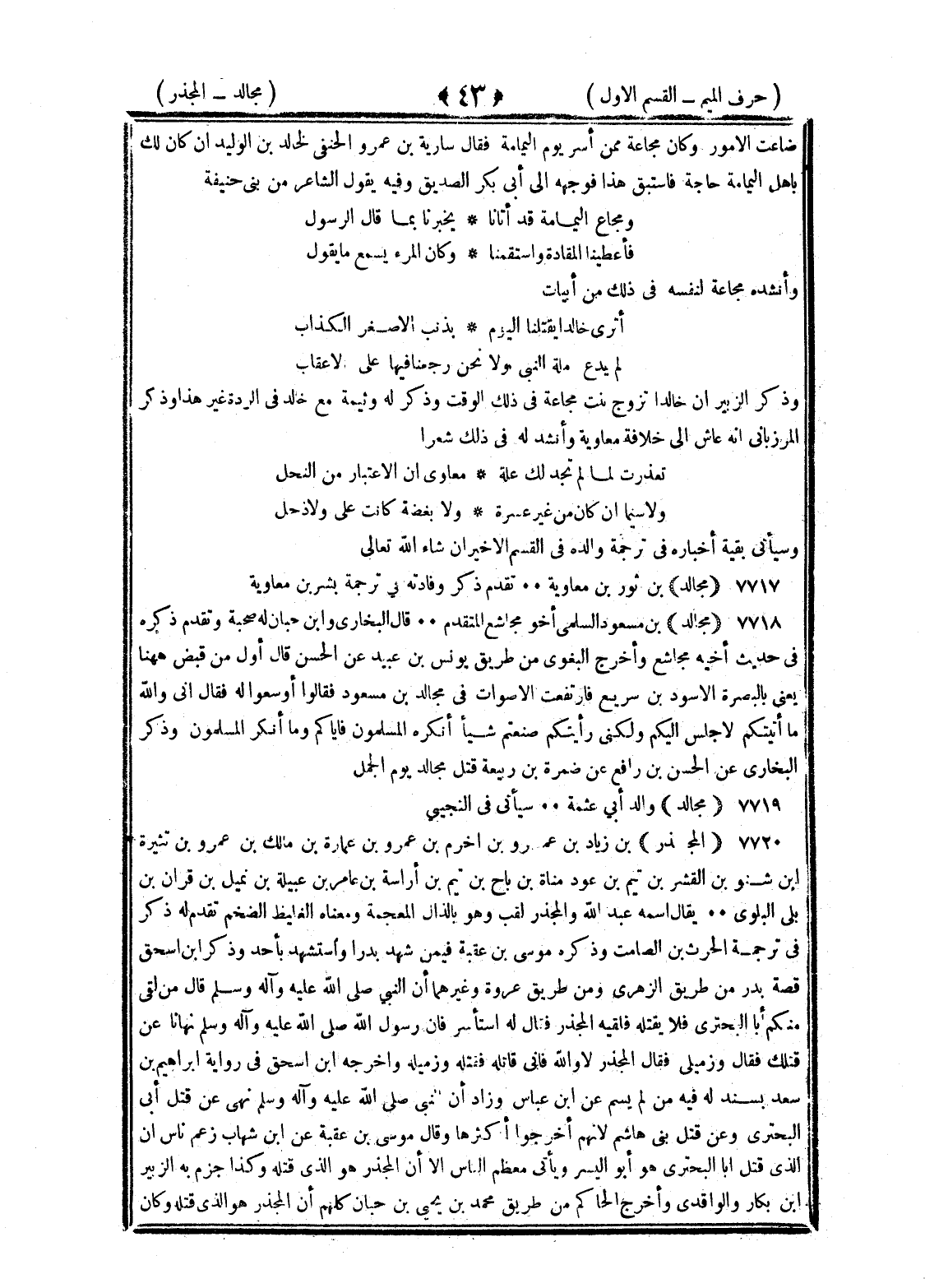<43> ضاعت الأمور وكان مجاعة ممن أسر يوم اليمامة فقال سارية بن عمرو الحنفي لخالد بن الوليد ان كان لك باهل اليمامة حاجة فاستبق هذا فوجهه الى أبي بكر الصديق وفيه يقول الشاعر من بني حنيفة ومجاع اليمامة قد اتانا يخبرنا بما قال الرسول فاعطينا المقادة واستقمنا وكان المرء يسمع ما يقول وأنشد مجاعة لنفسه في ذلك من أبيات اترى خالدا يقتلنا اليوم بذنب الأصفر الكذاب لم يدع ملة النبي ولا نحن رجعنا فيها على الاعقاب وذكر الزبير ان خالدا تزوج بنت مجاعة في ذلك الوقت وذكر له وثيمة مع خالد في الردة غير هذا وذكر المرزباني انه عاش الى خلافة معاوية وأنشد له في ذلك شعرا تعذرت ما لم تجد لك علة معاوية ان الاعتذار من البخل ولا سيما ان كان من غير عسرة ولا بغضة كانت على ولا ذحل وستاتي بقية اخباره في ترجمة والده في القسم الأخير ان شاء الله تعالى مجالد بن ثور بن معاوية تقدم ذكر وفادته في ترجمة بشر بن معاوية مجالد بن مسعود السلمي أخو مجاشع المتقدم قال البخاري وابن حبان له صحبة وتقدم ذكره في حديث أخيه واخرج البغوي من طريق يونس بن عبيد عن الحسن قال أول من قص ههنا يعني بالبصرة الأسود بن سريع فارتفعت الأصوات فجاء مجالد بن مسعود السلمي فقالوا اوسعوا له فقال اني والله ما اتيتكم لاجلس اليكم ولكني رأيتكم صنعتم شيئا أنكره المسلمون فاياكم وما أنكره المسلمون وذكر البخاري عن الحسن بن رافع عن ضمرة بن ربيعة قتل مجالد يوم الجمل مجالد والد أبي عثمة سيأتي في التجيبي المجذر بن زياد بن عمرو بن أخرم بن عمرو بن عمارة بن مالك بن عمرو بن بثيرة بن مشنوء بن القشير بن تيم بن عوذ مناة بن ناج بن تيم بن اراشة بن عامر بن عبيلة بن قسميل بن قران بن بلى البلوي يقال اسمه عبد الله والمجذر لقب وهو بالذال المعجمة ومعناه الغليظ الضخم تقدم له ذكر في ترجمة الحارث بن الصامت وذكره موسى بن عقبة فيمن شهد بدرا واستشهد بأحد وذكر بن إسحاق في قصة بدر من طريق الزهري ومن طريق عروة وغيرهما ان النبي صلى الله عليه وسلم قال من لقى منكم أبا البختري فلا يقتله فلقيه المجذر فقال له استأسر فان رسول الله صلى الله عليه وسلم نهانا عن قتلك فقال وزميلي فقال المجذر لا والله فاني قاتله فقتله وزميله وأخرجه بن إسحاق في رواية إبراهيم بن سعد بسند له فيه من لم يسم عن بن عباس وزاد ان النبي صلى الله عليه وسلم نهى عن قتل أبي البختري وعن قتل بني هاشم لأنهم اخرجوا كرها وقال موسى بن عقبة عن بن شهاب زعم ناس ان الذي قتل أبا البختري هو أبو اليسر ويأبى معظم الناس الا ان المجذر هو الذي قتله وكذا جزم به الزبير بن بكار والواقدي واخرج الحاكم من طريق محمد بن يحيى بن حبان كلهم ان المجدر هو الذي قتله وكان §