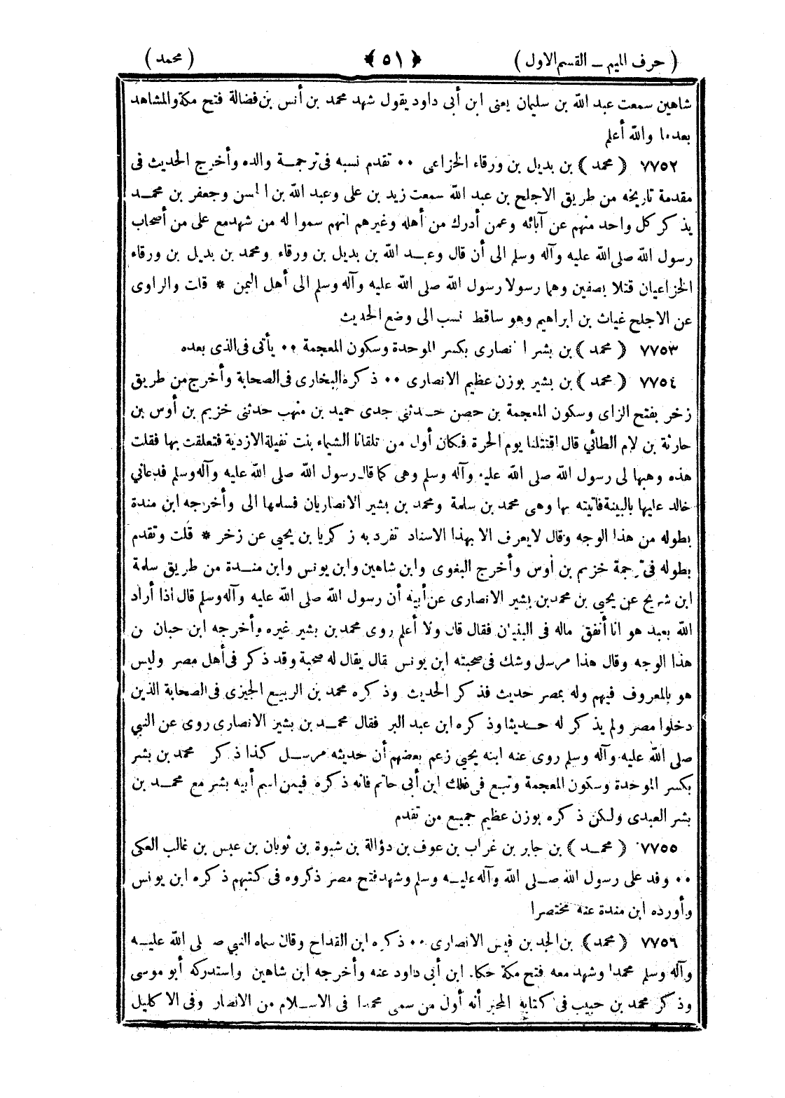 <51> شاهين سمعت عبد الله بن سليمان يعني بن أبي داود ويقول شهد محمد بن أنس بن فضالة فتح مكة والمشاهد بعدها والله أعلم محمد بن بديل بن ورقاء الخزاعي تقدم نسبه في ترجمة والده وأخرج الحديث في مقدمة تاريخه من طريق الأجلح بن عبد الله سمعت زيد بن علي وعبد الله بن حسن وجعفر بن محمد يذكر كل واحد منهم عن آبائه وعمن أدرك من أهله وغيرهم أنهم سموا له من شهد مع علي من أصحاب رسول الله صلى الله عليه وسلم إلى أن قال وعبد الله بن بديل بن ورقاء ومحمد بن بديل بن ورقاء الخزاعيان قتلا بصفين وهما رسولا رسول الله صلى الله عليه وسلم إلى أهل اليمن قلت والراوي عن الأجلح غياث بن إبراهيم وهو ساقط نسب إلى وضع الحديث محمد بن بشر الأنصاري بكسر الموحدة وسكون المعجمة يأتي في الذي بعده محمد بن بشير بوزن عظيم الأنصاري ذكره البخاري في الصحابة وأخرج من طريق زخر بفتح الزاي وسكون المعجمة بن حصن حدثني جدي حميد بن منهب حدثني خريم بن حارثة بن لام الطائي قال اقتتلنا يوم الحرة فكان أول من تلقاني الشيماء بنت بقيلة الأزدية فتعلقت بها فقلت هذه وهبها لي رسول الله صلى الله عليه وسلم وهي كما قال رسول الله صلى الله عليه وسلم فدعاني خالد عليها بالبينة فأتيته بها وهي محمد بن سلمة ومحمد بن بشير الأنصاري فسلمها إلي وأخرجه بن منده بطوله من هذا الوجه وقال لا يعرف إلا بهذا الإسناد تفرد به زكريا بن يحيى عن زخر قلت وقد تقدم بطوله في ترجمة خريم بن أوس وأخرج البغوي وابن شاهين وابن يونس وابن منده من طريق سلمة بن شريح عن يحيى بن محمد بن بشير الأنصاري عن أبيه أن رسول الله صلى الله عليه وسلم قال إذا أراد الله بعبد هوانا أنفق ماله في البنيان فقال قال ولا أعلم روى محمد بن بشير غيره وأخرجه بن حبان من هذا الوجه وقال هذا مرسل وشك في صحبته بن يونس فقال يقال له صحبة وقد ذكر في أهل مصر وليس هو بالمعروف فيهم وله بمصر حديث فذكر الحديث وذكره محمد بن الربيعة الجيزي في الصحابة الذين دخلوا مصر ولم يذكر له حديثا وذكره بن عبد البر فقال محمد بن بشير الأنصاري روى عن النبي صلى الله عليه وسلم روى عنه ابنه يحيى زعم بعضهم أن حديثه مرسل كذا ذكره محمد بن بشر بكسر الموحده وسكون المعجمة وتبع في ذلك بن أبي حاتم فإنه ذكره فيمن اسم أبيه بشر مع محمد بن بشر العبدي ولكن ذكره بوزن عظيم جميع من تقدم محمد بن جابر بن عراب بن عوف بن ذؤالة بن شبوة بن ثوبان بن عبس بن غالب العكي وفد على رسول الله صلى الله عليه وسلم وشهد فتح مصر ذكروه في كتبهم ذكره بن يونس وأورده بن منده عنه مختصرا محمد بن الجد بن قيس الأنصاري ذكره بن القداح وقال سماه النبي صلى الله عليه وسلم محمدا وشهد معه فتح مكة حكاه بن أبي داود عنه وأخرجه بن شاهين واستدركه أبو موسى وذكر محمد بن حبيب في كتابه المحبر أنه أول من سمى محمدا في الإسلام من الأنصار وفي الإكليل §