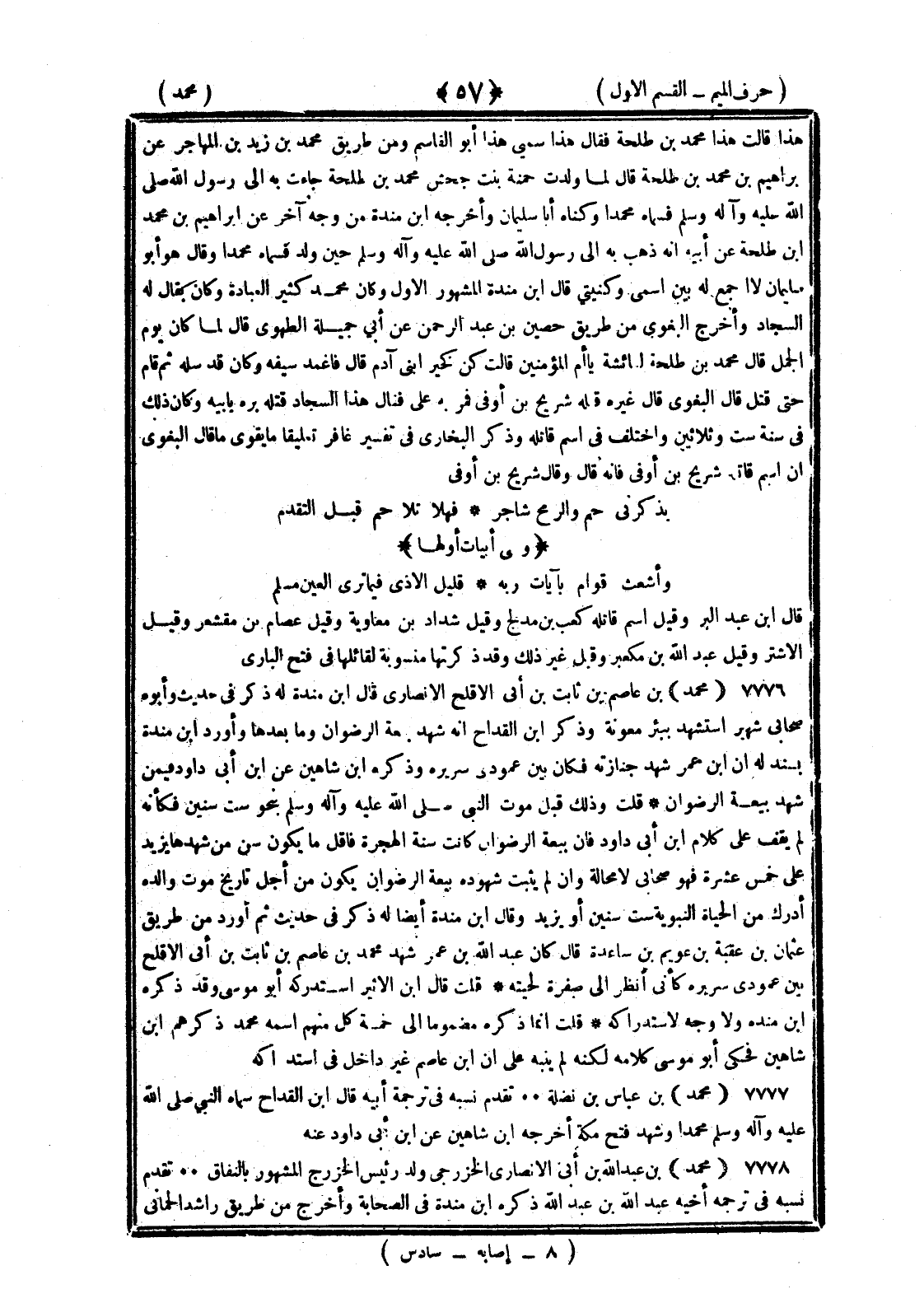 <57> هذا قالت محمد بن طلحة فقال هذا سميي هذا أبو القاسم ومن طريق محمد بن زيد بن المهاجر عن إبراهيم بن محمد بن طلحة قال لما ولدت حمنة بنت جحش محمد بن طلحة جاءت به إلى رسول الله صلى الله عليه وسلم فسماه محمدا وكناه أبا سليمان وأخرجه بن منده من وجه آخر عن إبراهيم بن محمد عن طلحة عن أبيه أنه ذهب به إلى رسول الله صلى الله عليه وسلم حين ولد فسماه محمدا وقال هو أبو سليمان لا أجمع له بني اسمي وكنيتي وقال بن منده المشهور الأول وكان محمد كثير العبادة وكان يقال له السجاد وأخرج البغوي من طريق حصين بن عبد الرحمن عن أبي جميلة الطهوي قال لما كان يوم الجمل قال محمد بن طلحة لعائشة يا أم المؤمنين قالت كن كخير ابني آدم قال فأغمد سيفه وكان قد سله ثم قام حتى قتل قال البغوي قال غيره قتله شريع بن أوفى فمر به علي فقال هذا السجاد قتله بره بأبيه وكان ذلك في سنة ست وثلاثين واختلف في اسم قاتله وذكر البخاري في تفسير غافر تعليقا ما يقوى ما قال البغوي أن اسم قاتله شريح بن أبي أوفى يذكرني حم والرمح شاجر فهلا تلا حم قبل التقدم وهي أبيات أولها وأشعث قوام بآيات ربه قليل الأذى فيما ترى العين مسلم قال بن عبد البر وقيل اسم قاتله كعب بن مدلج وقيل شداد بن معاوية وقيل عصام بن مقشعر وقيل الأشتر وقيل عبد الله بن مكعبر وقيل غير ذلك وقد ذكرتها منسوبة لقائلها في فتح الباري محمد بن عاصم بن ثابت بن أبي الأقلح الأنصاري قال بن منده له ذكر في حديث وأبوه صحابي شهير استشهد ببئر معونة وذكر بن القداح أنه شهد بيعة الرضوان وما بعدها وأورد بن منده بسند له أن بن عمر شهد جنازته فكان بين عمودي سريره وذكره بن شاهين عن بن أبي داود فيمن شهد بيعة الرضوان قلت وذلك قبل موت النبي صلى الله عليه وسلم بنحو ست سنين فكأنه لم يقف على كلام بن أبي داود فإن بيعة الرضوان كانت سنة الهجرة فأقل ما يكون سن من شهدها يزيد على خمس عشرة فهو صحابي لا محالة وإن لم يثبت شهود بيعة الرضوان يكون من أجل تاريخ موت والده أدرك من الحياة النبوية ست سنين أو يزيد وقال بن منده أيضا له ذكر في حديث ثم أورد من طريق عثمان بن عتبة بن عويم بن ساعدة قال كان عبد الله بن عمر شهد محمد بن عاصم بن ثابت بن أبي الأفلح بين عمودي سريره كأني أنظر إلى صفرة لحيته قلت قال بن الأثير استدركه أبو موسى وقد ذكره بن منده ولا وجه لاستدراكه قلت إنما ذكره مضموما إلى خمسة كل منهم اسمه محمد ذكرهم بن شاهين فحكى أبو موسى كلامه لكنه لم ينبه على أن بن عاصم غير داخل في استدراكه محمد بن عباس بن نضلة تقدم نسبه في ترجمة أبيه قال بن القداح سماه النبي صلى الله عليه وسلم محمدا وشهد فتح مكة أخرجه بن شاهين عن بن أبي داود عنه محمد بن عبد الله بن أبي الأنصاري الخزرجي ولد رئيس الخزرج المشهور بالنفاق تقدم نسبه في ترجمة أخيه عبد الله بن عبد الله ذكره بن منده في الصحابة وأخرج من طريق راشد الحماني §