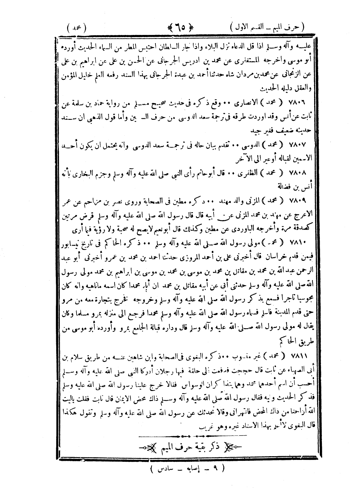 <65> عليه وسلم إذا قل الدعاء نزل البلاء وإذا جار السلطان احتبس المطر من السماء الحديث أورده أبو موسى وأخرجه المستغفري عن محمد بن إدريس الجرجاني عن الحسن بن علي عن إبراهيم بن علي عن الزنجاني عن محمد بن مردان شاه حدثنا أحمد بن عبدة الجرجاني بهذا السند رفعه العلم خليل المؤمن والعقل دليله الحديث محمد الأنصاري وقع ذكره في صحيح مسلم من رواية حماد بن سلمة عن ثابت عن أنس وقد أوردت طرقه في ترجمة سعد الدوسي من حرف السين وأما قول الذهبي إن سند حديثه ضعيف فغير جيد محمد الدوسي تقدم بيان حاله في ترجمة سعد الدوسي وأنه يحتمل أن يكون أحد الاسمين لقبا له أو غير إلى الآخر محمد الظفري قال أبو حاتم رأى النبي صلى الله عليه وسلم وجزم البخاري بأنه أنس بن فضالة محمد المزني والد مهند ذكره مطين في الصحابة وروى نصر بن مزاحم عن عمر الأعرج عن مهند بن محمد المزني عن أبيه قال قال رسول الله صلى الله عليه وسلم قرض مرتين كصدقة مرة وأخرجه الباوردي عن مطين وكذلك قال أبو نعيم لا يصح له صحبة ولا رؤية فيما أرى محمد مولى رسول الله صلى الله عليه وسلم ذكره الحاكم في تاريخ نيسابور فيمن قدم خراسان قال أخبرني علي بن أحمد المروزي حدثنا أحمد بن محمد بن عمرو وأخبرني أبو عبد الرحمن عبد الله بن محمد بن مقاتل بن محمد بن موسى بن محمد بن إبراهيم بن محمد مولى رسول الله صلى الله عليه وسلم حدثني أبي عن أبيه مقاتل بن محمد أن أباه محمدا كان اسمه ما ناهيه وأنه كان مجوسيا تاجرا فسمع بذكر رسول الله صلى الله عليه وسلم وخروجه فخرج بتجارة معه من مرو حتى قدم المدينة فأسلم فسماه رسول الله صلى الله عليه وسلم محمدا فرجع إلى منزله بمرو مسلما وكان يقال له مولى رسول الله صلى الله عليه وسلم قال وداره قبالة الجامع بمرو وأورده أبو موسى من طريق الحاكم محمد غير منسوب ذكره البغوي في الصحابة وابن شاهين عنه من طريق سلام بن أبي الصهباء عن ثابت قال حججت فدفعت إلى حلقه فيها رجلان أدركا النبي صلى الله عليه وسلم أحسب أن اسم أحدهما محمد وهما يتذاكران الوسواس فقالا خرج علينا رسول الله صلى الله عليه وسلم فذكر الحديث وفيه فقال رسول الله صلى الله عليه وسلم ذاك محض الإيمان قال ثابت فقلت يا ليت الله اراحنا من ذاك المحض فانتهراني وقالا نحدثك عن رسول الله صلى الله عليه وسلم وتقول هكذا قال البغوي لا أعلم بهذا الإسناد غيره وهو غريب ذكر بقية حرف الميم §