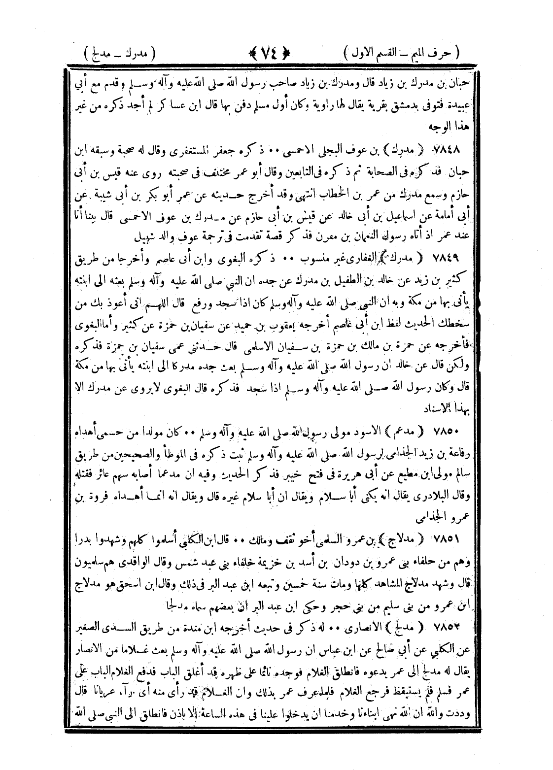 <74> حبان بن مدرك بن زياد قال ومدرك بن زياد صاحب رسول الله صلى الله عليه وسلم وقدم مع أبي عبيدة فتوفي بدمشق بقرية يقال لها راوية وكان أول مسلم دفن بها قال بن عساكر لم أجد ذكره من غير هذا الوجه مدرك بن عوف البجلي الأحمسي ذكره جعفر المستغفري وقال له صحبة وسبقه بن حبان فذكره في الصحابة ثم ذكره في التابعين وقال أبو عمر مختلف في صحبته روى عنه قيس بن أبي حازم وسمع مدرك من عمر بن الخطاب انتهى وقد أخرج حديثه عن عمر أبو بكر بن أبي شيبة عن أبي أمامة عن إسماعيل بن أبي خالد عن قيس بن أبي حازم عن مدرك بن عوف الأحمسي قال بينا أنا عند عمر إذ أتاه رسول النعمان بن مقرن فذكر قصة تقدمت في ترجمة عوف والد شبيل مدرك الغفاري غير منسوب ذكره البغوي وابن أبي عاصم وأخرجا من طريق كثير بن زيد عن خالد بن الطفيل بن مدرك عن جده أن النبي صلى الله عليه وسلم بعثه إلى ابنته يأتي بها من مكة وبه إلى النبي صلى الله عليه وسلم كان إذا سجد ورفع قال اللهم إني أعوذ بك من سخطك الحديث لفظ بن أبي عاصم أخرجه عن يعقوب بن حميد عن سفيان بن حمزة عن كثير وأما البغوي فأخرجه عن حمزة بن مالك بن حمزة بن سفيان الأسلمي قال حدثني عمي سفيان بن حمزة فذكره ولكن قال عن خالد إن رسول الله صلى الله عليه وسلم بعث جده مدركا إلى ابنته يأتي بها من مكة قال وكان رسول الله صلى الله عليه وسلم إذا سجد فذكره قال البغوي لا يروى عن مدرك إلا بهذا الإسناد مدعم الأسود مولى رسول الله صلى الله عليه وسلم كان مولدا من حسمى أهداه رفاعة بن زيد الجذامي لرسول الله صلى الله عليه وسلم ثبت ذكره في الموطأ والصحيحين من طريق سالم مولى بن مطيع عن أبي هريرة في فتح خيبر فذكر الحديث وفيه أن مدعما أصابه سهم غائر فقتله قال البلاذري يقال إنه يكنى أبا سلام ويقال إن أبا سلام غيره قال ويقال إنما أهداه فروة بن عمر الجذامي مدلاج بن عمرو الأسلمي أخو ثقف ومالك قال بن الكلبي أسلموا كلهم وشهدوا بدرا وهم من حلفاء بني عمرو بن داودان بن أسد بن خزيمة حلفاء بني عبد شمس وقال الواقدي هم سلميون قال وشهد مدلاج المشاهد كلها ومات سنة خمسين وتبعه بن عبد البر في ذلك وقال بن إسحاق هو مدلاج بن عمرو من بني سليم من بني حجر وحكى بن عبد البر أن بعضهم سماه مدلجا قال مدلج الأنصاري له ذكر في حديث أخرجه بن منده من طريق السدي الصغير عن الكلبي عن أبي صالح عن بن عباس أن رسول الله صلى الله عليه وسلم بعث غلاما من الأنصار يقال له مدلج إلى عمر يدعوه فانطلق الغلام فوجده نائما على ظهره قد أغلق الباب فدفع الغلام الباب على عمر فسلم فلم يستيقظ فرجع الغلام فلما عرف عمر بذلك وأن الغلام قد رأى منه أي رآه عريانا قال وددت والله أن الله نهى أبناءنا وخدمنا أن يدخلوا علينا في هذه الساعة إلا بإذن فانطلق إلى النبي صلى الله §