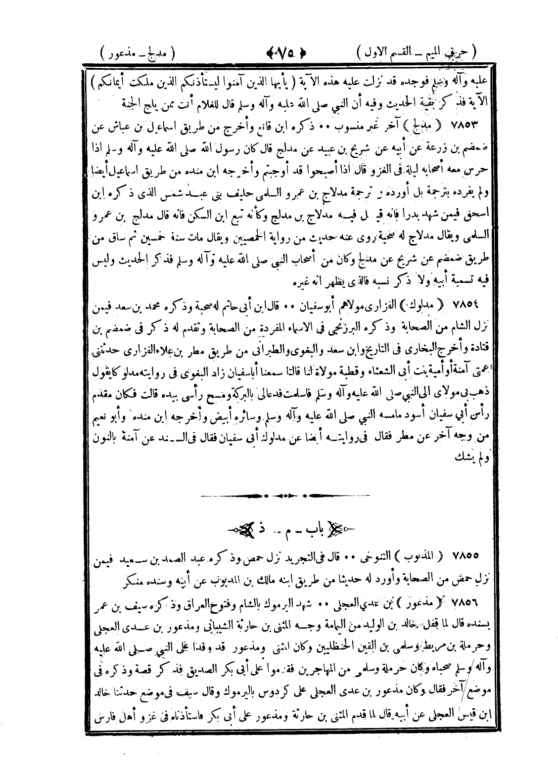 <75> عليه وسلم فوجده قد نزلت عليه هذه الآية يا أيها الذين آمنوا ليستأذنكم الذين ملكت أيمانكم الآية فذكر بقية الحديث وفيه أن النبي صلى الله عليه وسلم قال للغلام أنت ممن يلج الجنة مدلج آخر غير منسوب ذكره بن قانع وأخرج من طريق إسماعيل بن عياش عن ضمضم بن زرعة عن أبيه عن شريح بن عبيد عن مدلج قال كان رسول الله صلى الله عليه وسلم إذا حرس معه أصحابه ليلة في الغزو قال إذا أصبحوا قد أوجبتم وأخرجه بن منده من طريق إسماعيل أيضا ولم يفرده بترجمة بل أورده في ترجمة مدلاج بن عمرو السلمي حليف بني عبد شمس الذي ذكره بن إسحاق فيمن شهد بدرا فإنه قيل فيه مدلاج أو مدلج وكأنه تبع بن السكن فإنه قال مدلج بن عمرو السلمي ويقال مدلاج له صحبة روى عنه حديث من رواية الحمصيين ويقال مات سنة خمسين ثم ساق من طريق ضمضم عن شريح عن مدلج وكان من أصحاب النبي صلى الله عليه وسلم فذكر الحديث وليس فيه تسمية أبيه ولا ذكر نسبه فالذي يظهر أنه غيره مدلوك الفزاري مولاهم أبو سفيان قال بن أبي حاتم له صحبة وذكره محمد بن سعد فيمن نزل الشام من الصحابة وذكره البرديجي في الأسماء المفردة من الصحابة وتقدم له ذكر في ضمضم بن قتادة وأخرج البخاري في التاريخ وابن سعد والبغوي والطبراني من طريق مطر بن العلاء الفزاري وحدثتني عمتي آمنة أو أمية بنت أبي الشعثاء وقطبة مولاة لنا قالتا سمعنا أبا سفيان زاد البغوي في روايته مدلوكا يقول ذهب بي مولاي إلى النبي صلى الله عليه وسلم فأسلمت فدعا لي بالبركة ومسح رأسي بيده قالت فكان مقدم رأس أبي سفيان أسود ما مسه النبي صلى الله عليه وسلم وسائره أبيض وأخرجه بن منده وأبو نعيم من وجه آخر عن مطر فقال في روايته أيضا عن مدلوك أبي سفيان فقال في السند عن آمنة بالنون ولم يشك الميم بعدها الذال المذبوب التنوخي قال في التجريد نزل حمص وذكره عبد الصمد بن سعيد فيمن نزل حمص من الصحابة وأورد له حديثا من طريق ابنه مالك بن المذبوب عن أبيه وسنده منكر مذعور بن عدي العجلي شهد اليرموك بالشام وفتوح العراق وذكره سيف بن عمر بسنده قال لما قفل خالد بن الوليد من اليمامة وجه المثنى بن حارثة الشيباني ومذعور بن عدي العجلي وحرملة بن مربط وسلمى بن الفين الحنظليين وكان المثنى ومذعور قد وفدا على النبي صلى الله عليه وسلم وصحباه وكان حرملة وسلمى من المهاجرين فقدموا على أبي بكر الصديق فذكر قصة وذكره في موضع آخر فقال وكان مذعور بن عدي العجلي على كردوس باليرموك وقال سيف في موضع حدثنا خالد بن قيس العجلي عن أبيه قال لما قدم المثنى بن حارثة ومذعور على أبي بكر فاستأذناه في غزو أهل فارس §