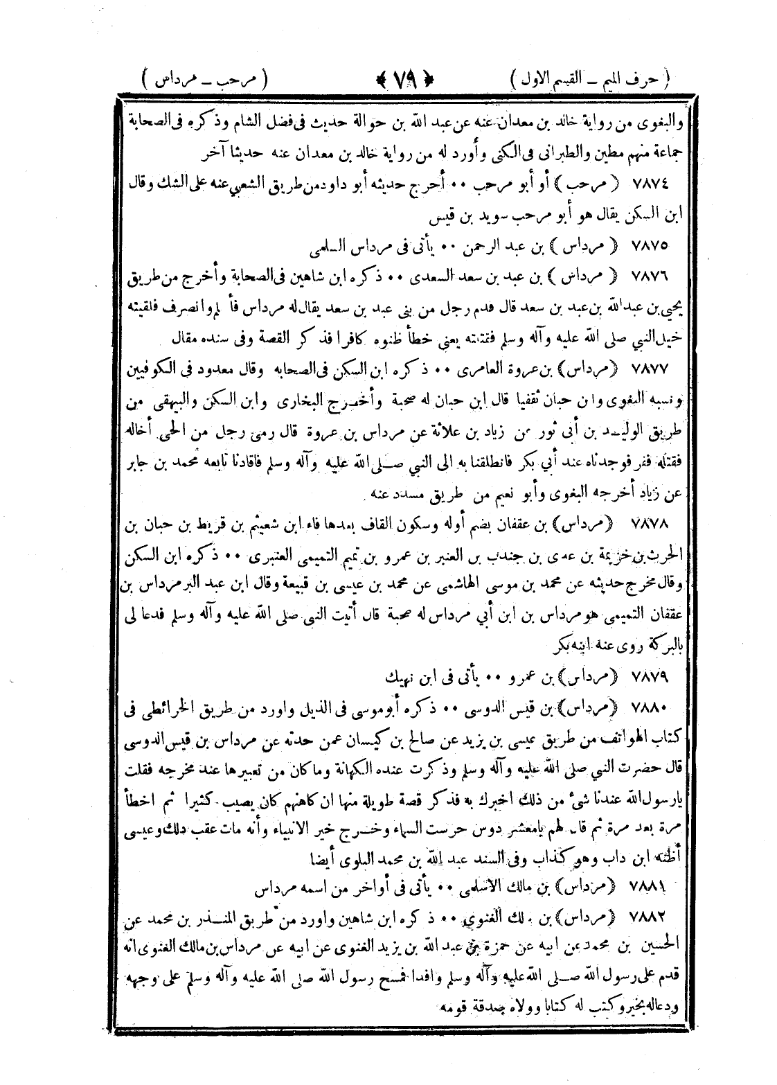 <79> والبغوي من رواية خالد بن معدان عنه عن عبد الله بن حواله حديث في فضل الشام وذكره في الصحابة جماعة منهم مطين والطبراني في الكنى وأورد له من رواية خالد بن معدان عنه حديثا آخر مرحب أو أبو مرحب أخرج حديثه أبو داود من طريق الشعبي عنه على الشك وقال بن السكن يقال هو أبو مرحب سويد بن قيس مرداس بن عبد الرحمن يأتي في مرداس السلمي مرداس بن عبد سعد السعدي ذكره بن شاهين في الصحابة وأخرج من طريق يحيى بن عبد الله بن عبد بن سعد قال قدم رجل من بني عبد بن سعد يقال له مرداس فأسلم وانصرف فلقيته خيل النبي صلى الله عليه وسلم فقتلته يعني خطأ ظنوه كافرا فذكر القصة وفي سنده مقال مرداس بن عروة العامري ذكره بن السكن في الصحابة وقال معدود في الكوفيين ونسبه البغوي وابن حبان ثقفيا قال بن حبان له صحبة وأخرج البخاري وابن السكن والبيهقي من طريق الوليد بن أبي ثور عن زياد بن علاقة عن مرداس بن عروة قال رمى رجل من الحي أخا له فقتله ففر فوجدناه عند أبي بكر فانطلقنا به إلى النبي صلى الله عليه وسلم فأقادنا تابعه محمد بن جابر عن زياد أخرجه البغوي وأبو نعيم من طريق مسدد عنه مرداس بن عقفان بضم أوله وسكون القاف بعدها فاء بن سعيم بن قريط بن جناب بن الحارث بن خزيمة بن عدي بن جندب العنبري بن عمرو بن تميم التميمي العنبري ذكره بن السكن وقال مخرج حديثه عن محمد بن موسى الهاشمي عن محمد بن عيسى بن ميفعة وقال بن عبد البر مرداس بن عقفان التميمي هو مرداس بن أبي مرداس له صحبة قال أتيت النبي صلى الله عليه وسلم فدعا لي بالبركة روى عنه ابنه بكر مرداس بن عمرو يأتي في بن نهيك مرداس بن قيس الدوسي ذكره أبو موسى في الذيل وأورد من طريق بن الخرائطي في كتاب الهواتف من طريق عيسى بن يزيد عن صالح بن كيسان عمن حدثه عن مرداس بن قيس الدوسي قال حضرت النبي صلى الله عليه وسلم وذكرت عنده الكهانة وما كان من تغيرها عند مخرجه فقلت يا رسول الله عندنا شيء من ذلك أخبرك به فذكر قصة طويلة منها أن كاهنهم كان يصيب كثيرا ثم أخطأ مرة بعد مرة ثم قال لهم يا معشر دوس حرست السماء وخرج حبر الأنبياء وإنه مات عقب ذلك وعيسى أظنه بن دأب وهو كذاب وفي السند عبد الله بن محمد البلوي أيضا مرداس بن مالك الأسلمي يأتي في أواخر من اسمه مرداس مرداس بن مالك الغنوي ذكره بن شاهين وأورد من طريق المنذر بن محمد عن الحسين بن محمد عن أبيه عن حمزة بن عبد الله بن يزيد الغنوي عن أبيه عن مرداس بن مالك الغنوي أنه قدم على رسول الله صلى الله عليه وسلم وافدا فمسح رسول الله صلى الله عليه وسلم على وجهه ودعا له بخير وكتب له كتابا وولاه صدقة قومه §