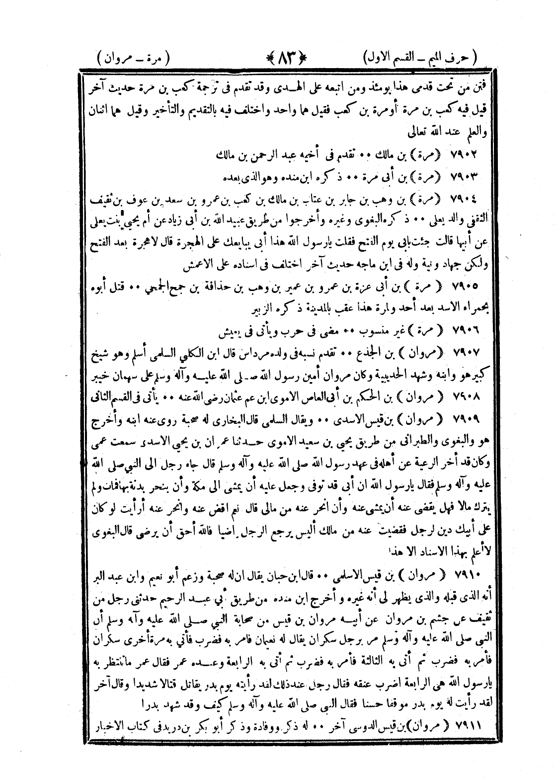 <83> فتن من تحت قدمي هذا يومئذ ومن اتبعه على الهدى وقد تقدم في ترجمة كعب بن مرة حديث آخر قيل فيه كعب بن مرة أو مرة بن كعب فقيل هما واحد واختلف فيه بالتقديم والتأخير وقيل هما اثنان والعلم عند الله تعالى مرة بن مالك تقدم في أخيه عبد الرحمن بن مالك مرة بن أبي مرة ذكره بن منده وهو الذي بعده مرة بن وهب بن جابر بن عتاب بن مالك بن كعب بن عمرو بن سعد بن عوف بن ثقيف الثقفي والد يعلى ذكره البغوي وغيره وأخرجوا من طريق عبيد الله بن أبي زياد عن أم يحيى بنت يعلى عن أبيها قالت جئت بأبي يوم الفتح فقلت يا رسول الله هذا أبي يبايعك على الهجرة قال لا هجرة بعد الفتح ولكن جهاد ونية وله في بن ماجة حديث آخر اختلف في إسناده على الأعمش مرة بن أبي عزة بن عمرو بن عمير بن وهب بن حذافة بن جمح الجمحي قتل أبوه بحمراء الأسد بعد أحد ولمرة هذا عقب بالمدينة ذكره الزبير مرة غير منسوب مضى في حرب ويأتي في يعيش مروان بن الجذع تقدم نسبه في والده مرداس قال بن الكلبي أسلم وهو شيخ كبير هو وابنه وشهد الحديبية وكان مروان أمين رسول الله صلى الله عليه وسلم على سهمان خيبر مروان بن الحكم بن أبي العاص الأموي بن عم عثمان رضي الله عنه يأتي في القسم الثاني مروان بن قيس الأسدي ويقال السلمي قال البخاري له صحبة روى عنه ابنه وأخرج هو والبغوي والطبراني من طريق يحيى بن سعيد الأموي حدثنا عمران بن يحيى الأسدي سمعت عمي وكان قد أخر الرعية عن أهله في عهد رسول الله صلى الله عليه وسلم قال جاء رجل إلى النبي صلى الله عليه وسلم فقال يا رسول الله إن أبي قد توفي وجعل عليه أن يمشي إلى مكة وأن ينحر بدنة فمات ولم يترك مالا فهل يقضي عنه أن يمشى عنه وأن أنحر عنه من مالي قال نعم اقض عنه وانحر عنه أرأيت لو كان على أبيك دين لرجل فقضيت عنه من مالك أليس يرجع الرجل راضيا فالله أحق أن يرضى قال البغوي ولا أعلم بهذا الإسناد إلا هذا مروان بن قيس الأسلمي قال بن حبان يقال إن له صحبة وزعم أبو نعيم وابن عبد البر أنه الذي قبله والذي يظهر لي أنه غيره وأخرج بن منده من طريق أبي عبد الرحيم حدثني رجل من ثقيف عن جشم بن مروان عن أبيه مروان بن قيس من صحابة النبي صلى الله عليه وسلم أن النبي صلى الله عليه وسلم مر برجل سكران يقال له نعيمان فأمر به فضرب فأتي به مرة أخرى سكران فأمر به فضرب ثم أتي به الثالثة فأمر به فضرب ثم أتي به الرابعة وعنده عمر فقال عمر ما تنتظر به يا رسول الله هي الرابعة اضرب عنقه فقال رجل عند ذلك لقد رأيته يوم بدر يقاتل قتالا شديدا وقال آخر لقد رأيت له يوم بدر موقفا حسنا فقال النبي صلى الله عليه وسلم كيف وقد شهد بدرا مروان بن قيس الدوسي آخر له ذكر ووفادة وذكر أبو بكر بن دريد في كتاب الأخبار §