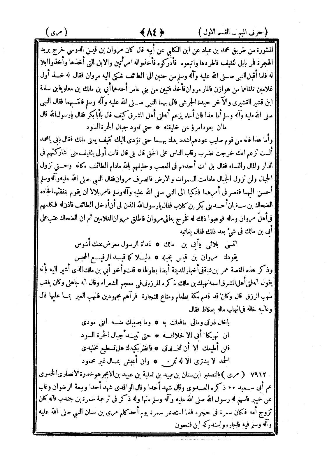 <84> المنثورة من طريق محمد بن عباد عن بن الكلبي عن أبيه قال كان مروان بن قيس الدوسي خرج يريد الهجرة فمر بإبل لثقيف فأطردها واتبعوه فأدركوه فأخذوا له ارمأتين والإبل التي أخذها وأخذوا إبلا له فلما أقبل النبي صلى الله عليه وسلم من حنين إلى الطائف شكا إليه مروان فقال له خذ أول غلامين تلقاهما من هوازن فأغار مروان فأخذ فتيين من بني عامر أحدهما أبي بن مالك بن معاوية بن سلمة بن قشير القشيري والآخر حيدة الجرشي فأتى بهما النبي صلى الله عليه وسلم فانتسبهما فقال النبي صلى الله عليه وسلم أما هذا فإن أخاه يزعم أنه فتى أهل المشرق كيف قال يا أبا بكر فقال يا رسول الله قال ما إن يعود امرؤ عن خليقته حتى تعود جبال الحرة السود وأما هذا فإنه من قوم صليب عودهم اشدد يدك بهما حتى تؤدي إليك ثقيف يعني مالك فقال أبي يا محمد ألست تزعم أنك خرجت تضرب رقاب الناس على الحق قال بلى قال فأنت أولى بثقيف مني شاركتهم في الدار والمال والنساء فقال بل أنت أحدهم في العصب وحليفهم بالله ما دام الطائف مكانه حتى تزول الجبال ولن تزول الجبال ما دامت السماوات والأرض فانصرف مروان فقال النبي صلى الله عليه وسلم أحسن إليهما فقصر في أمرهما فشكيا إلى النبي صلى الله عليه وسلم فأمر بلالا أن يقوم بنفقتهما فجاءه الضحاك بن سفيان أحد بني بكر بن كلاب فقال يا رسول الله ائذن لي أن أدخل إلى الطائف فإذن له فكلمهم في أهل مروان وما له فوهبوا ذلك له فخرج به إلى مروان فأطلق مروان الغلامين ثم إن الضحاك عتب على أبي بن مالك في شيء بعد ذلك فقال يعاتبه أتنسى بلائي يا أبي بن مالك غداة الرسول معرض عنك أشوس يقودك مروان بن قيس بحبله ذليلا كما قيد الرفيع المخيس ذكر هذه القصة عمر بن شبة في أخبار المدينة أيضا بطولها قلت وأخو أبي بن مالك الذي أشير إليه بأنه يقول إنه فتى أهل المشرق اسمه نهيك بن مالك ذكره المرزباني في معجم الشعراء وقال إنه جاهلي وكان يلقب منهب الرزق قال وكان قد قدم مكة بطعام ومتاع للتجارة فرآهم مجهودين فأنهب العير بما عليها قال وعاتبه خاله في إنهاب ماله بعكاظ فقال يا خال ذرني ومالي ما فعلت به وما يصيبك منه إنني مودي إن نهيكا أبي إن خلائقه حتى تبيد جبال الحرة السود فلن أطيعك إلا أن تخلدني فانظر بكيدك هل تسطيع تخليدي الحمد لا يشترى إلا له ثمن ولن أعيش بمال غير محمود مرى بالتصغير بن سنان بن عبيد بن ثعلبة بن عبيد بن الأبجر هو خدرة الأنصاري الخدري عم أبي سعيد ذكره العدوي وقال شهد أحدا وقال الواقدي شهد أحدا وبيعة الرضوان وغاب عن خيبر فأسهم له رسول الله صلى الله عليه وسلم منها وله ذكر في ترجمة سمرة بن جندب فإنه كان تزوج أمه فكان سمرة في حجره فلما استصغر سمرة يوم أحد كلم مري بن سنان النبي صلى الله عليه وسلم فيه فأجازه واستدرك بن فتحون §