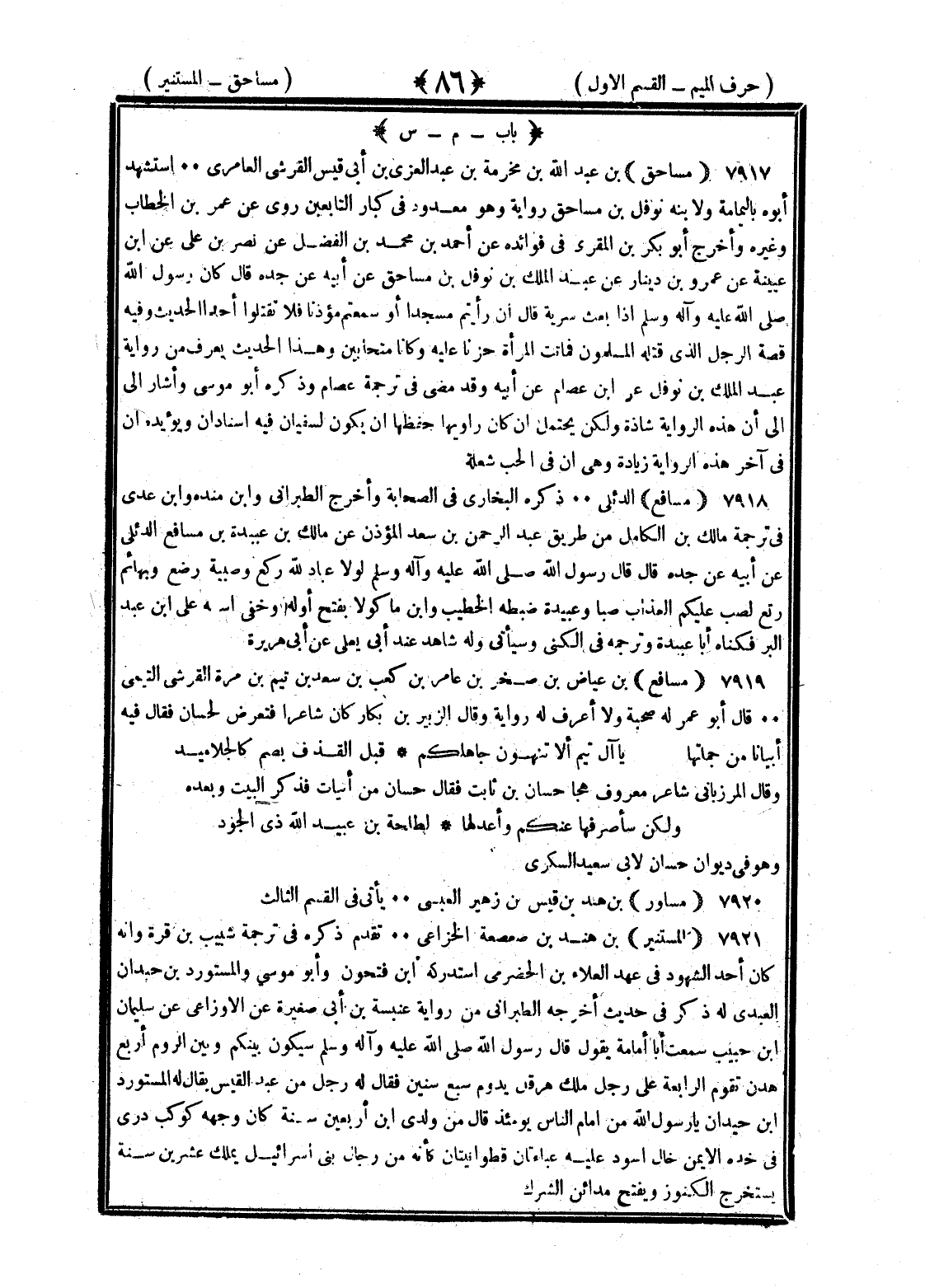 <86> الميم بعدها السين مساحق بن عبد الله بن مخرمة بن عبد العزى بن أبي قيس القرشي العامري استشهده أبوه باليمامة ولابنه نوفل بن مساحق رواية وهو معدود في كبار التابعين روى عن عمر بن الخطاب وغيره وأخرج أبو بكر بن المقري في فوائده عن أحمد بن محمد بن الفضل عن نصر بن علي عن بن عيينة عن عمرو بن دينار عن عبد الملك بن نوفل بن مساحق عن أبيه عن جده قال كان رسول الله صلى الله عليه وسلم إذا بعث سرية قال إن رأيتم مسجدا أو سمعتم مؤذنا فلا تقتلوا أحدا الحديث وفيه قصة الرجل الذي قتله المسلمون فماتت المرأة حزنا عليه وكانا متحابين وهذا الحديث يعرف من رواية عبد الملك بن نوفل عن بن عصام عن أبيه وقد مضى في ترجمة عصام وذكره أبو موسى وأشار إلى أن هذه الرواية شاذة ولكن يحتمل إن كان راويها حفظها أن يكون لسفيان فيه إسنادان ويؤيده أن في آخر هذه الرواية زيادة وهي إن في الحب شعلة مسافع الدئلي ذكره البخاري في الصحابة وأخرج الطبراني وابن منده وابن عدي في ترجمة مالك بن الكامل من طريق عبد الرحمن بن سعد المؤذن عن مالك بن عبيدة بن مسافع الدئلي عن أبيه عن جده قال قال رسول الله صلى الله عليه وسلم لولا عباد لله ركع وصبية رضع وبهائم رتع لصب عليكم العذاب صبا وعبيدة ضبطه الخطيب وابن ماكولا بفتح أوله وخفي اسمه على بن عبد البر فكناه أبا عبيدة وترجمه في الكنى وسيأتى وله شاهد عند أبي يعلى عن أبي هريرة مسافع بن عياض بن صخر بن عامر بن كعب بن سعد بن تيم بن مرة القرشي التيمي قال أبو عمر له صحبة ولا أعرف له رواية وقال الزبير بن بكار كان شاعرا فتعرض لحسان فقال فيه أبياتا من جملتها يا آل تيم الا تنهون جاهلكم قبل القذاف بصم كالجلاميد وقال المرزباني شاعر معروف هجا حسان بن ثابت فقال حسان من أبيات فذكر البيت وبعده ولكن سأصرفها عنكم وأعدلها لطلحة بن عبيد الله ذي الجود وهو في ديوان حسان لأبي سعيد السكري مساور بن هند بن قيس بن زهير العبسي يأتي في القسم الثالث المستنير بن أبي صعصعة الخزاعي تقدم ذكره في ترجمة شبيب بن قرة وأنه كان أحد الشهود في عهد العلاء بن الحضرمي واستدركه بن فتحون وأبو موسى المستورد بن حيلان العبدي له ذكر في حديث أخرجه الطبراني من رواية عنبسة بن أبي صغيرة عن الأوزاعي عن سليمان بن حبيب سمعت أبي أمامة يقول قال رسول الله صلى الله عليه وسلم سيكون بينكم وبين الروم أربع مدن تقوم الرابعة على رجل ملك هرقل يدوم سبع سنين فقال له رجل من عبد القيس يقال له المستورد بن حيلان يا رسول الله من إمام الناس يومئذ قال من ولدي بن أربعين سنة كأن وجهه كوكب دري في خده الأيمن خال أسود عليه عبائتان قطوانيتان كأنه من رجلا بني إسرائيل يملك عشرين سنة يستخرج الكنوز وبفتح مدائن الشرك §