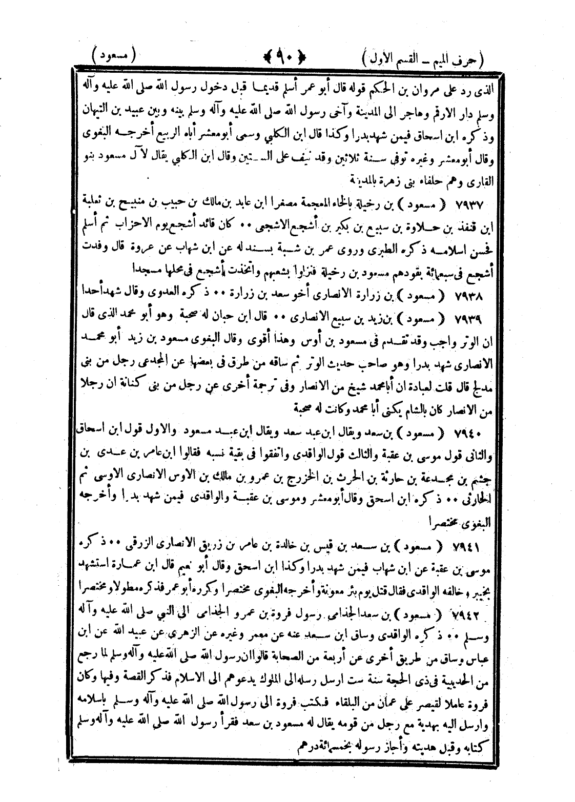 <90> الذي رد على مروان بن الحكم قوله قال أبو عمر أسلم قديما قبل دخول رسول الله صلى الله عليه وسلم دار الأرقم وهاجر إلى المدينة وآخى رسول الله صلى الله عليه وسلم بينه وبين عبيد بن التيهان وذكره بن إسحاق فيمن شهد بدرا وكذا قال بن الكلبي وسمى أبو معشر أباه الربيع أخرجه البغوي وقال أبو معشر وغيره توفي سنة ثلاثين وقد نيف على الستين وقال بن الكلبي يقال لآل مسعود بنو القارئ وهم حلفاء بني زهرة بالمدينة مسعود بن رخيلة بالخاء المعجمة مصغرا بن عائذ بن مالك بن حبيب بن نبيح بن ثعلبة بن قنفد بن خلاوة بن سبيع بن بكر بن أشجع الأشجعي كان قائد أشجع يوم الأحزاب ثم أسلم فحسن إسلامه ذكره الطبري وروى عمر بن شبه بسند له عن بن شهاب عن عروة قال وفدت أشجع في سبعمائة يقودهم مسعود بن رخيلة فنزلوا بشعبهم واتخذت أشجع في محلها مسجدا مسعود بن زرارة الأنصاري أخو سعد بن زرارة ذكره العدوي وقال شهد أحدا مسعود بن زيد بن سبيع الأنصاري قال بن حبان له صحبة وهو أبو محمد الذي قال إن الوتر واجب وقد تقدم في مسعود بن أوس وهذا أقوى وقال البغوي مسعود بن زيد أبو محمد الأنصاري شهد بدرا وهو صاحب حديث الوتر ثم ساقه من طرق في بعضها عن المجدعي رجل من بني مدلج قال قلت لعبادة إن أبا محمد شيخ من الأنصار وفي ترجمة أخرى عن رجل من بني كنانة أن رجلا من الأنصار كان بالشام يكنى أبا محمد وكانت له صحبة مسعود بن سعد ويقال بن عبد سعد ويقال بن عبد مسعود والأول قول بن إسحاق والثاني قول موسى بن عقبة والثالث قول الواقدي واتفقوا في بقية نسبه فقالوا بن عامر بن عدي بن جشم بن مجدعة بن حارثة بن الحارث بن الخزرج بن عمرو بن مالك بن الأوس الأنصاري الأوسي ثم الحارثي ذكره بن إسحاق وأبو معشر وموسى بن عقبة فيمن شهد بدرا وأخرجه البغوي مختصرا مسعود بن سعد بن قيس بن خلدة بن عامر بن زريق الأنصاري الزرقي ذكره موسى بن عقبة عن بن شهاب فيمن شهد بدرا وكذا بن إسحاق وقال أبو نعيم قال بن عمارة استشهد بخيبر وخالفه الواقدي فقال قتل يوم بئر معونة وأخرجه البغوي مختصرا وكرره أبو عمر فذكره مطولا ومختصرا مسعود بن سعد الجذامي رسول فروة بن عمرو الجذامي إلى النبي صلى الله عليه وسلم ذكره الواقدي وساق بن سعد عنه عن معمر وغيره عن الزهري عن عبيد الله عن بن عباس وساق من طريق أخرى عن أربعة من الصحابة قالوا إن رسول الله صلى الله عليه وسلم لما رجع من الحديبية في ذي الحجة سنة ست أرسل رسله إلى الملوك يدعوهم إلى الإسلام فذكر القصة وفيها فكان فروة عاملا لقيصر على عمان من البلقاء فكتب فروة إلى رسول الله صلى الله عليه وسلم بإسلامه وأرسل إليه بهدية مع رجل من قومه يقال له مسعود بن سعد فقرأ رسول الله صلى الله عليه وسلم كتابه وقبل هديته وأجاز رسوله بخمسمائة درهم §