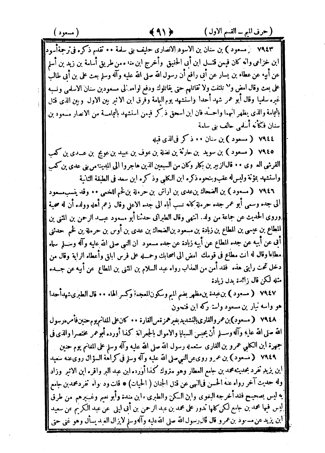 <91> مسعود بن سنان بن الأسود الأنصاري حليف بني سلمة تقدم ذكره في ترجمة أسود بن خزاعي وأنه كان فيمن قتل بن أبي الحقيق وأخرج بن منده من طريق أسامة بن زيد بن أسلم عن أبيه عن عطاء بن يسار عن أبي رافع أن رسول الله صلى الله عليه وسلم بعث علي بن أبي طالب على بعث وقال امض ولا تلتفت ولا تقاتلهم حتى يقاتلوك ودفع لواء إلى مسعود بن سنان الأسلمي ونسبه غيره سلميا وقال أبو عمر شهد أحدا واستشهد يوم اليمامة وفرق بن الأثير بين الأول وبين الذي قتل باليمامة والذي يظهر أنهما واحد فإن بن إسحاق ذكر فيمن استشهد باليمامة من الأنصار مسعود بن سنان فكأنه أسلمي حالف بني سلمة مسعود بن سنان ذكر في الذي قبله مسعود بن سويد بن حارثة بن نضلة بن عوف بن عبيد بن عويج بن عدي بن كعب القرشي العدوي قال الزبير بن بكار كان من السبعين الذين هاجروا إلى المدينة من بني عدي بن كعب واستشهد بمؤتة وليس له عقب وبنحوه ذكره بن سعد في الطبقة الثانية مسعود بن الضحاك بن عدي بن أراش بن حرملة بن لخم اللخمي وقد ينسب مسعود إلى جده وسمي أبو عمر جده حرملة كأنه نسب أباه إلى جده الأعلى وقال زعم أهله وولده أن له صحبة وروى الحديث عن جماعة من ولده انتهى وقال الطبراني حدثنا أبو مسعود عبد الرحمن بن المثنى بن المطاع بن عيسى بن المطاع بن زيادة بن مسعود بن الضحاك بن عدي بن أوس بن حرملة بن لخم حدثني أبي عن أبيه عن جده المطاع عن أبيه زيادة عن جده مسعود أن النبي صلى الله عليه وسلم سماه مطاعا وقال له أنت مطاع في قومك امض إلى أصحابك وحمله على فرس أبلق وأعطاه الراية وقال من دخل تحت رايتي هذه فقد أمن من العذاب رواه عبد السلام بن المثنى بن المطاع عن أبيه عن جده مثله لكن قال زائدة بدل زيادة مسعود بن عبدة بن مظهر بضم الميم وسكون المعجمة وكسر الهاء قال الطبري شهد أحدا هو وابنه نيار بن مسعود واستدركه بن فتحون وأبو موسى مسعود بن عمرو القارئ بالتشديد بغير همزة من القارة كان على المغانم يوم حنين فأمره رسول الله صلى الله عليه وسلم أن يحبس السبايا والأموال بالجعرانة وكذا أورده أبو عمر مختصرا والذي في جمهرة بن الكلبي عمرو بن القاري واستعمله رسول الله صلى الله عليه وسلم على المغانم يوم حنين مسعود بن عمرو روى عن النبي صلى الله عليه وسلم في كراهة السؤال روى عنه سعيد بن يزيد تفرد بحديثه محمد بن جامع العطار وهو متروك كذا أورده بن عبد البر وأقره بن الأثير وزاد وله حديث آخر رواه عنه الحسن في النهي عن قتل الحيات قلت ودعواه تفرد محمد بن جامع به ليس بصحيح فقد أخرجه البغوي وابن السكن والطبراني وابن منده وأبو نعيم وغيرهم من طرق ليس فيها محمد بن جامع لكن كلها تدور على محمد بن عبد الرحمن بن أبي ليلى عن عبد الكريم عن سعيد بن يزيد عن مسعود بن عمرو قال قال رسول الله صلى الله عليه وسلم لا يزال العبد يسأل وهو غني حتى §