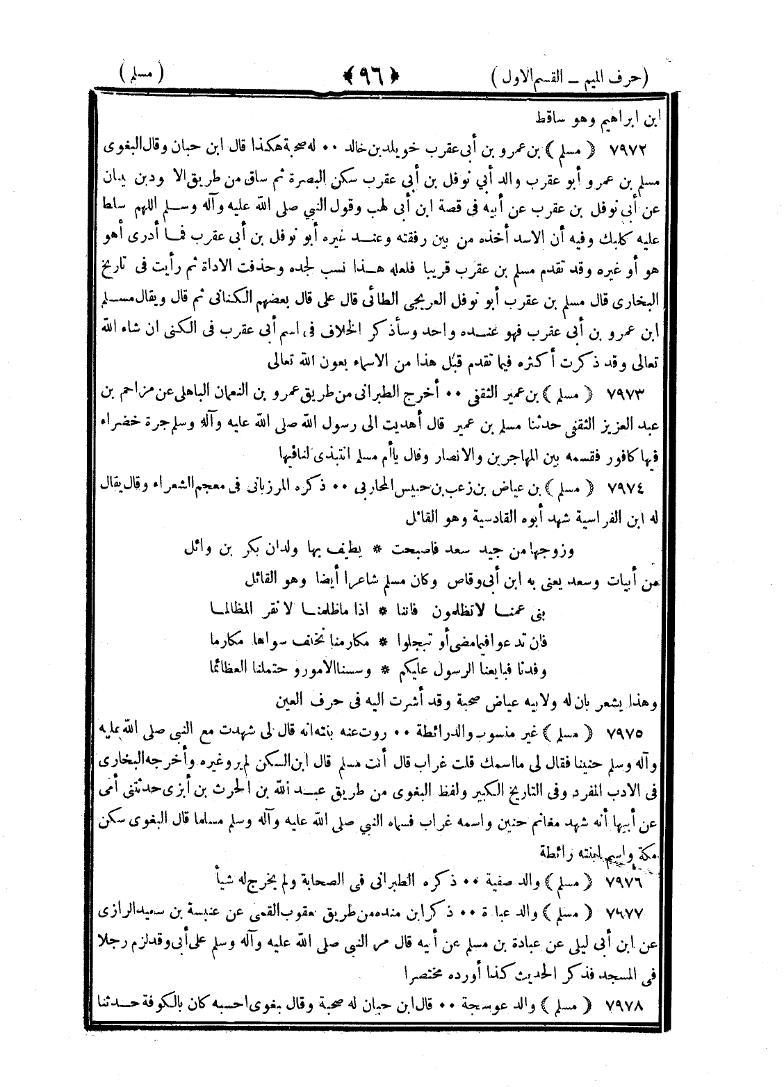 <96> بن إبراهيم وهو ساقط مسلم بن عمرو بن أبي عقرب خويلد بن خالد له صحبة هكذا قال بن حبان وقال البغوي مسلم بن عمرو أبو عقرب والد أبي نوفل بن أبي عقرب سكن البصرة ثم ساق من طريق الأسود بن شيبان عن أبي نوفل بن عقرب عن أبيه في قصة بن أبي لهب وقول النبي صلى الله عليه وسلم اللهم سلط عليه كلبك وفيه إن الأسد أخذه من بين رفقته وعند غيره أبو نوفل بن أبي عقرب فما أدري أهو هو أو غيره وقد تقدم مسلم بن عقرب قريبا فلعل هذا النسب لجده وحذفت الأداة ثم رأيت في تاريخ البخاري قال مسلم بن عقرب أبو نوفل العريحي الطائي قال علي قال بعضهم الكناني ثم قال ويقال مسلم بن عمرو بن أبي عقرب فهو عنده واحدا وسأذكر الخلاف في اسم أبي عقرب في الكنى إن شاء الله تعالى وقد ذكرت أكثره فيما تقدم قبل هذا من الأسماء بعون الله تعالى مسلم بن عمير الثقفي أخرج الطبراني من طريق عمرو بن النعمان الباهلي عن مزاحم بن عبد العزيز الثقفي حدثنا مسلم بن عمير قال أهديت إلى رسول الله صلى الله عليه وسلم جرة خضراء فيها كافور فقسمة بين المهاجرين والأنصار وقال يا أم مسلم انتبذي لنا فيها مسلم بن عياض بن رغب بن حبيب المحاربي ذكره المرزباني في معجم الشعراء وقال يقال له بن الراسبية شهد أبوه القادسية وهو القائل وزوجتها من جند سعد فأصبحت يطيف بها ولدان بكر بن وائل من أبيات وسعد يعني به بن أبي وقاص وكان مسلم شاعرا أيضا وهو القائل بني عمنا لا تظلمونا فإننا إذا ما ظلمنا لا نقر المظالما فإن تدعوا فيما مضى أو تبخلوا مكارمنا نخلف سواها مكارما وفدنا فبايعنا الرسول عليكم وسسنا الأمور واحتملنا العظائما وهذا يشعر بأن له ولأبيه عياض صحبة وقد أشرت إليه في حرف العين مسلم غير منسوب والد ريطة روت عنه بنته أنه قال شهدت مع النبي صلى الله عليه وسلم حنينا فقال لي ما اسمك قلت غراب قال أنت مسلم قال بن السكن لم يرو غيره وأخرجه البخاري في الأدب المفرد وفي التاريخ الكبير ولفظ البغوي من طريق عبد الله بن الحارث بن أبزى حدثتني أمي عن أبيها أنه شهد مغانم حنين واسمه غراب فسماه النبي صلى الله عليه وسلم مسلما قال البغوي سكن مكة واسم ابنته ريطة وقال أبو عمر مسلم والد صفية ذكره الطبراني في الصحابة ولم يخرج له شيئا مسلم والد عباد ذكر بن منده من طريق يعقوب القمي عن عنبسة بن سعيد الرازي عن أبي ليلى عن عباد بن مسلم عن أبيه قال مر النبي صلى الله عليه وسلم على أبي وقد لزم رجلا في المسجد فذكر الحديث كذا أورده مختصرا مسلم والد عوسجة قال بن حبان له صحبة وقال البغوي أحسبه كان بالكوفة حدثنا §