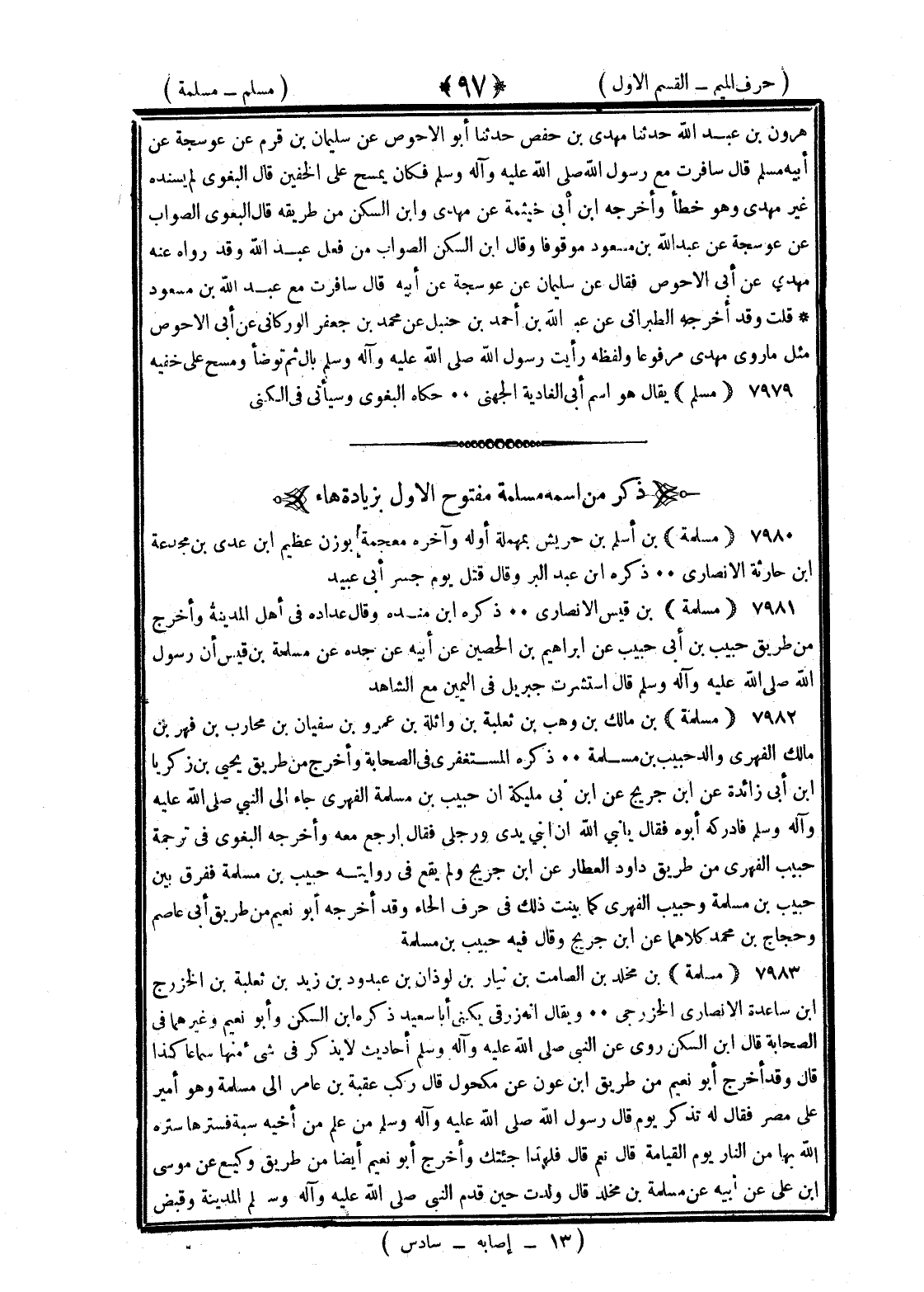 <97> هارون بن عبد الله حدثنا مهدي بن حفص حدثنا أبو الأحوص عن سليمان بن قرم عن عوسجة عن أبيه مسلم قال سافرت مع رسول الله صلى الله عليه وسلم فكان يمسح على الخفين قال البغوي لم يسنده غير مهدي وهو خطأ وأخرجه بن أبي خيثمة عن مهدي وابن السكن من طريقه قال البغوي الصواب عن عوسجة عن عبد الله بن مسعود موقوفا وقال بن السكن الصواب من فعل عبد الله وقد رواه عنه مهدي عن أبي الأحوص فقال عن سليمان عن عوسجة عن أبيه قال سافرت مع عبد الله بن مسعود قلت وقد أخرجه الطبراني عن عبد الله بن أحمد بن حنبل عن محمد بن جعفر الوركاني عن أبي الأحوص مثل ما روى مهدي مرفوعا ولفظه رأيت رسول الله صلى الله عليه وسلم بال ثم توضأ وسمح على خفيه مسلم يقال هو اسم أبي الغادية الجهني حكاه البغوي وسيأتي في الكنى ذكر من اسمه مسلمة مفتوح الأول بزيادة هاء مسلمة بن أسلم بن حريش بمهملة أوله وآخره معجمة بوزن عظيم بن عدي بن مجدعة بن حارثة الأنصاري ذكره بن عبد البر وقال قتل يوم جسر أبي عبيد مسلمة بن قيس الأنصاري ذكره بن منده وقال عداده في أهل المدينة وأخرج من طريق حبيب بن أبي حبيب عن إبراهيم بن الحصين عن أبيه عن جده عن مسلمة بن قيس أن رسول الله صلى الله عليه وسلم قال استشرت جبريل في اليمين مع الشاهد مسلمة بن مالك بن وهب بن ثعلبة بن وائلة بن عمرو بن شيبان بن محارب بن فهر بن مالك الفهري والد حبيب بن مسلمة ذكره المستغفري في الصحابة وأخرج من طريق يحيى بن زكريا بن أبي زائدة عن بن جريج عن بن أبي مليكة أن حبيب بن مسلمة الفهري جاء إلى النبي صلى الله عليه وسلم فأدركه أبوه فقال يا نبي الله إن ابني يدي ورجلي فقال ارجع معه وأخرجه البغوي في ترجمة حبيب الفهري من طريق داود العطار عن بن جريج ولم يقع في روايته حبي بن مسلمة ففرق بين حبيب بن مسلمة وحبيب الفهري كما بينت ذلك في حرف الحاء وقد أخرجه أبو نعيم من طريق أبي عاصم وحجاج بن محمد كلاهما عن بن جريج وقال فيه حبيب بن مسلمة مسلمة بن مخلد بن الصامت بن نيار بن لوذان بن عبد ود بن زيد بن ثعلبة بن الخزرج بن ساعدة الأنصاري الخزرجي ويقال زرقي يكنى أبا سعيد ذكره بن السكن وأبو نعيم وغيرهما في الصحابة قال بن السكن روى عن النبي صلى الله عليه وسلم أحاديث لا يذكر في شيء منها سماعا كذا قال وقد أخرج أبو نعيم من طريق بن عون عن مكحول قال ركب عقبة بن عامر إلى مسلمة وهو أمير على مصر فقال له تذكر يوم قال رسول الله صلى الله عليه وسلم من علم من أخيه سبة فسترها ستره الله بها من النار يوم القيامة قال نعم قال فلهذا آخيتك وأخرج أبو نعيم أيضا من طريق وكيع عن موسى بن علي عن أبيه عن مسلمة بن مخلد قال ولدت حين قدم النبي صلى الله عليه وسلم المدينة وقبض §