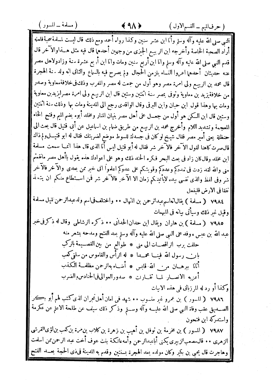 <98> النبي صلى الله عليه وسلم وأنا بن عشر سنين وكذا رواه أحمد ومع ذلك قال ليست لمسلمة صحبة فلعله أراد الصحبة الخاصة وأخرجه بن الربيع الجيزي من وجهين أحدهما قال فيه مثل هذا والآخر قال قدم النبي صلى الله عليه وسلم وأنا بن أربع سنين ومات وأنا بن أربع عشرة سنة وزاد ولأهل مصر عنه حديثان أحدهما أغروا النساء يلزمن الحجال ولم يصرح فيه بالسماع والثاني أنه ولد سنة الهجرة قال محمد بن الربيع ولي إمرة مصر وهو أول من جمعت له مصر والمغرب وذلك في خلافة معاوية وصدر من خلافة يزيد بن معاوية وتوفي بمصر سنة اثنتين وستين وقال بن الربيع ولي إمرة مصر ليزيد بن معاوية ومات بها وهذا قول بن حبان وابن البرقي وقال الواقدي رجع إلى المدينة ومات بها وذلك سنة اثنتين وستين وقال بن السكن هو أول من جعل على أهل مصر بنيان المنار ومخلد أبو بضم الميم وفتح الخاء العجمة وتشديد اللام وأخرج محمد بن الربيع من طريق ضمام بن إسماعيل عن أبي قبيل قال بعث إلى حنظلة يعني أمير مصر فقال شيخ لو كان في جسدك للسوط موضع لضربتك فقال له أبو قبيل ولم ذاك قال صرت كاهنا تقول الآخر فالآخر شر فقال له أبو قبيل ليس أنا الذي قلت هذا إنما سمعته من مسلمة بن مخلد وقد قال وكان زاد في بعث البحر فكره الجند ذلك وهو على أعوادك هذه يقول يا أهل مصر ما نقمتم مني والله لقد زدت مددكم وعددكم وقوتكم على عدوكم اعلموا أني خير ممن بعدي والآخر فالآخر شر وفي لفظ والذي نفسي بيده لا يأتينكم زمان إلا الآخر فالآخر شر فمن استطاع منكم أن يتخذ نفقا في الأرض فليفعل مسلمة يقال إنه اسم عبد الرحمن بن المنهال واختلف في اسم ولد عبد الرحمن فقيل مسلمة وقيل غير ذلك وسيأتي بيانه في المبهمات مسلية بن هزان ويقال بن حدان الحداني ذكره الرشاطي وقال له ذكر في خبر عبد الله بن علس ووفد على النبي صلى الله عليه وسلم بعد الفتح ومدحه بشعر منه حلفت برب الراقصات إلى منى طوالع من بين القصيمة بالركب بأن رسول الله فينا محمد له الرأس والقدموس من سلفي كعب أتانا ببرهان من الله قابس أضاء به الرحمن من ظلمة الكرب أعز به الأنصار لما تقارنت صدور العوالي في الحنادس والضرب وكذا أورد له المرزباني في هذه الأبيات المسور بن عمرو غير منسوب شهد في أمان أهل نجران الذي كتب لهم أبو بكر الصديق عقب وفاة النبي صلى الله عليه وسلم وذكر ذلك سيف عن طلحة الأعلم عن عكرمة واستدركه بن فتحون المسور بن مخرمة بن نوفل بن أهيب بن زهرة بن كلاب بن مرة بن كعب بن لؤي القرشي الزهري قال مصعب الزبيري يكنى أبا عبد الرحمن وأمه عاتكة بنت عوف أخت عبد الرحمن ممن أسملت وهاجرت قال يحيى بن بكير وكان مولده بعد الهجرة بسنتين وقدم المدينة في ذي الحجة بعد الفتح §