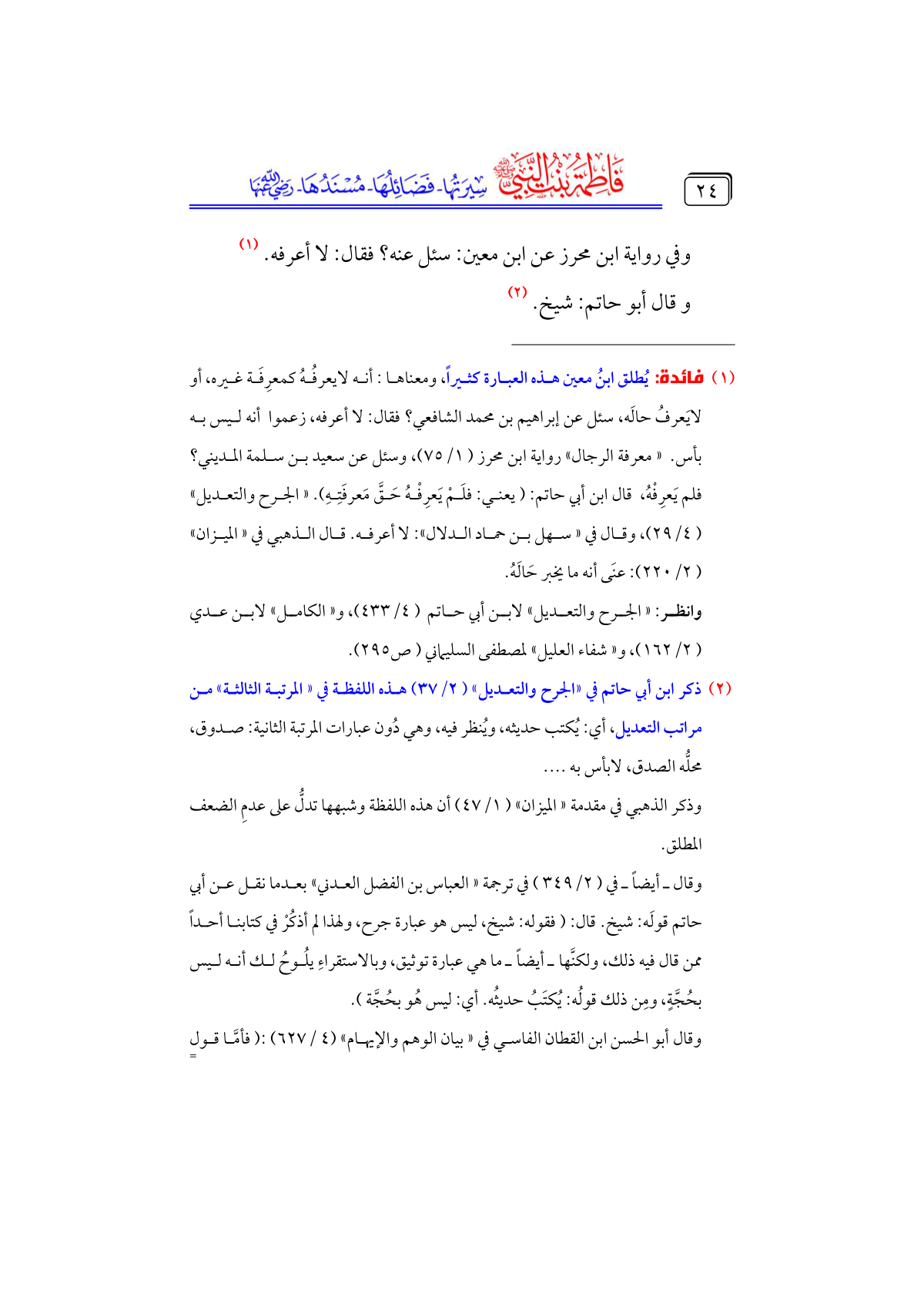 (¬١) فائدة: يُطلق ابنُ معين هذه العبارة كثيراً، ومعناها: أنه لايعرفُهُ كمعرِفَة غيره، أو لايَعرفُ حالَه، سئل عن إبراهيم بن محمد الشافعي؟ فقال: لا أعرفه، زعموا أنه ليس به بأس. «معرفة الرجال» رواية ابن محرز (١/ ٧٥)، وسئل عن سعيد بن سلمة المديني؟ فلم يَعرِفْهُ، قال ابن أبي حاتم: (يعني: فلَمْ يَعرِفْهُ حَقَّ مَعرفَتِهِ). «الجرح والتعديل» ... (٤/ ٢٩)، وقال في «سهل بن حماد الدلال»: لا أعرفه. قال الذهبي في «الميزان» ... (٢/ ٢٢٠): عنَى أنه ما يخبر حَالَهُ.