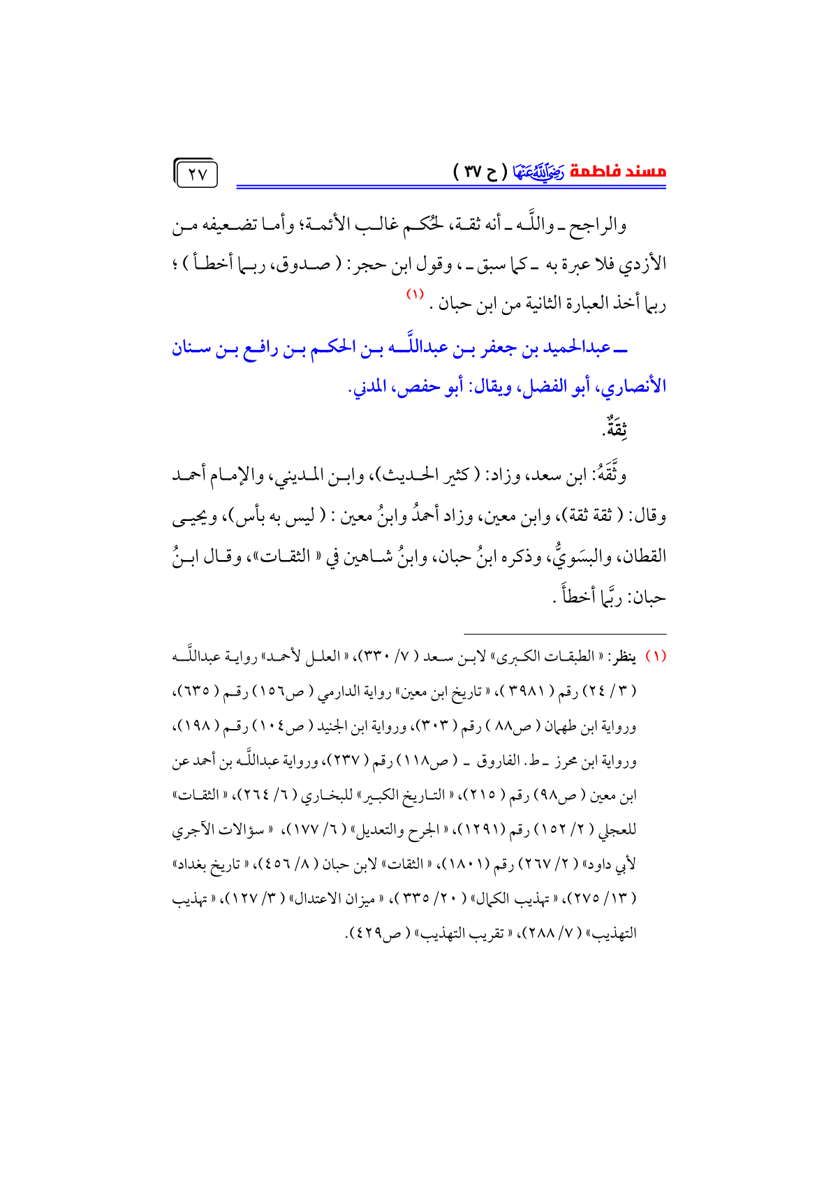 والراجح ـ واللَّه ـ أنه ثقة، لحُكم غالب الأئمة؛ وأما تضعيفه من الأزدي فلا عبرة به ـ كما سبق ـ، وقول ابن حجر: (صدوق، ربما أخطأ)؛ ربما أخذ العبارة الثانية من ابن حبان. (¬١)