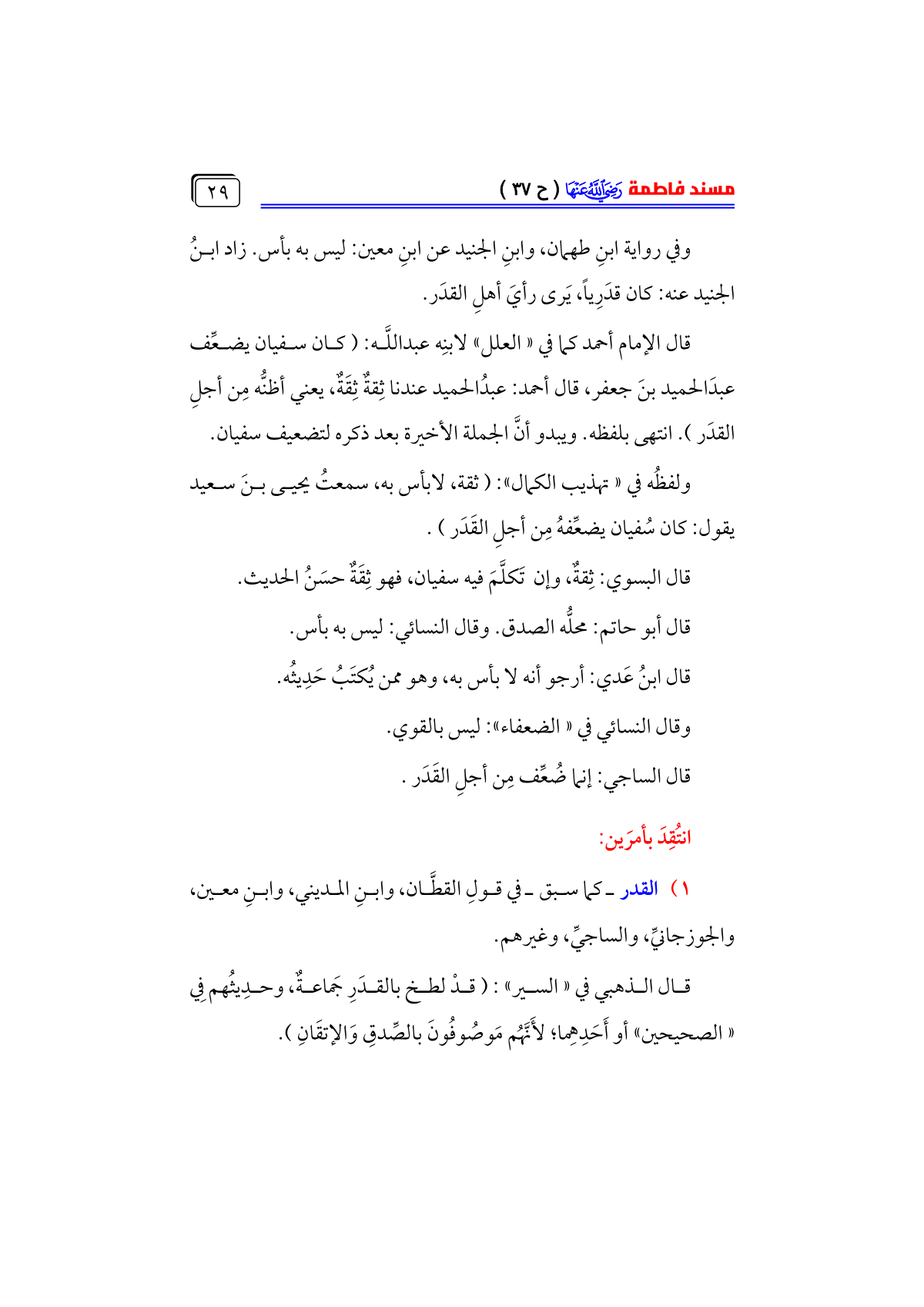 ولفظُه في «تهذيب الكمال»: (ثقة، لابأس به، سمعتُ يحيى بنَ سعيد يقول: كان سُفيان يضعِّفهُ مِن أجلِ القَدَر).