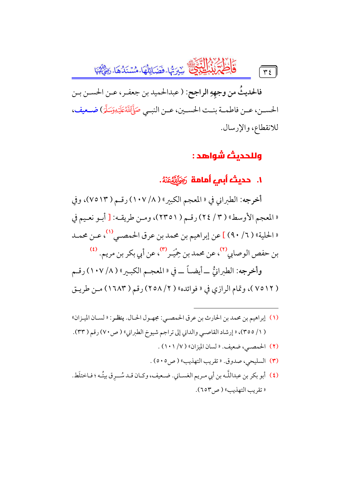 (¬١) إبراهيم بن محمد بن الحارث بن عرق الحمصي: مجهول الحال. ينظر: «لسان الميزان» ... (١/ ٣٥٥)، «إرشاد القاصي والداني إلى تراجم شيوخ الطبراني» (ص ٧٠) رقم (٣٣).