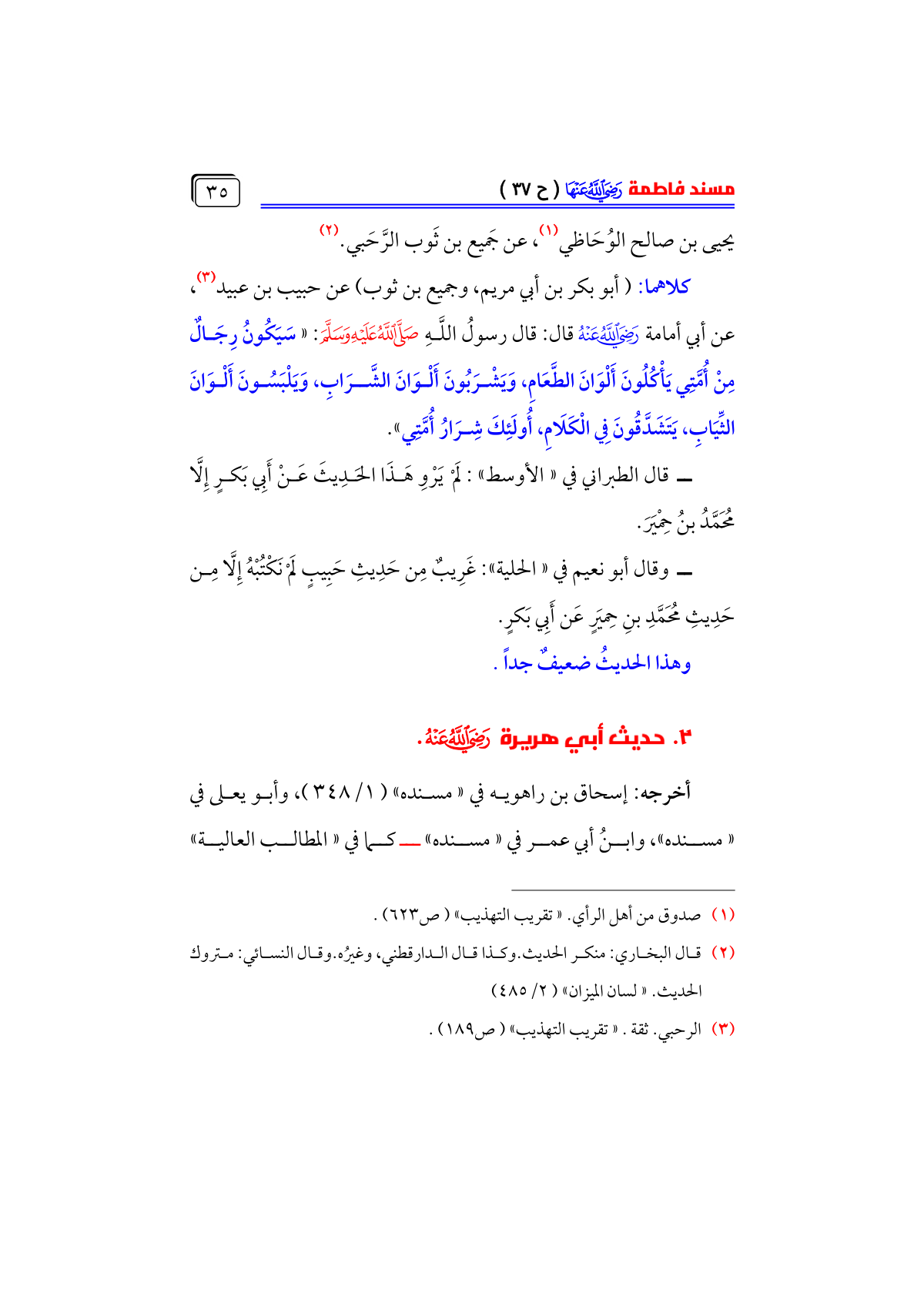 ــ وقال أبو نعيم في «الحلية»: غَرِيبٌ مِن حَدِيثِ حَبِيبٍ لَمْ نَكْتُبْهُ إِلَّا مِن حَدِيثِ مُحَمَّدِ بنِ حِميَرٍ عَن أَبِي بَكرٍ.