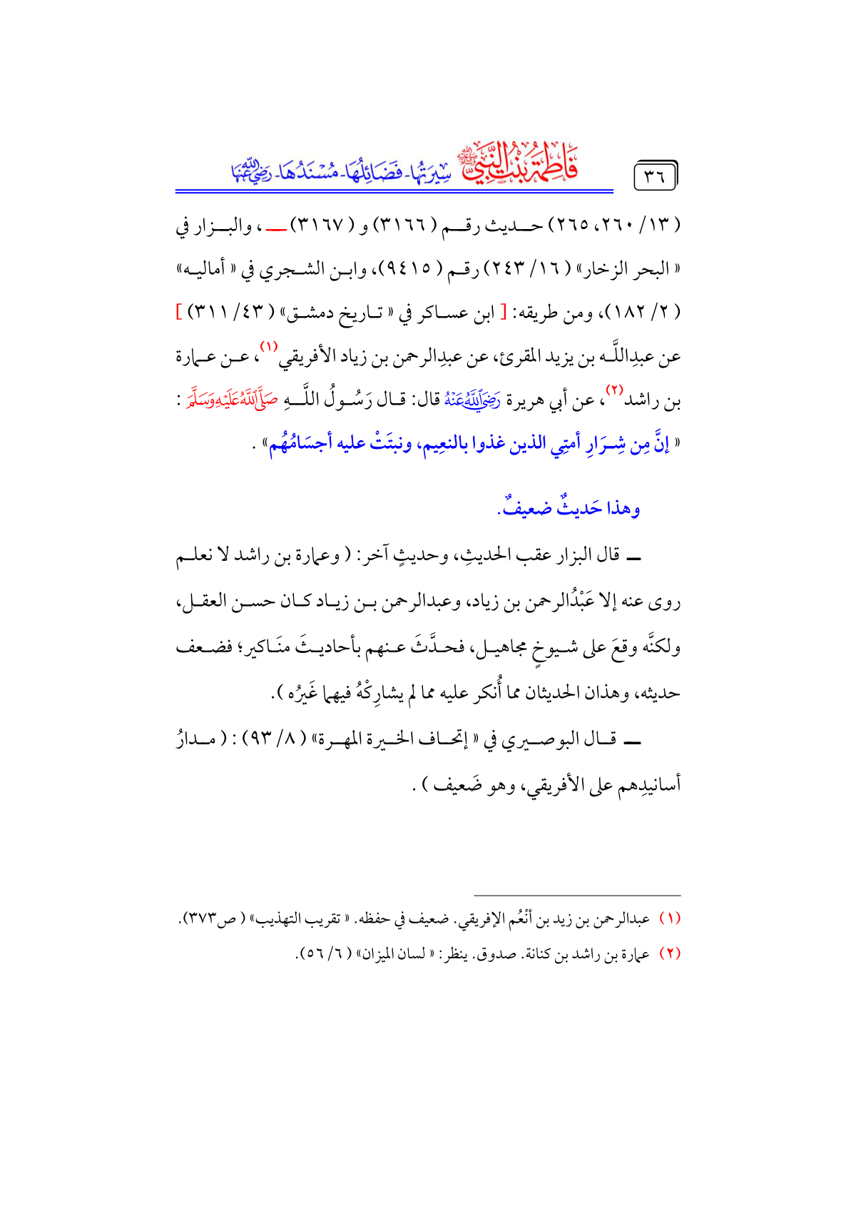 (١٣/ ٢٦٠، ٢٦٥) حديث رقم (٣١٦٦) و (٣١٦٧) ـ، والبزار في ... «البحر الزخار» (١٦/ ٢٤٣) رقم (٩٤١٥)، وابن الشجري في «أماليه» ... (٢/ ١٨٢)، ومن طريقه: [ابن عساكر في «تاريخ دمشق» (٤٣/ ٣١١)] عن عبدِاللَّه بن يزيد المقرئ، عن عبدِالرحمن بن زياد الأفريقي (¬١)، عن عمارة بن راشد (¬٢)، عن أبي هريرة - رضي الله عنه - قال: قال رَسُولُ اللَّهِ - صلى الله عليه وسلم -: ... «إنَّ مِن شِرَارِ أمتِي الذين غذوا بالنعِيم، ونبتَتْ عليه أجسَامُهُم».