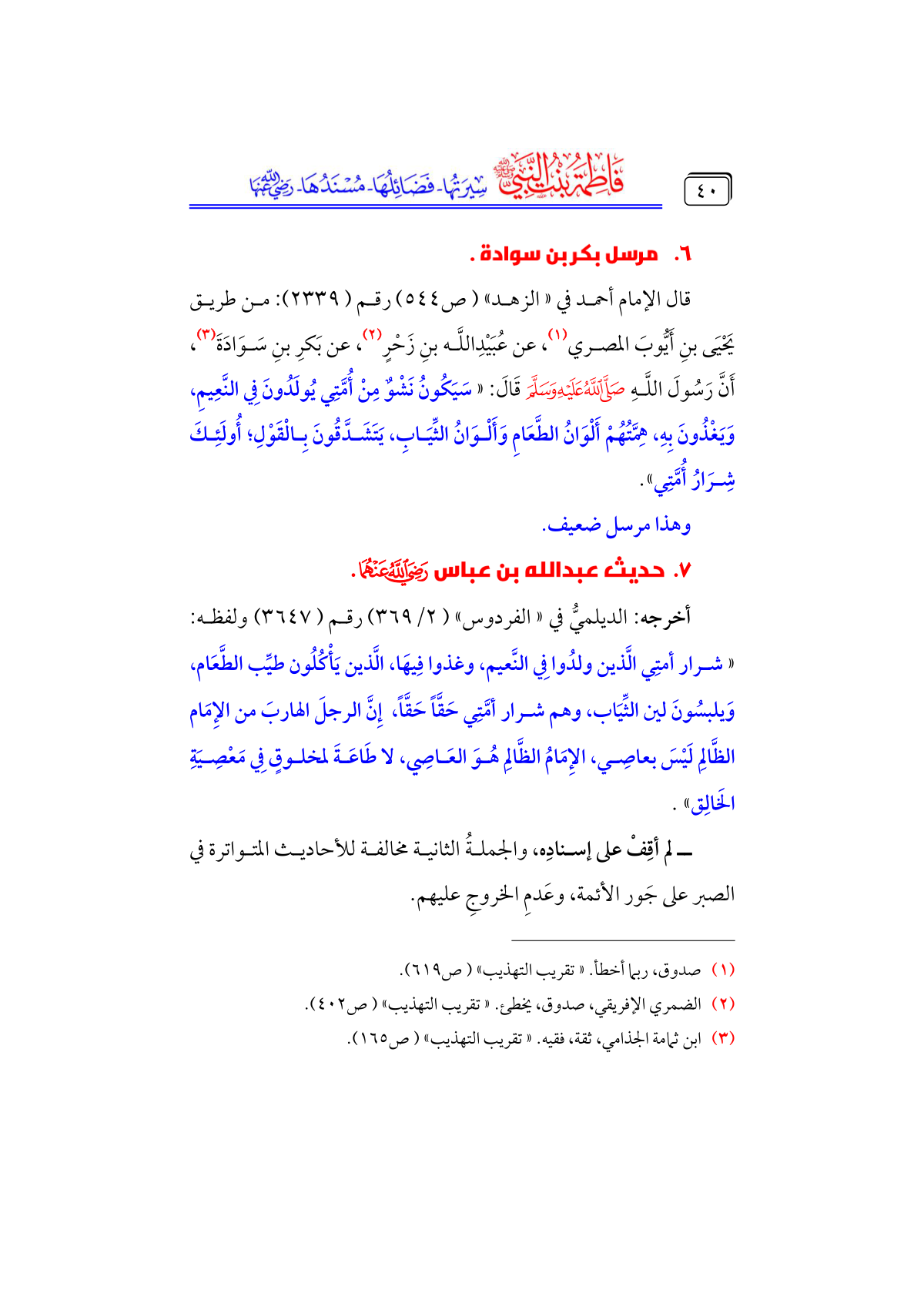 قال الإمام أحمد في «الزهد» (ص ٥٤٤) رقم (٢٣٣٩): من طريق يَحْيَى بنِ أَيُّوبَ المصري (¬١)، عن عُبَيْدِاللَّه بنِ زَحْرٍ (¬٢)، عن بَكرِ بنِ سَوَادَةَ (¬٣)، أَنَّ رَسُولَ اللَّهِ - صلى الله عليه وسلم - قَالَ: «سَيَكُونُ نَشْوٌ مِنْ أُمَّتِي يُولَدُونَ فِي النَّعِيمِ، وَيَغْذُونَ بِهِ، هِمَّتُهُمْ أَلْوَانُ الطَّعَامِ وَأَلْوَانُ الثِّيَابِ، يَتَشَدَّقُونَ بِالْقَوْلِ؛ أُولَئِكَ شِرَارُ أُمَّتِي».