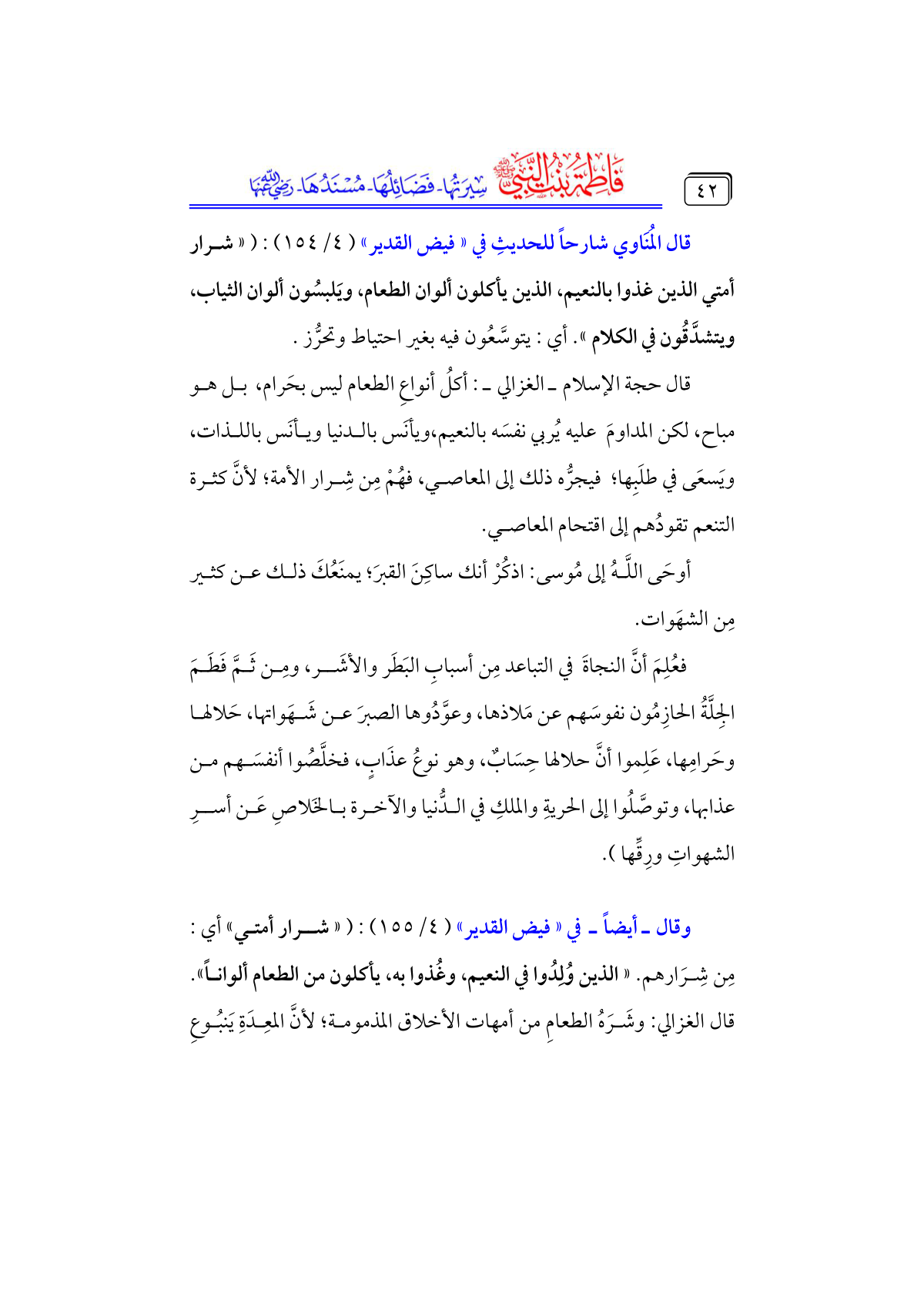 وقال ـ أيضاً ـ في «فيض القدير» (٤/ ١٥٥): («شرار أمتي» أي: مِن شِرَارهم. «الذين وُلِدُوا في النعيم، وغُذوا به، يأكلون من الطعام ألواناً». قال الغزالي: وشَرَهُ الطعامِ من أمهات الأخلاق المذمومة؛ لأنَّ المعِدَةِ يَنبُوعِ