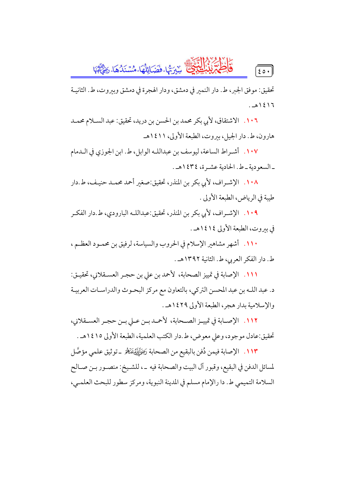• الإصابة فيمن دُفن بالبقيع من الصحابة - رضي الله عنهم - ـ توثيق علمي مؤصَّل لمسائل الدفن في البقيع، وقبور آل البيت والصحابة فيه ـ، للشيخ: منصور بن صالح السلامة التميمي ط. دا رالإمام مسلم في المدينة النبوية، ومركز سطور للبحث العلمي،