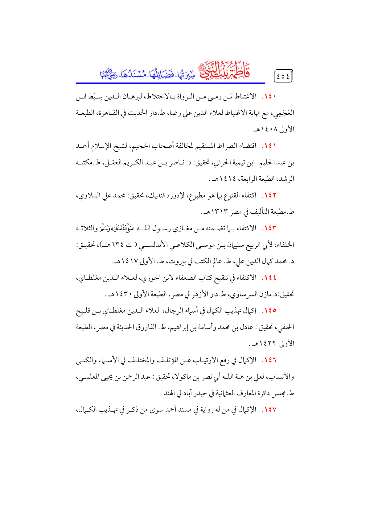 • الاكتفاء بما تضمنه من مغازي رسول الله - صلى الله عليه وسلم - والثلاثة الخلفاء، لأبي الربيع سليمان بن موسى الكلاعي الأندلسي (ت ٦٣٤ هـ)، تحقيق: ... د. محمد كمال الدين علي، ط. عالم الكتب في بيروت، ط. الأولى ١٤١٧ هـ.