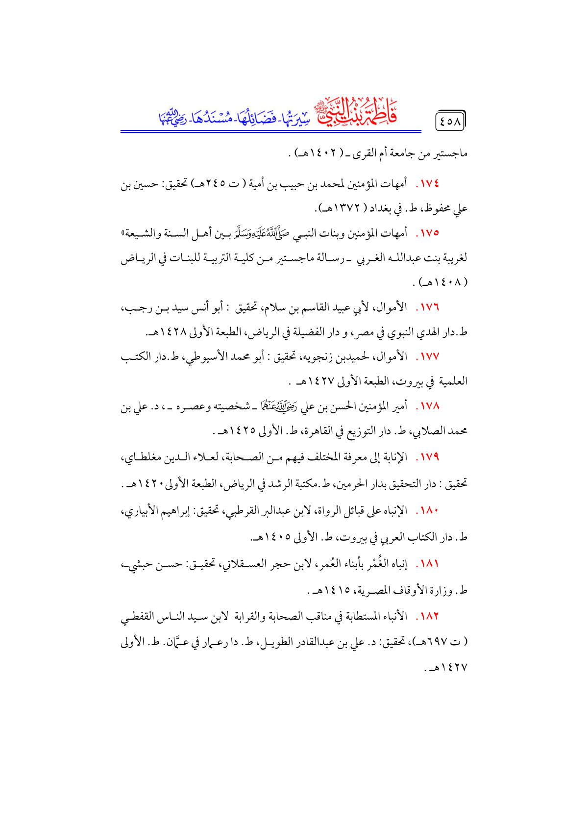 • أمهات المؤمنين وبنات النبي - صلى الله عليه وسلم - بين أهل السنة والشيعة» لغريبة بنت عبدالله الغربي ـ رسالة ماجستير من كلية التربية للبنات في الرياض ... (١٤٠٨ هـ).