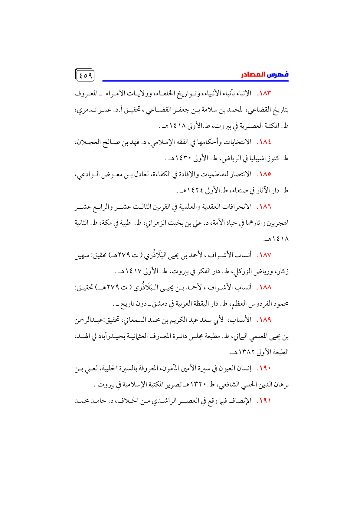 • الإنباء بأنباء الأنبياء، وتواريخ الخلفاء، وولايات الأمراء ـ المعروف بتاريخ القضاعي، لمحمد بن سلامة بن جعفر القضاعي، تحقيق أ. د. عمر تدمري، ... ط. المكتبة العصرية في بيروت، ط. الأولى ١٤١٨ هـ.