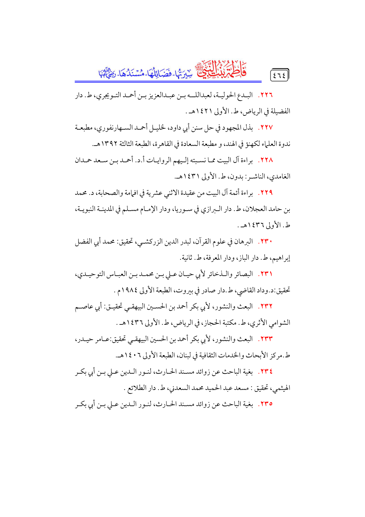 • بغية الباحث عن زوائد مسند الحارث، لنور الدين علي بن أبي بكر الهيثمي، تحقيق: مسعد عبد الحميد محمد السعدني، ط. دار الطلائع.