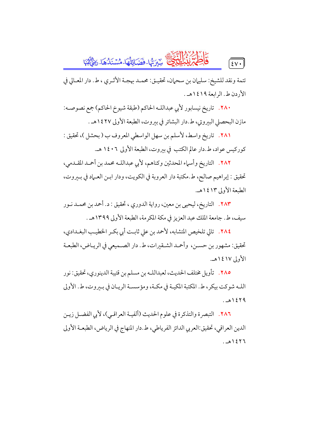 • التاريخ وأسماء المحدثين وكناهم، لأبي عبدالله محمد بن أحمد المقدمي، تحقيق: إبراهيم صالح، ط. مكتبة دار العروبة في الكويت، ودار ابن العماد في بيروت، الطبعة الأولى ١٤١٣ هـ.
