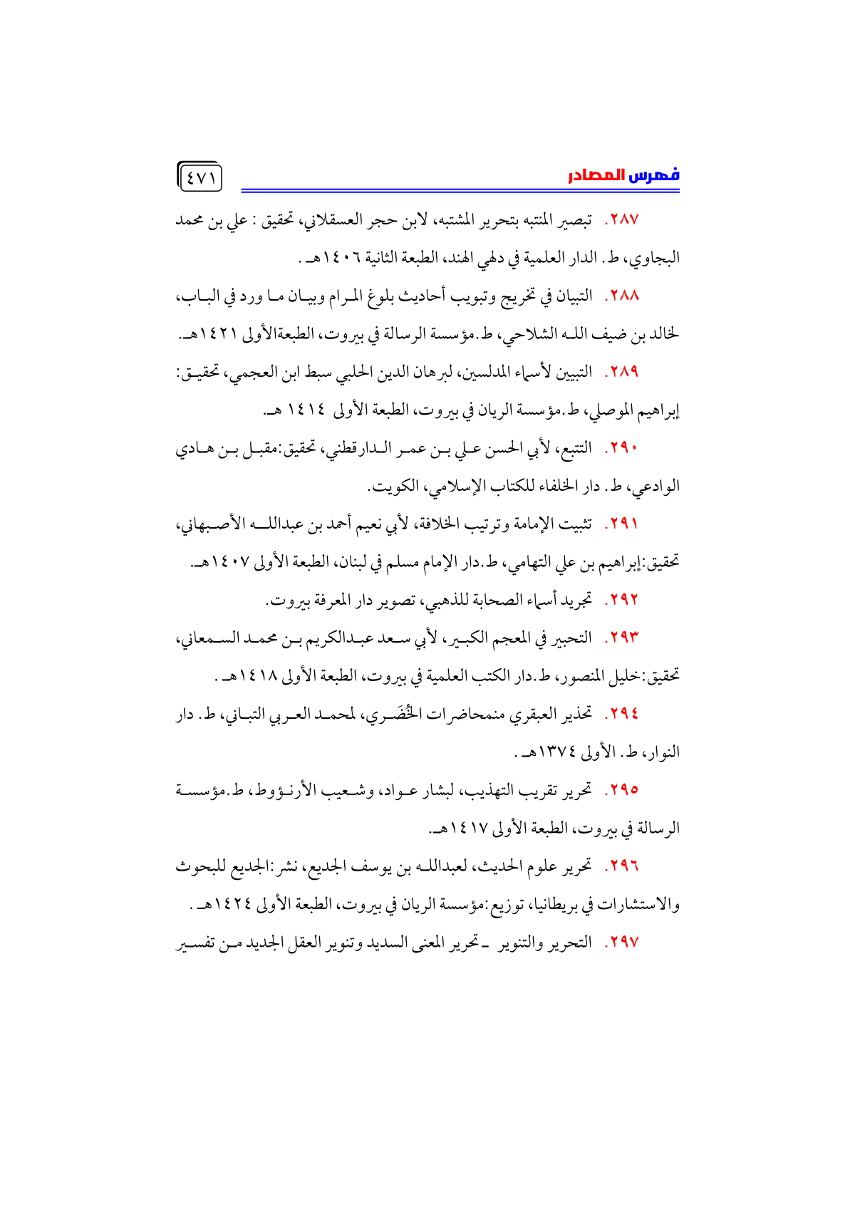 • تحرير تقريب التهذيب، لبشار عواد، وشعيب الأرنؤوط، ط. مؤسسة الرسالة في بيروت، الطبعة الأولى ١٤١٧ هـ.