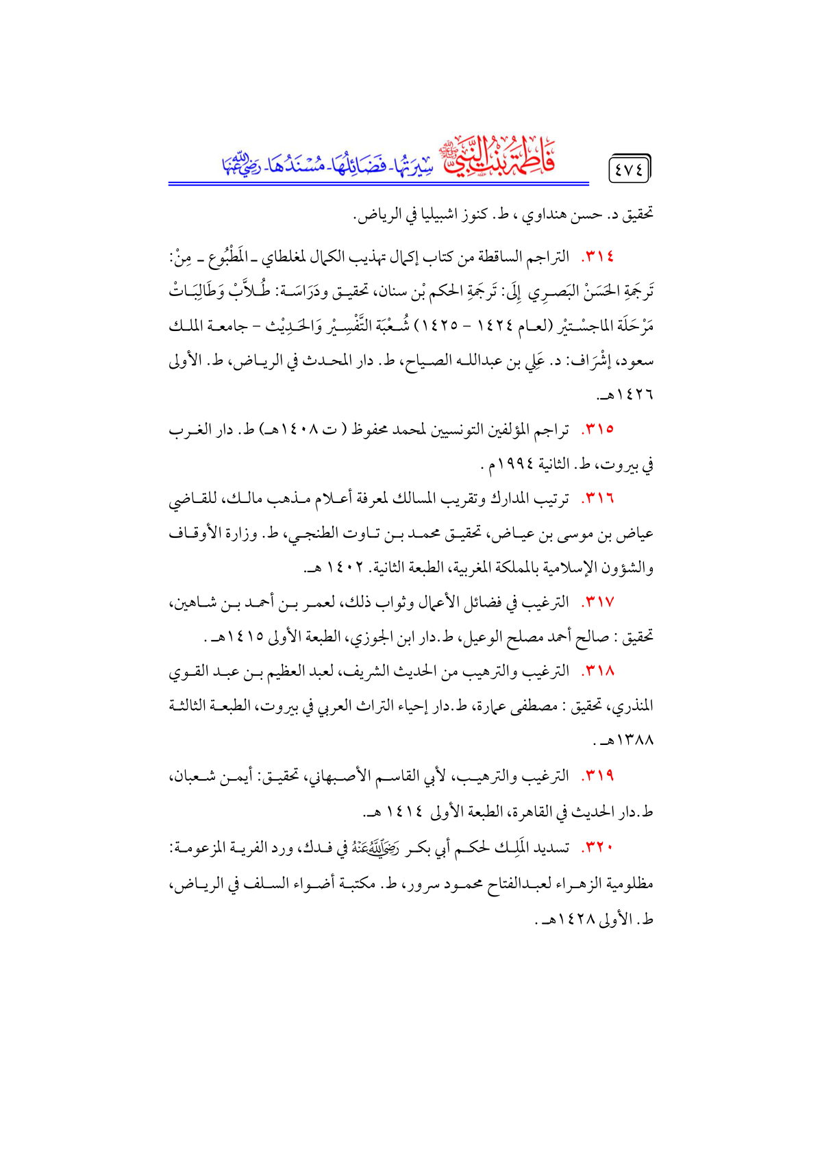 • التراجم الساقطة من كتاب إكمال تهذيب الكمال لمغلطاي ـ المَطْبُوع ـ مِنْ: تَرجَمةِ الحَسَنْ البَصرِي إِلَى: تَرجَمةِ الحكم بْن سنان، تحقيق ودَرَاسَة: طُلَاّبْ وَطَالِبَاتْ مَرْحَلَة الماجسْتيْر (لعام ١٤٢٤ - ١٤٢٥) شُعْبَة التَّفْسِيْر وَالحَدِيْث - جامعة الملك سعود، إشْرَاف: د. عَلِي بن عبدالله الصياح، ط. دار المحدث في الرياض، ط. الأولى ١٤٢٦ هـ.