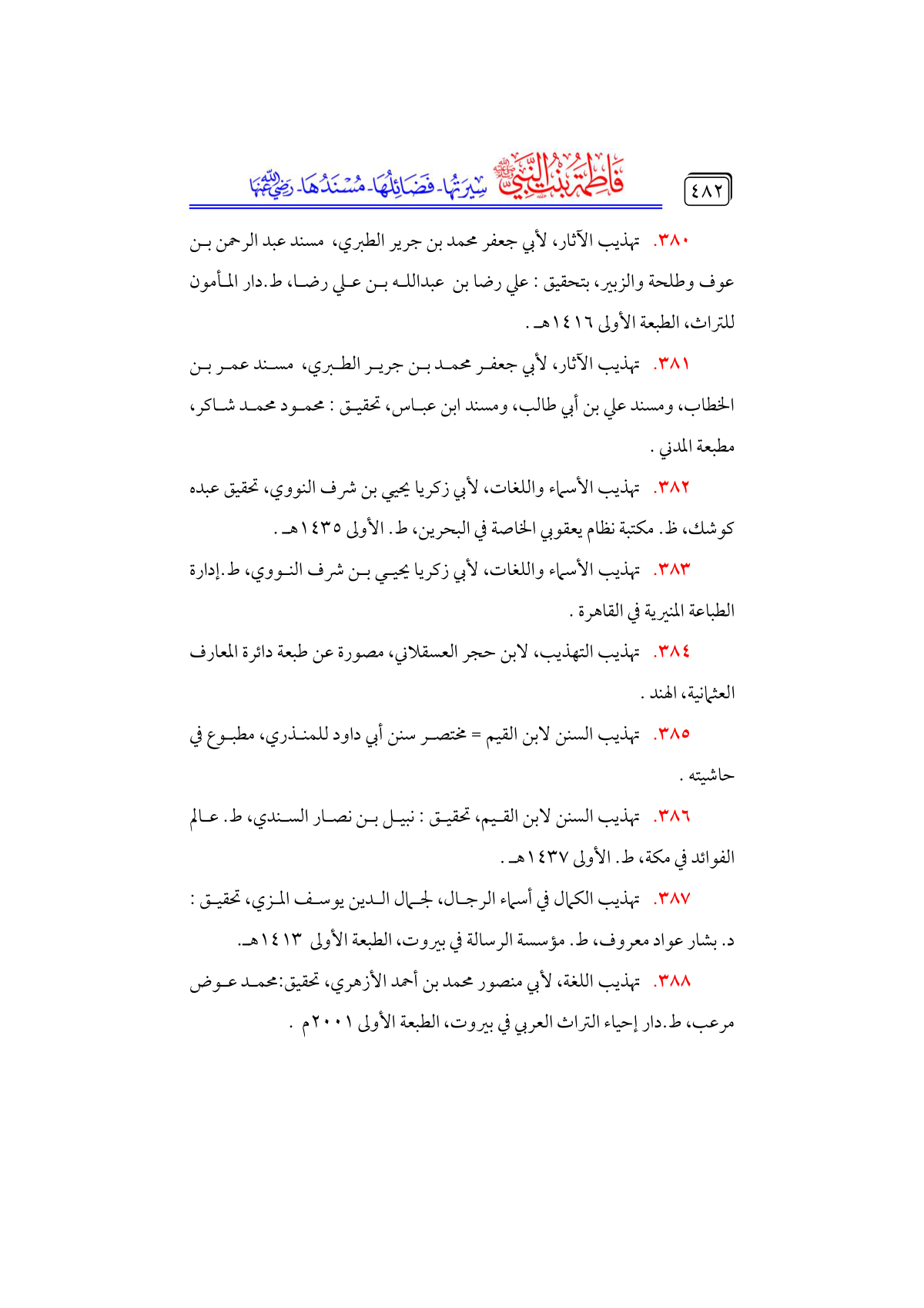 • تهذيب الأسماء واللغات، لأبي زكريا يحيي بن شرف النووي، تحقيق عبده كوشك، ظ. مكتبة نظام يعقوبي الخاصة في البحرين، ط. الأولى ١٤٣٥ هـ.